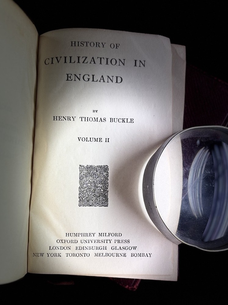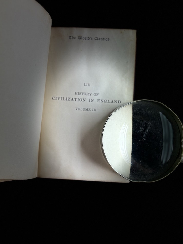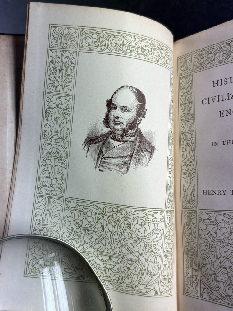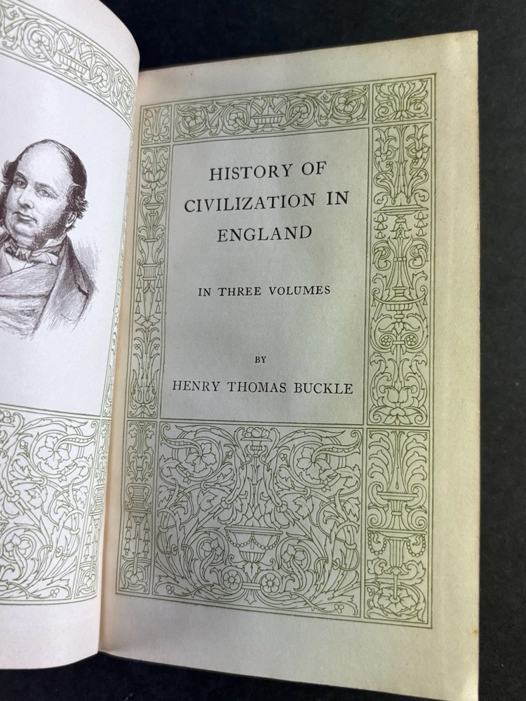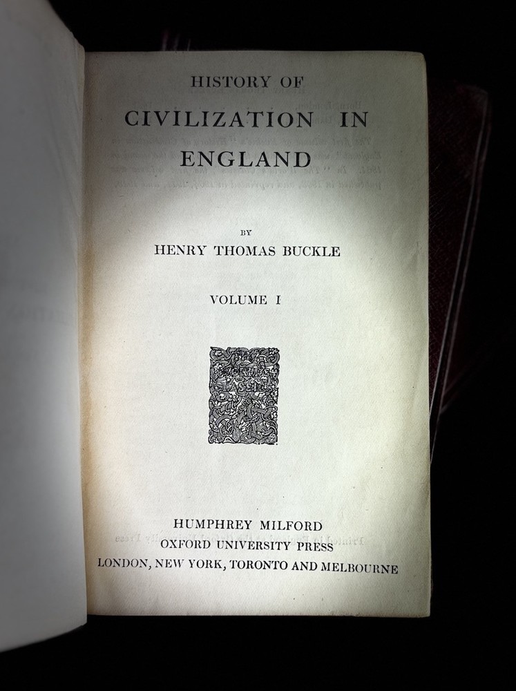 History of Civilization in England by Henry Thomas Buckle (3-Volume Lot) Publisher and Year: Humphrey Milford, Oxford University Press, Circa 1930 Summary: This lot includes the complete 3-volume set of History of Civilization in England by Henry Thomas Buckle, published as part of the World’s Classics Series. The books are bound in red leather with gilt detailing to the spines, and each volume features a sewn-in ribbon for easy reading. The bindings are secure and intact, with some chipping to the head and foot of the spines due to age and handling. Despite this, the books remain in overall good condition. The volumes contain Buckle's influential work on the development of civilization in England, focusing on its social, economic, and intellectual history. Key Features: Edition: Published as part of the World’s Classics Series. Binding: Red leather with gilt detail to spine and sewn-in ribbon. Condition: Good condition with some chipping to head and foot of spine. Content: Three volumes of Buckle's classic study on English civilization. Collection Suitability: This 3-volume set is perfect for collectors of classic historical works, particularly those focused on English history and social science. Its red leather binding and gilt detailing make it a visually appealing and durable addition to any library. Despite some wear, the secure bindings and overall good condition ensure its continued value.