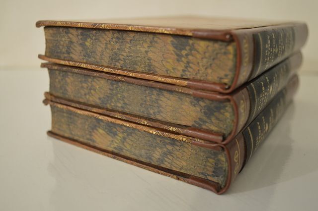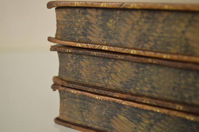 eBay template The History of Fiction Being a Critical Account of the Most Celebrated Prose Works of Fiction From the Earliest Greek Romances to the Novels of the Present Age by John Dunlop Printed by James Ballantyne and Co. for Longman, Hurst, Rees, Orme, and Brown, Paternoster-Row, and John Murray and John Ballantyne and Co.; Edinburgh, 1814. Hardcover. Complete 3 Volume Set. A Very Good, full leather binding with new leather spines, black title label with gilt lettering on spine, marbled endpapers and pastedowns as well as marbled text block edges, some discoloration and moisture stains to original leather boards, gilt dentelles, front and rear hinge reinforced with different colored marbled paper, age toning to pages, faint moisture stains to some pages of all Volumes but text is legible and not smudged and only slightly warped, short newspaper clipping affirmed to rear pastedown of Volume 3, some rubbing to board edges, few handling/scuffing to boards. A good and overall clean set. 16mo[sextodecimo or approx. 4.75 x 7.5 inches], (Vol.1) 416pp., (Vol.2) 409pp., (Vol.3) 436pp., indexed, errata in rear. We pack securely and ship daily with delivery confirmation on every book. The picture on the listing page is of the actual book for sale. Additional Scan(s) are available for any item, please inquire. 111111112003 SHIPPING: Domestic Media Mail is an additional $5.00. Domestic Priority S&H is an additional $10.00 per item. All domestic orders are moisture protected and shipped in either a well padded box or depending on price/size of book it will be cardboard sleeved & shipped in a well padded bubble envelope. The handling includes Delivery Confirmation on every domestic order which will be emailed upon processing. We always combine on shipping on multiple orders. Foreign shipments are at cost with a dollar handling. PAYMENT: Immediate payment only on this item. RETURNS: All books returnable for a full refund within 30 days after delivery for any reason. A NOTE ON GRADING: Ebay's catalog database can be faulty, please read notes section to clarify particulars on an item, if you have any questions please contact us for more information or pictures. We grade Fine, Near Fine, Very Good, Good, Fair. Any faults are always noted including remainder marks, price clipped dust jackets, and previous owner markings. If not noted then they do not exist on this book. © 1998 - 2023 Lavendier Books. All rights reserved.