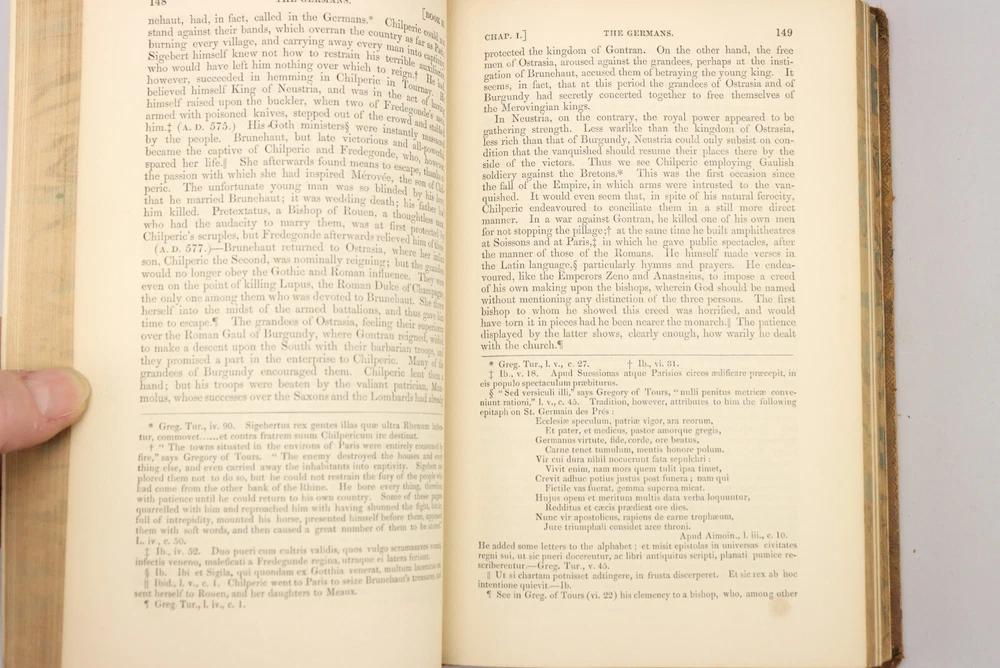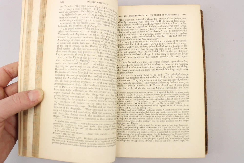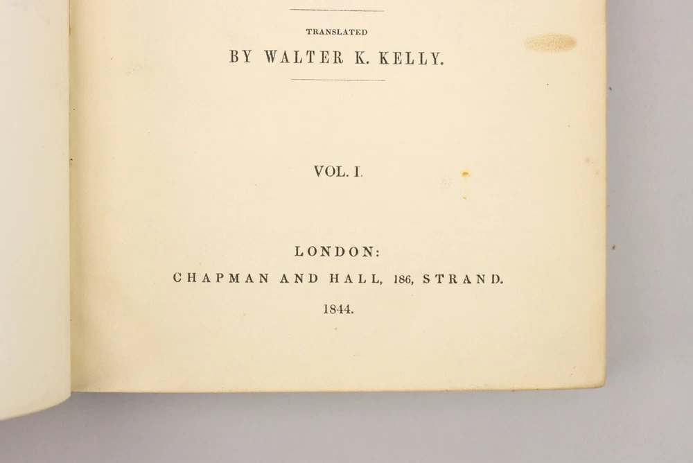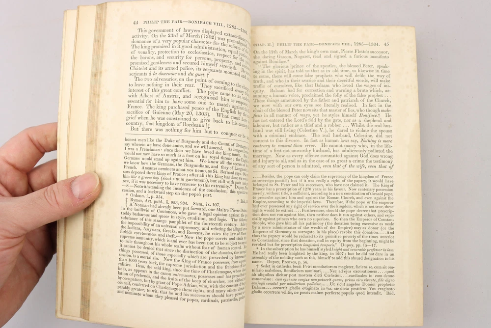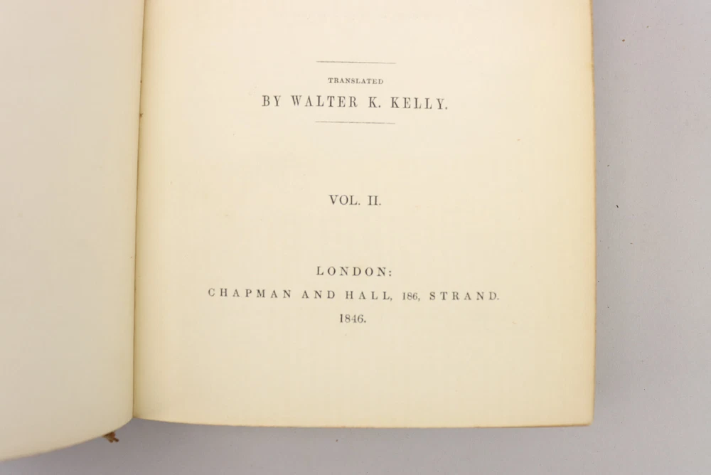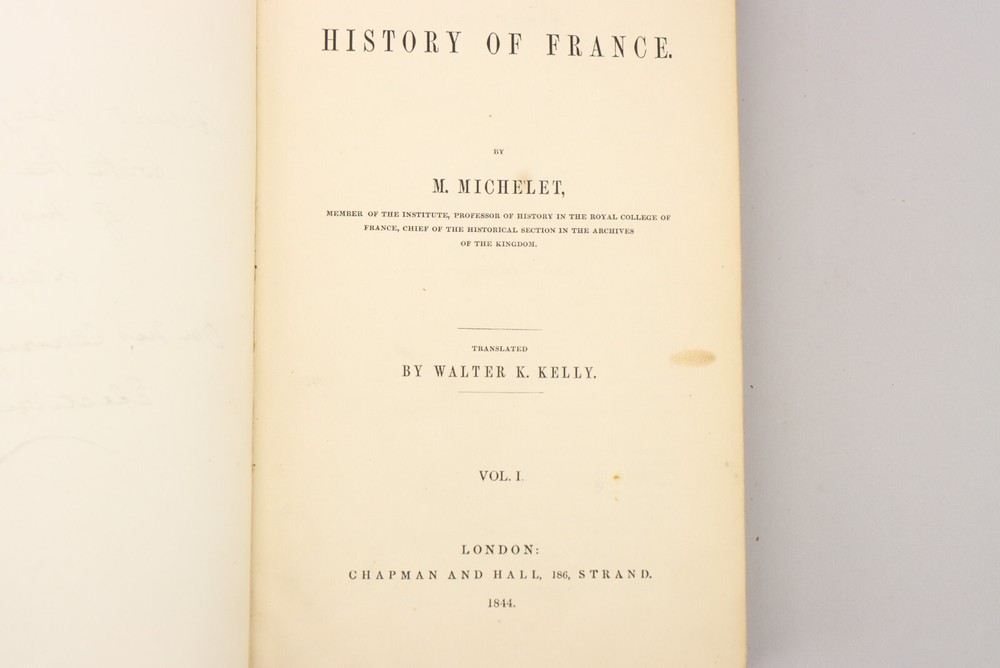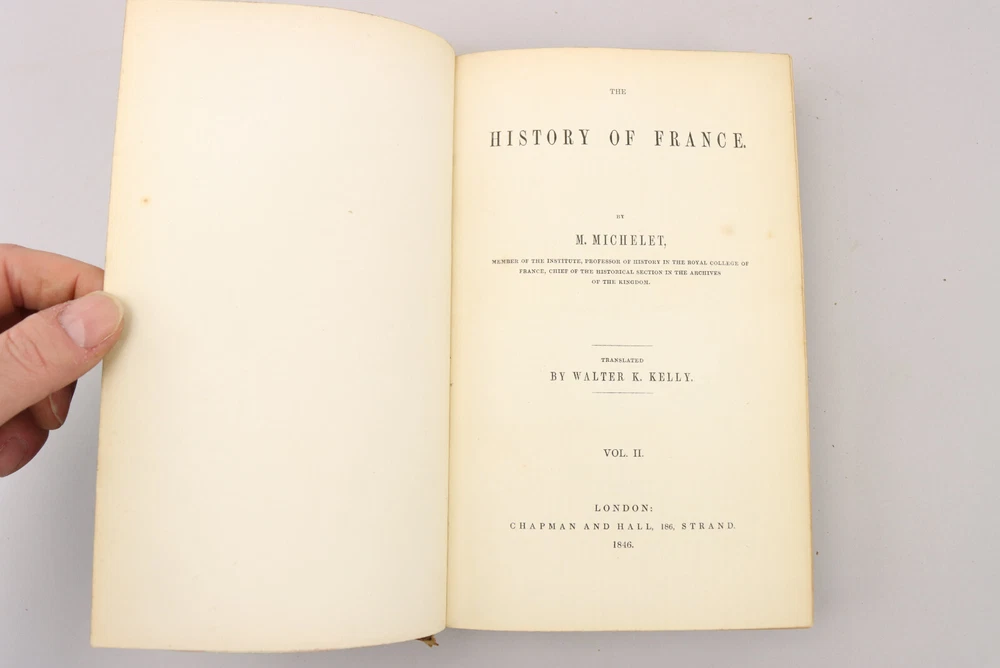 This is copies of the scarce early leatherbound English editions of History of France Vol. I and II by Jules Michelet (trans. by Walter Keating Kelly). The two volumes were published by Chapman and Hall of London in 1844 and 1846, respectively. They contain a history of France from the Celts, Iberians, and Romans, through the time of the French Pope and the insanity of Charles VI, to the Reform and pacification of France. The author, French historian Jules Michelet, is considered a founder of modern historiography. Vol. I has a loose cover and writing on one page, while Vol. II has no writing or loose pages. Please see our photos for more details, and feel free to ask any questions you may have before making your purchase.