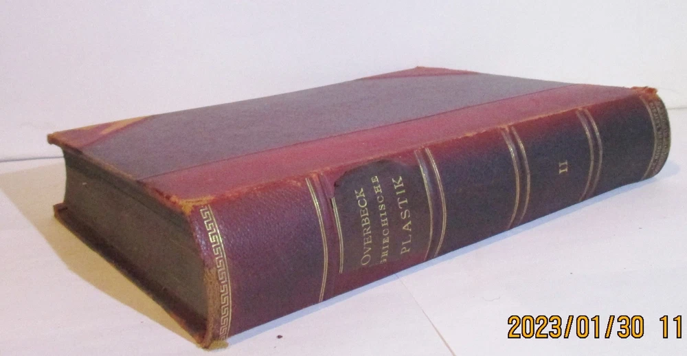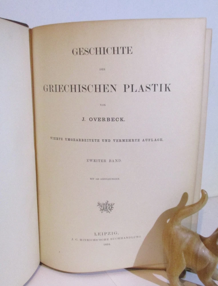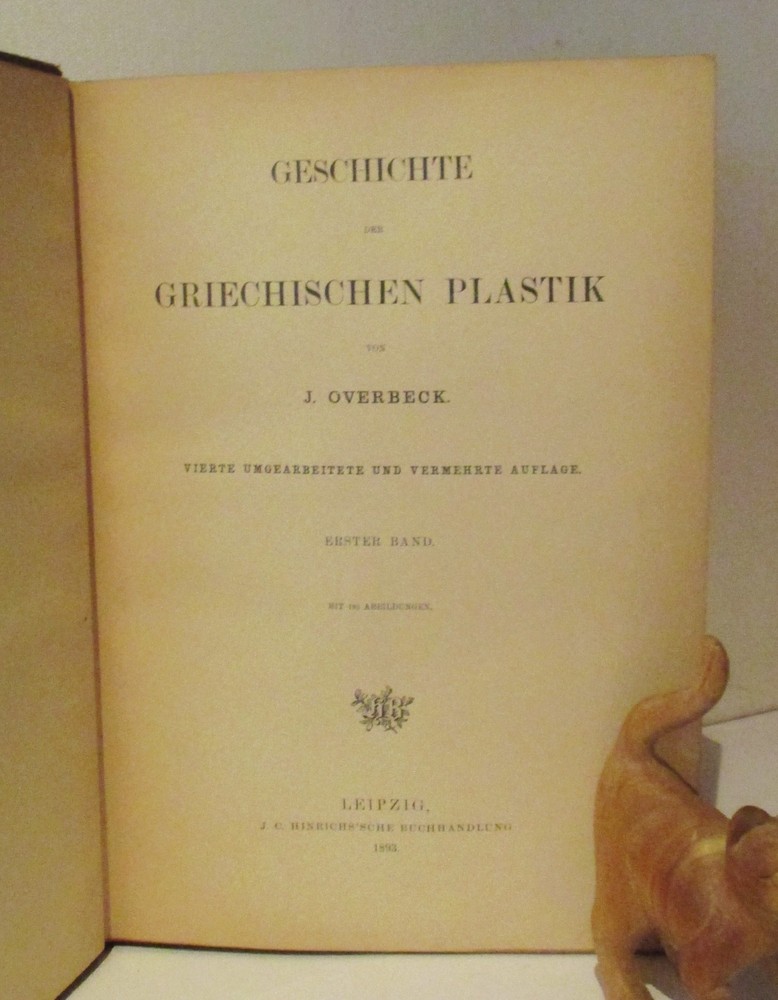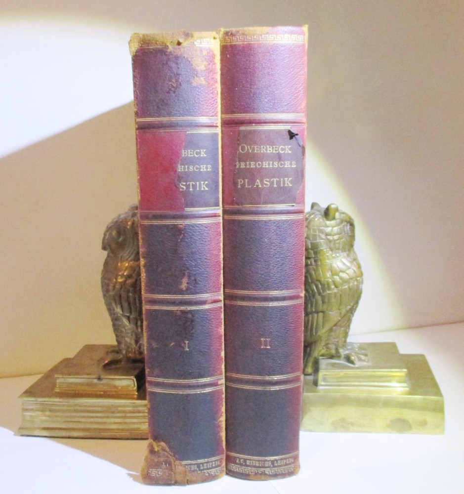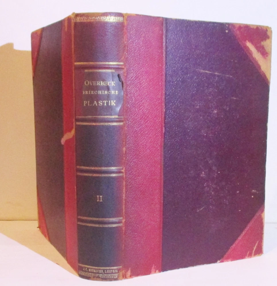 Geschichte Der Griechischen Plastik / History of Greek Sculpture Vierte Umgearbeitete Und Vermehrte Auflage / Fourth Revised and Enlarged Edition Erster & Zweiter Band / Volumes 1 & 2 Written by J. Overbeck Published by J.C. Hinrichs'sche Buchhandlkung, 1894. Vol 1: 565pps; Vol 2: 570pps. Index These half-leather bound volumes have marbled end papers and marbled page edges, and they are spine lettered. The text is German. CONDITION: The volumes are in almost comparable condition. The age-toned pages are clean and unmarked with an occasional crease or chip on a page edge. There are no major rips or tears or loose pages. The text block is solid and the text is complete. The boards are rubbed, chipped and frayed. The corners and edges are free of dings and bruises, but they are worn. Both volumes have identical book plates affixed to the reverse of the front cover and a previous owners name hand written on the first free page. Volume I has a tear on the lower front hinge. The spine cover is creased, scuffed and worn and the text block is visible. Together, this set weighs 8 pounds, 5 ounces. They measure approx. 10-1/4" x 7-1/2" X 3-1/2" USPS Media Shipping or Priority Shipping in the USA. Most items ship within 24 hours of payment. Listing and template services provided by inkFrog