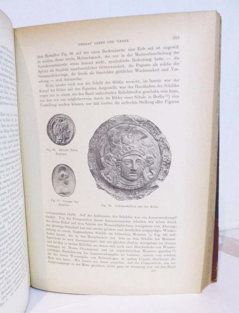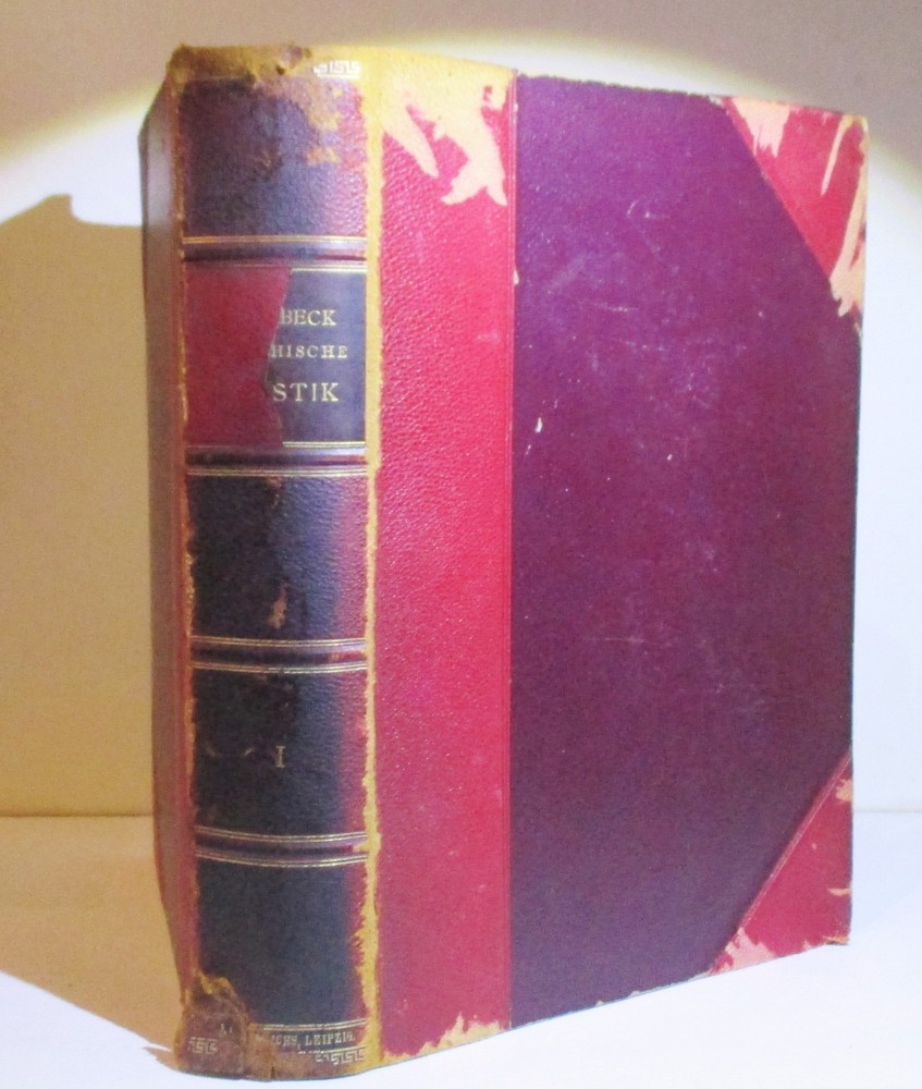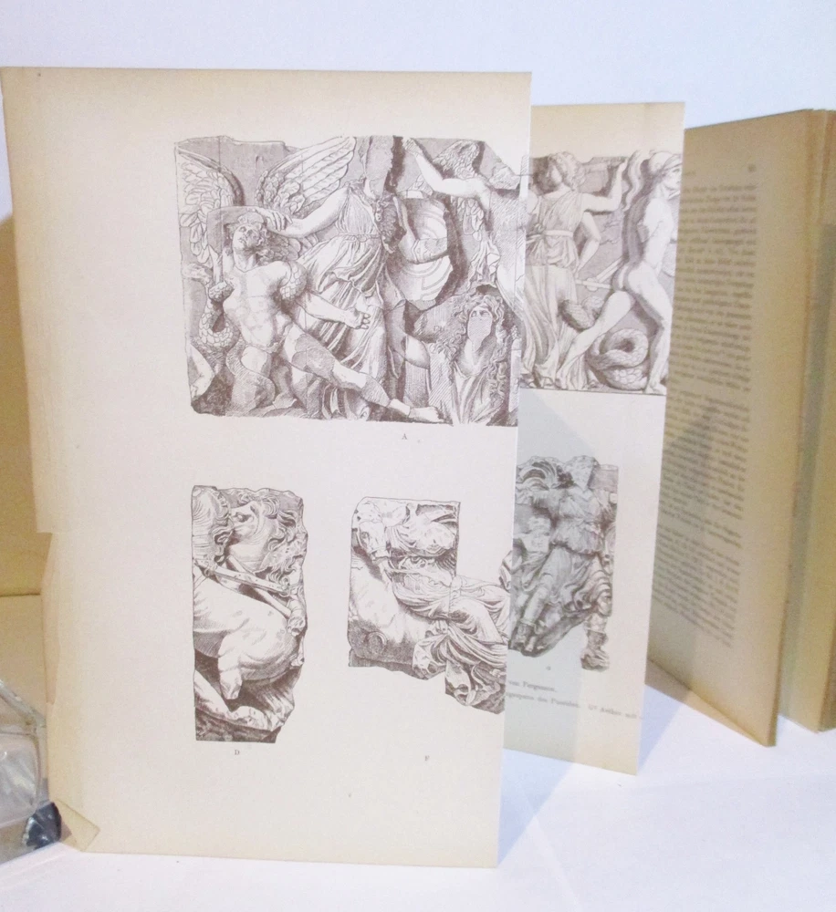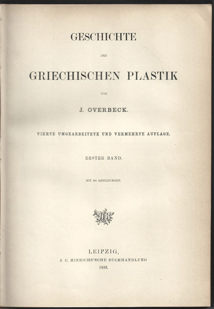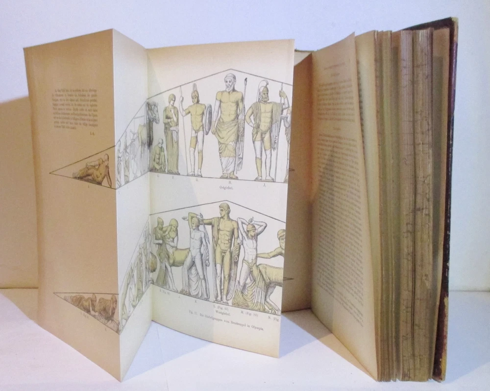 Geschichte Der Griechischen Plastik / History of Greek Sculpture Vierte Umgearbeitete Und Vermehrte Auflage / Fourth Revised and Enlarged Edition Erster & Zweiter Band / Volumes 1 & 2 Written by J. Overbeck Published by J.C. Hinrichs'sche Buchhandlkung, 1894. Vol 1: 565pps; Vol 2: 570pps. Index These half-leather bound volumes have marbled end papers and marbled page edges, and they are spine lettered. The text is German. CONDITION: The volumes are in almost comparable condition. The age-toned pages are clean and unmarked with an occasional crease or chip on a page edge. There are no major rips or tears or loose pages. The text block is solid and the text is complete. The boards are rubbed, chipped and frayed. The corners and edges are free of dings and bruises, but they are worn. Both volumes have identical book plates affixed to the reverse of the front cover and a previous owners name hand written on the first free page. Volume I has a tear on the lower front hinge. The spine cover is creased, scuffed and worn and the text block is visible. Together, this set weighs 8 pounds, 5 ounces. They measure approx. 10-1/4" x 7-1/2" X 3-1/2" USPS Media Shipping or Priority Shipping in the USA. Most items ship within 24 hours of payment. Listing and template services provided by inkFrog