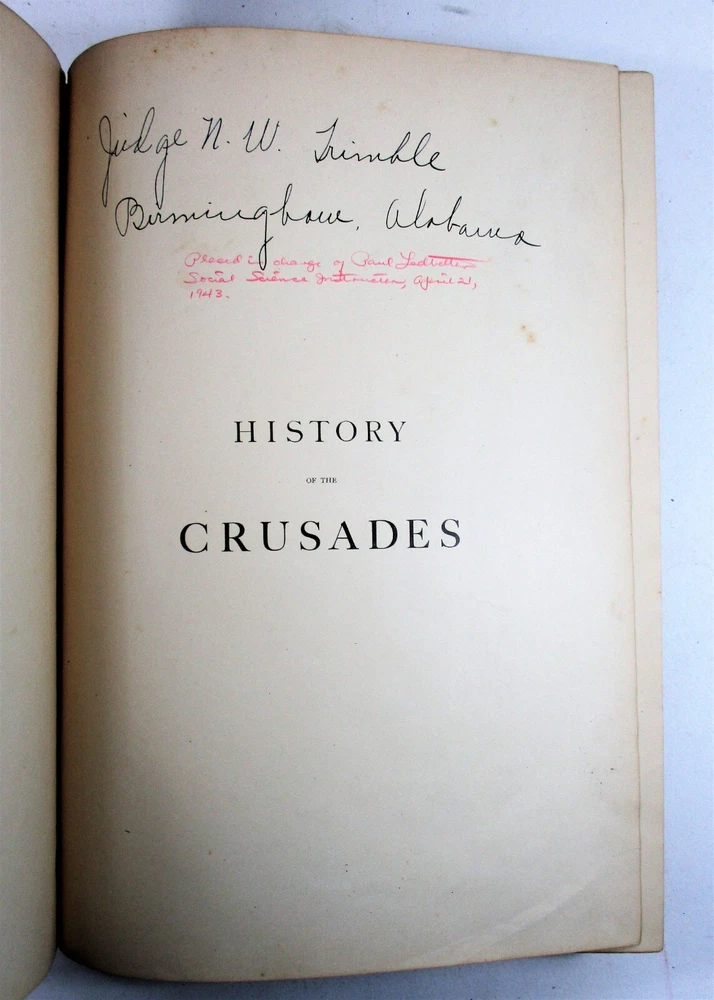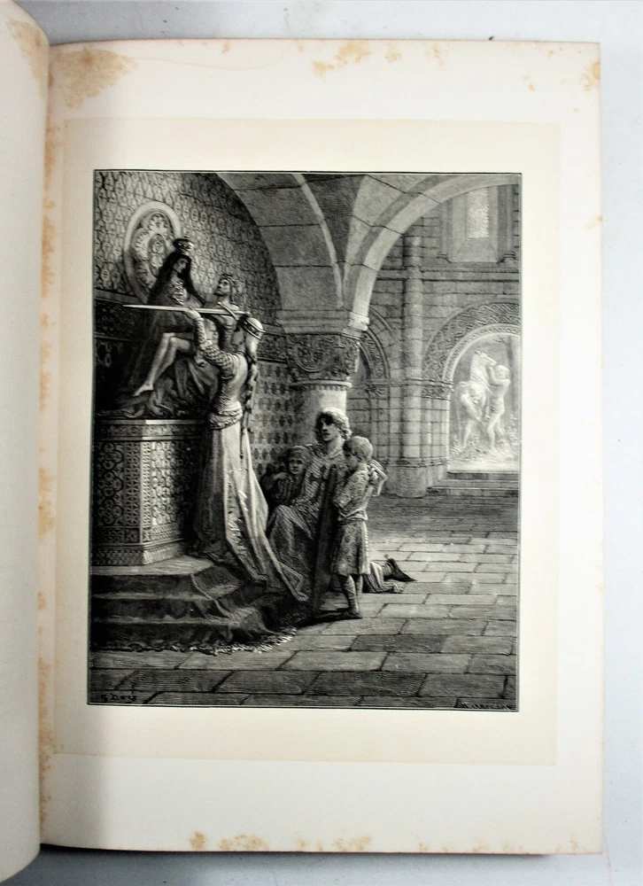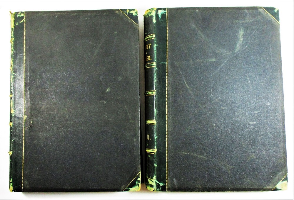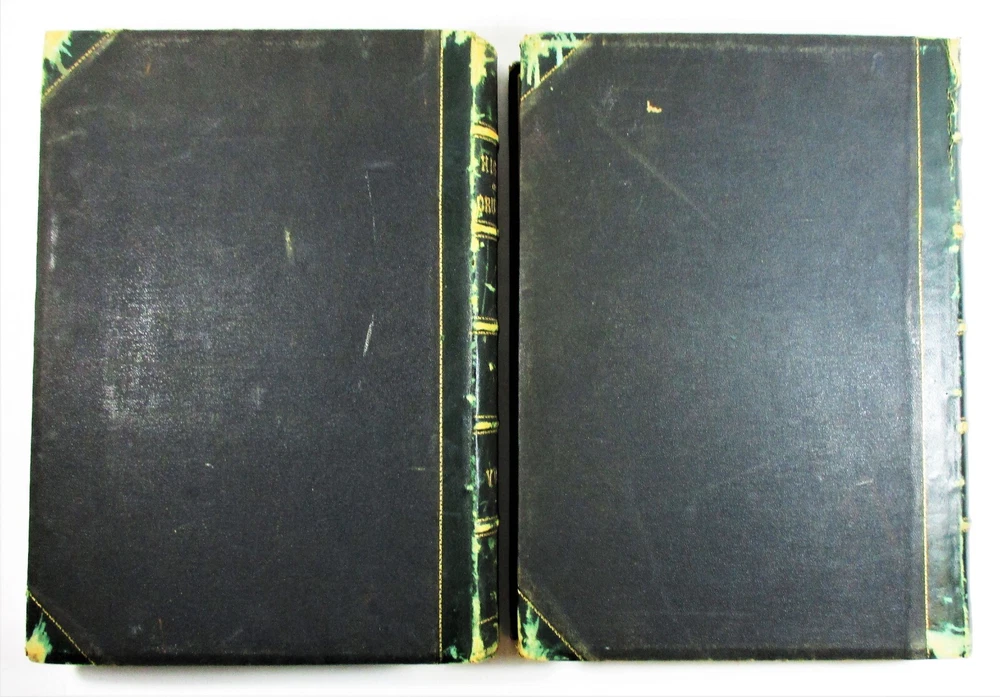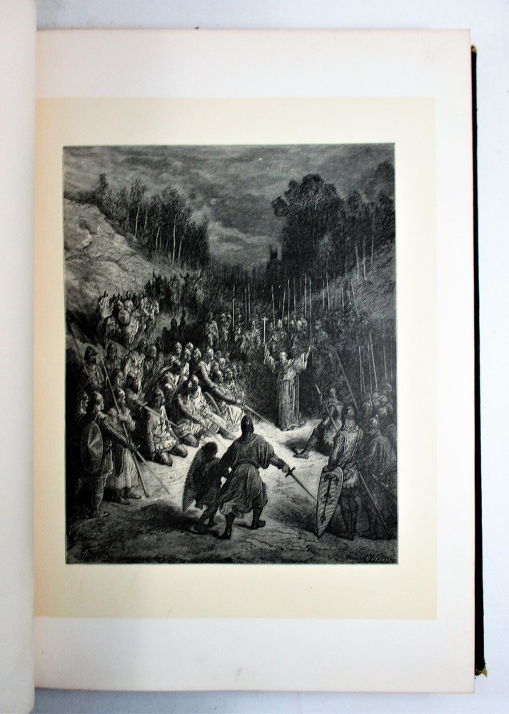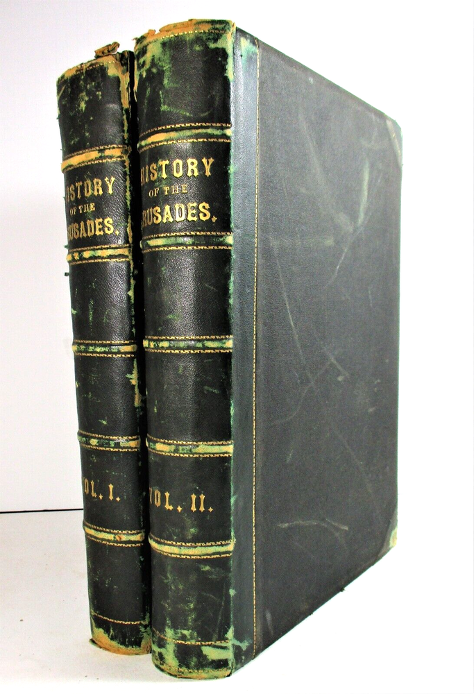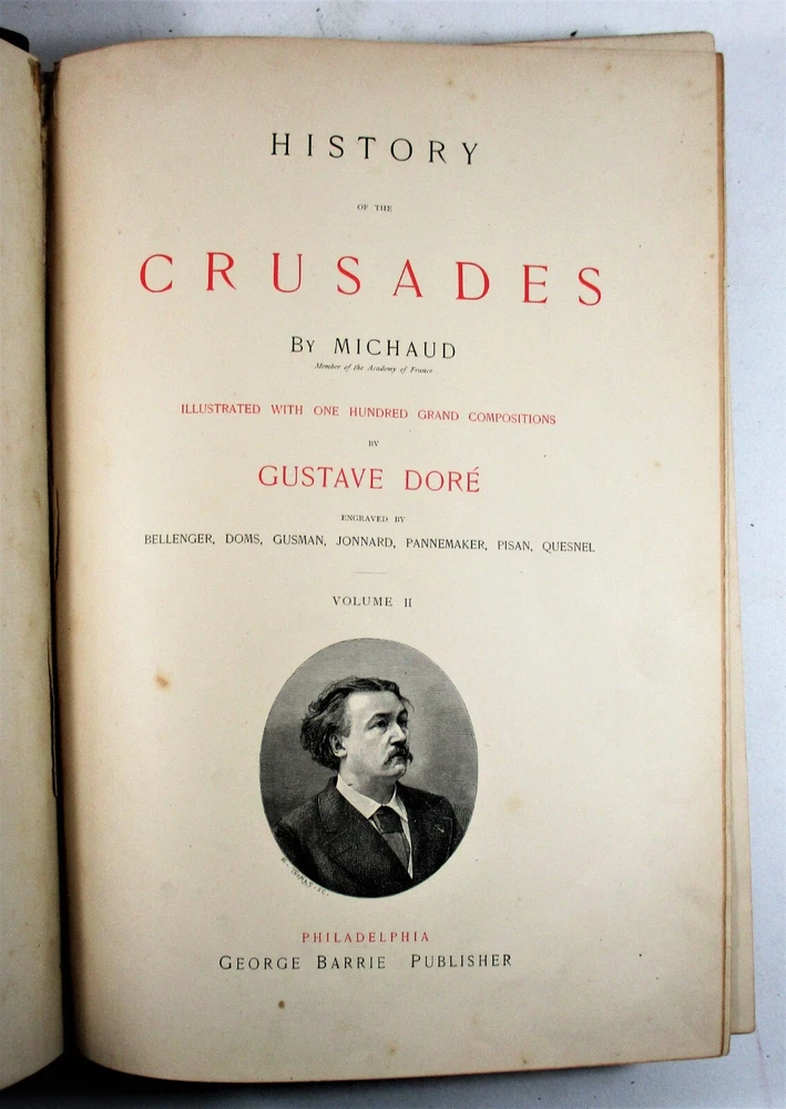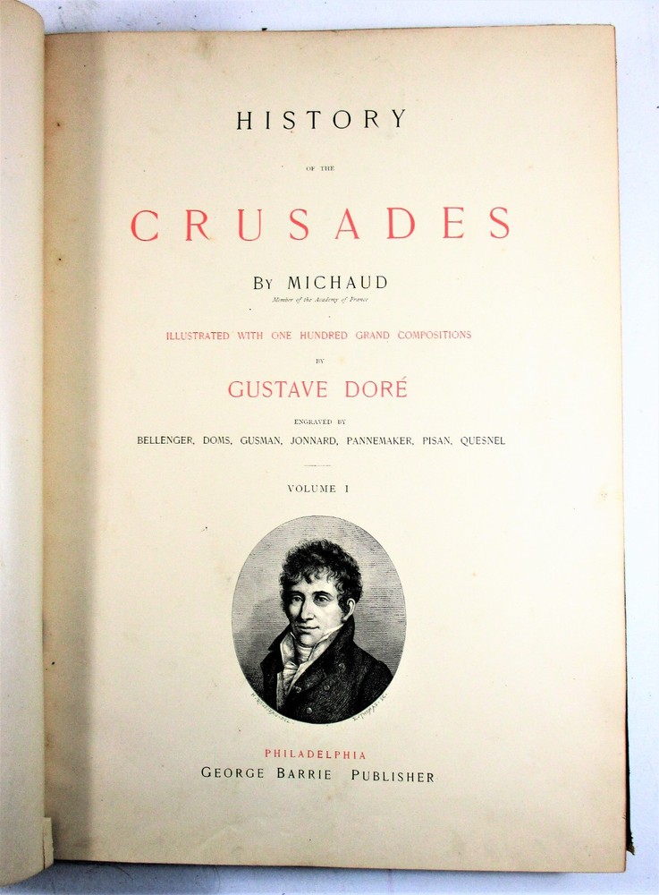 For sale is a Very Good condition quarter-bound leather hardcover 2 volume set of History of the Crusades by Joseph-François Michaud. Illustrated in black and white by famous illustrator Gustave Doré. Undated, published circa 1880 by George Barrie Publisher in Philadelphia, PA. Condition specifics of each volumes are as follows: Volume I: Very Good condition. Binding is sound and pages are unmarked, with the exception of green strips along gutters of endpaper (which may or may not be reparative bookbinder's tape), a small bookbinder's sticker affixed to head fore edge corner of first pastedown endpaper, visible binding along interior gutter of first blank pages, previous owner's name and location on first blank page, and two chips and two closed tears to gutter of first blank page. Boards are clean and square, with the exception of scuffing to corners, hinges, and spine bands, chipping to head spine end, and minor shelf wear. Volume II: Very Good condition. Binding is sound and pages are unmarked, with the exception of green strips along gutters of endpaper (which may or may not be reparative bookbinder's tape), a small bookbinder's sticker affixed to head fore edge corner of first pastedown endpaper, first blank page missing, visible binding along interior gutter of "Index of Engravings", small bit of tape reinforcement along head gutter of half-title page, and previous owner's name, location, and inscription to half-title page. Boards are clean and square, with the exception of scuffing to corners, hinges, spine bands, and tail fore edges, minor closed tears to head spine end, and minor shelf wear. Please see photos for condition detail. L-347