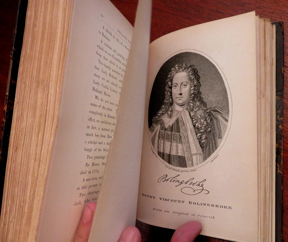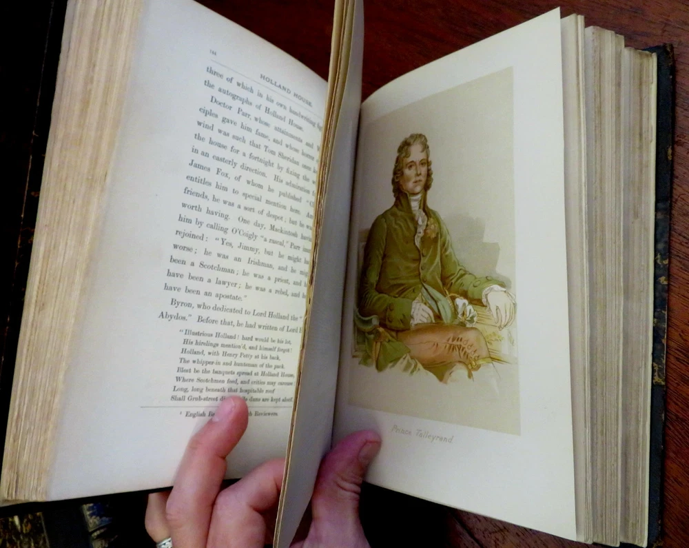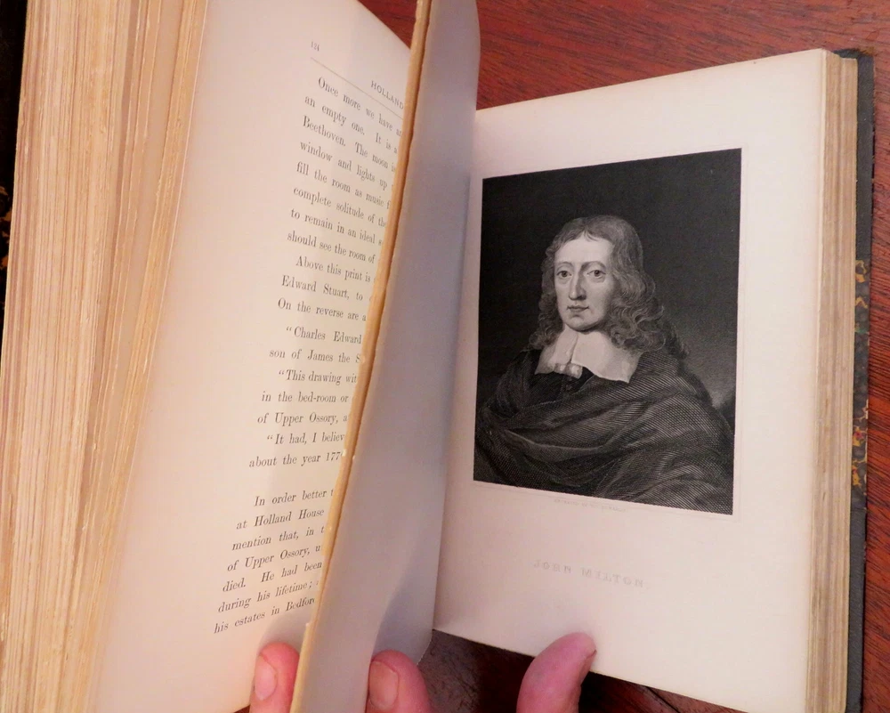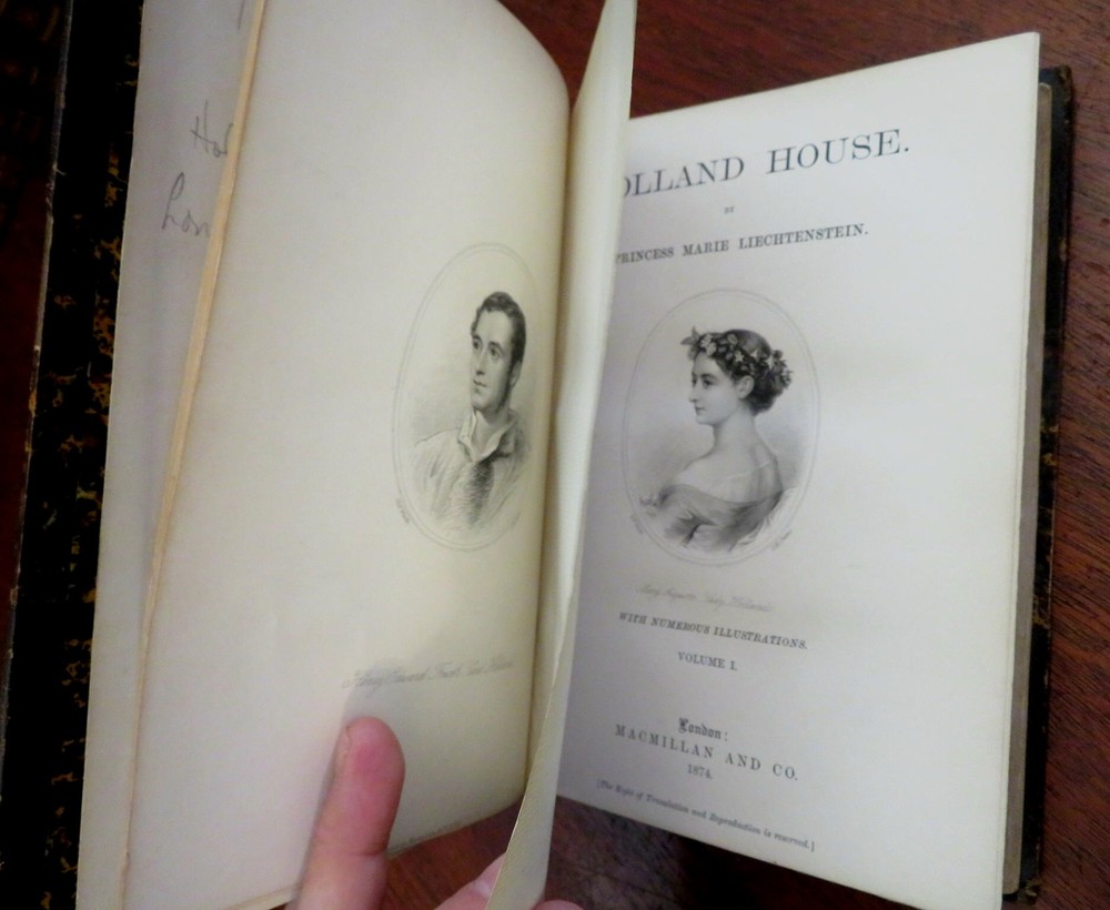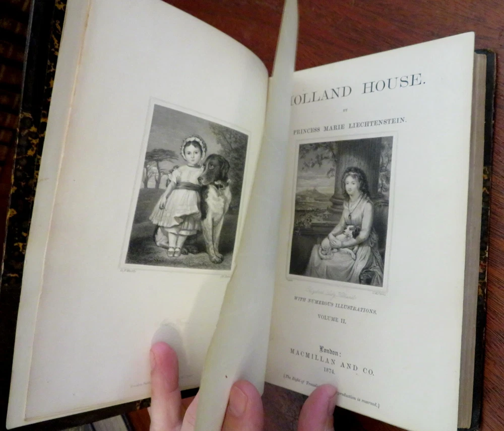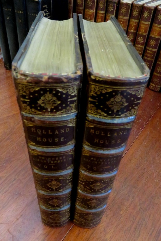 Holland House 1874 Extra-illustrated w/ 97 plates Tout leather 2 v. set Holland House 1874 Extra-illustrated w/ 97 plates Tout leather 2 v. set (Old Books, 19th Century Books, Leather Books, Decorative Leather Sets, Illustrated Books, Portraits). Holland House, by Princess Marie Liechtenstein. Published 1874, London by MacMillan and Co. 2 volumes. 289, 255 pages. Text in English. Profusely illustrated throughout. EXTRA-ILLUSTRATED w/ 97 extra plates inserted by the binder- most engraved, several color lithographed. Mostly portraits of prominent historical people. Attractive antiquarian 1/2 leather bindings [stamped by TOUT], raised & gilt bands, gilt title lettering & compartment decorations, marbled covers. Set is physically old and shows some signs of handling and time. Bindings gently age worn but still appealing, leather and joints scuffed with surface cracking but still supple, front covers slightly weakened, set remains overall very attractive as an object. A profusion of plates throughout, many of historical interest and value independent of the books they've been bound into. Set was "grangerized" by an early owner which was the fashion at the time. Text block paper is gently age toned as typical, internally set remains mostly clean, tight and sound. A set which has been taken care of but may/ does not look like new. Still attractive on the shelf. Set displays a pleasing and unique age patina and is in rather nice antiquarian condition, any age flaws seem easy to overlook or forgive. Please review photos for more detailed attempt to present this nice set as it survives. We often over-describe any flaws that many sellers would not even bother to mention since most people would overlook them as minor and unworthy of comment. Many people tell us the books they receive from us are nicer in person than they appears on the screen. We want you to be clear about what you are buying, so we take numerous photos and try to describe it openly and honestly. Books Measure c. 9" H x 6 1/2" W. [B7759].