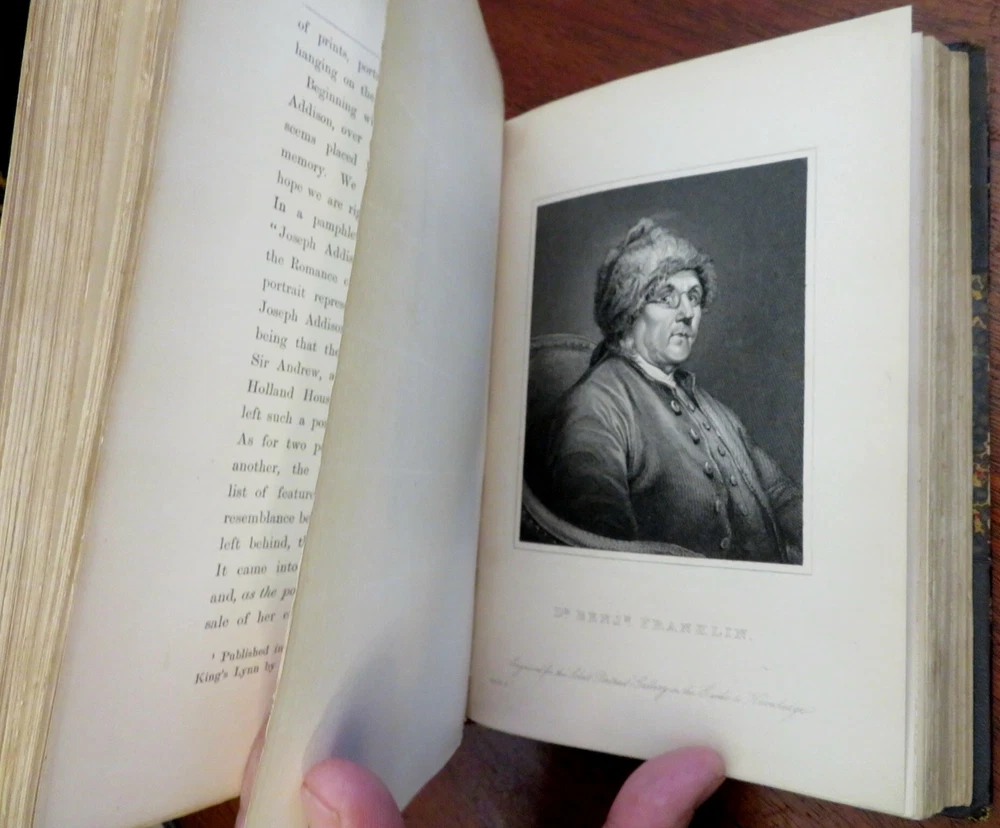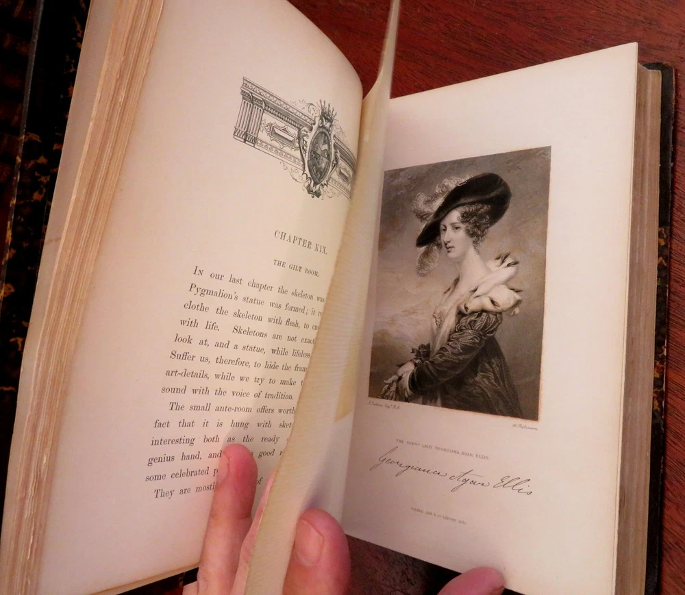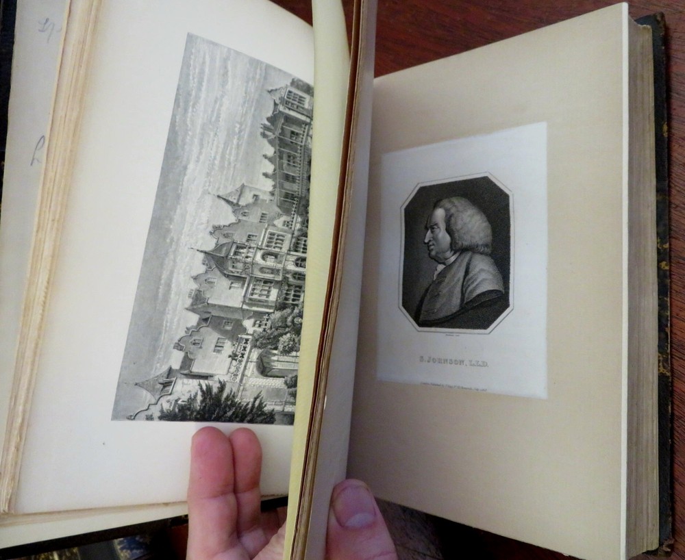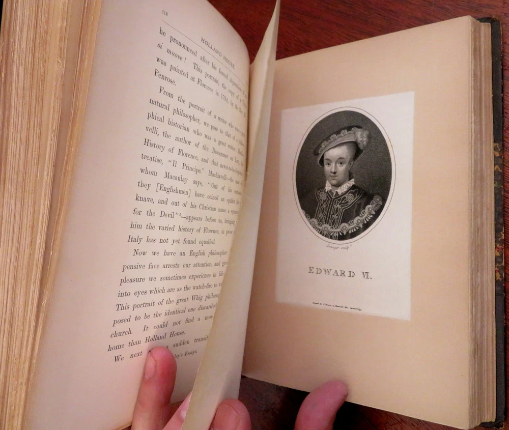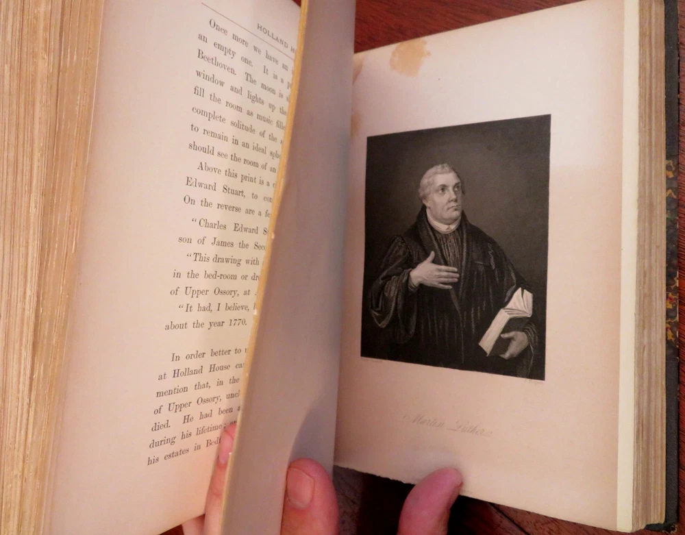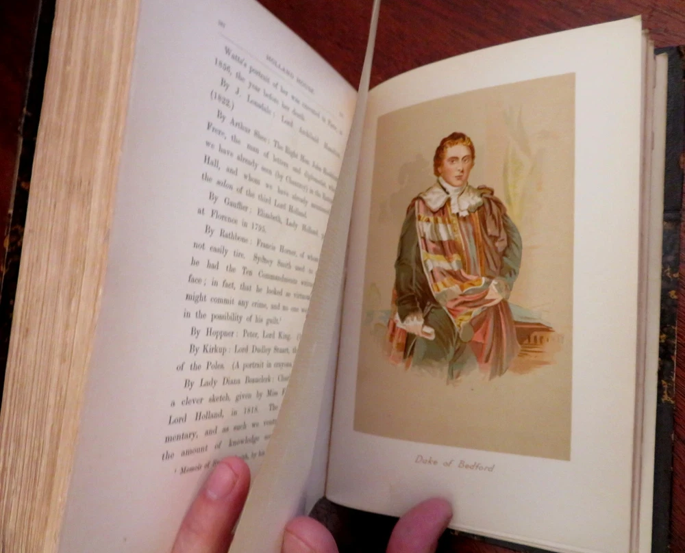 Holland House 1874 Extra-illustrated w/ 97 plates Tout leather 2 v. set Holland House 1874 Extra-illustrated w/ 97 plates Tout leather 2 v. set (Old Books, 19th Century Books, Leather Books, Decorative Leather Sets, Illustrated Books, Portraits). Holland House, by Princess Marie Liechtenstein. Published 1874, London by MacMillan and Co. 2 volumes. 289, 255 pages. Text in English. Profusely illustrated throughout. EXTRA-ILLUSTRATED w/ 97 extra plates inserted by the binder- most engraved, several color lithographed. Mostly portraits of prominent historical people. Attractive antiquarian 1/2 leather bindings [stamped by TOUT], raised & gilt bands, gilt title lettering & compartment decorations, marbled covers. Set is physically old and shows some signs of handling and time. Bindings gently age worn but still appealing, leather and joints scuffed with surface cracking but still supple, front covers slightly weakened, set remains overall very attractive as an object. A profusion of plates throughout, many of historical interest and value independent of the books they've been bound into. Set was "grangerized" by an early owner which was the fashion at the time. Text block paper is gently age toned as typical, internally set remains mostly clean, tight and sound. A set which has been taken care of but may/ does not look like new. Still attractive on the shelf. Set displays a pleasing and unique age patina and is in rather nice antiquarian condition, any age flaws seem easy to overlook or forgive. Please review photos for more detailed attempt to present this nice set as it survives. We often over-describe any flaws that many sellers would not even bother to mention since most people would overlook them as minor and unworthy of comment. Many people tell us the books they receive from us are nicer in person than they appears on the screen. We want you to be clear about what you are buying, so we take numerous photos and try to describe it openly and honestly. Books Measure c. 9" H x 6 1/2" W. [B7759].