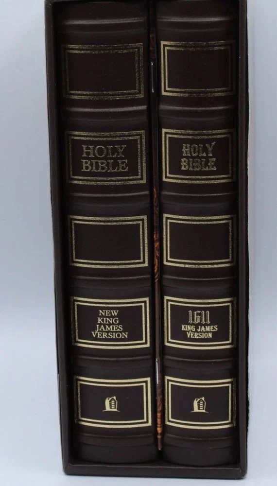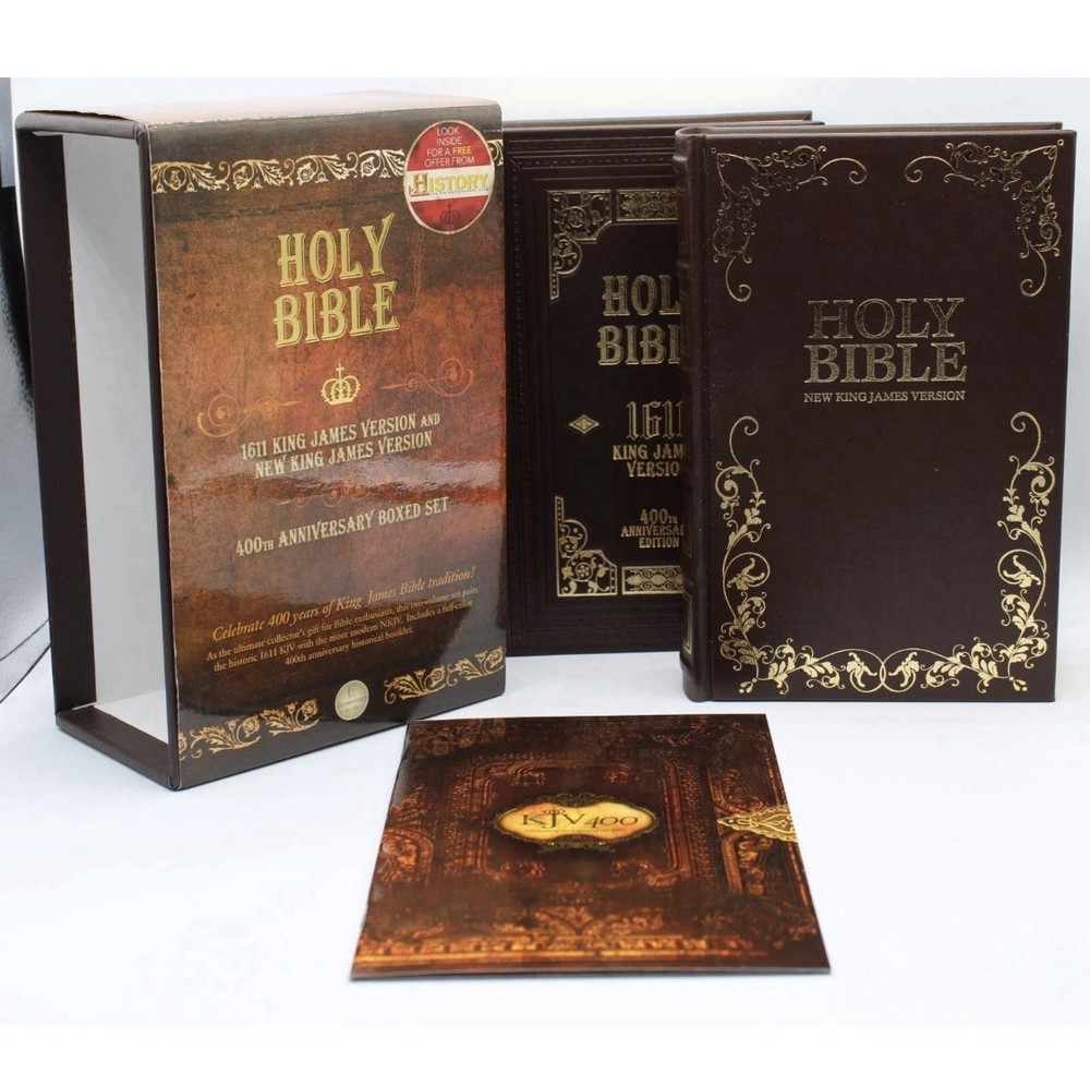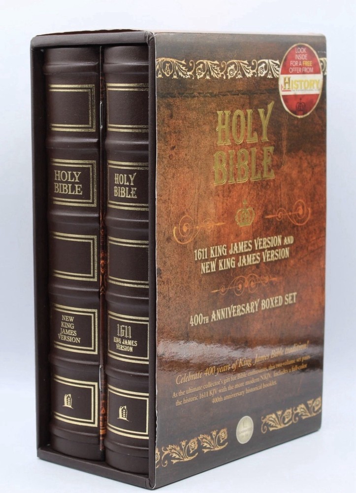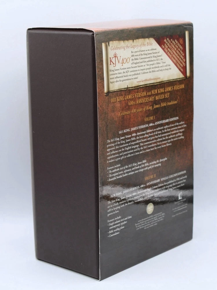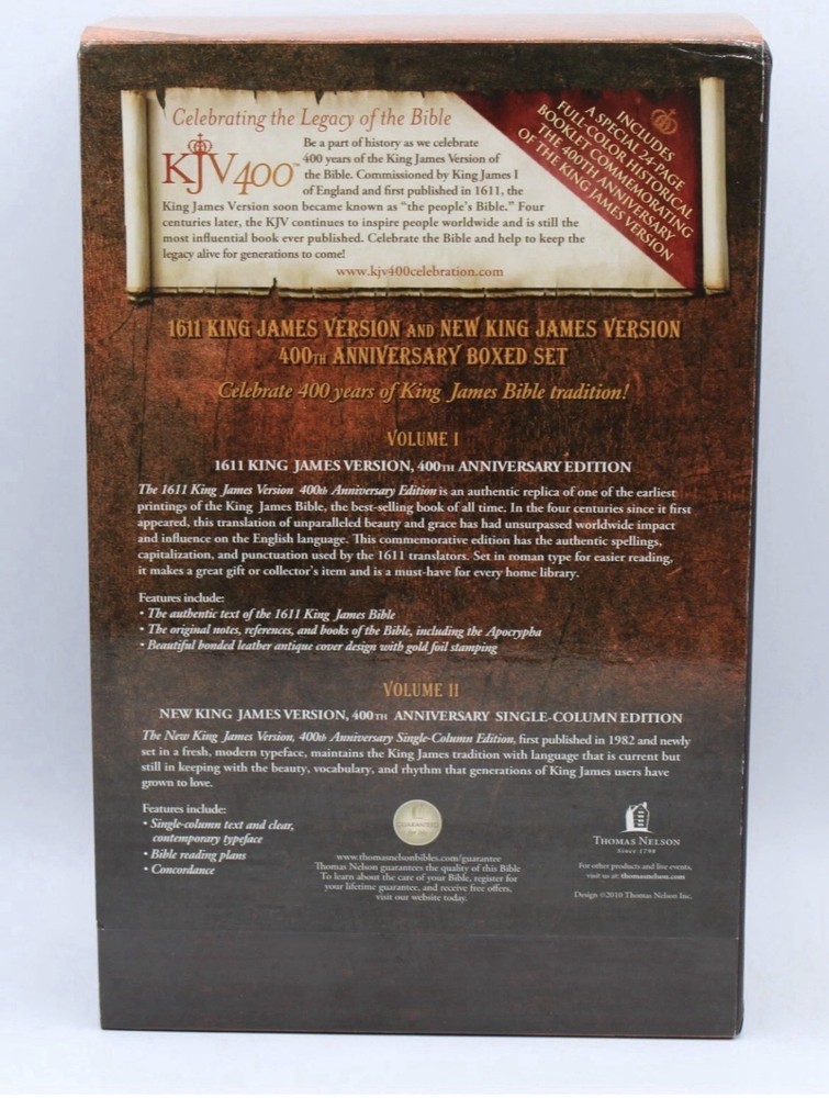 Celebrate the 400th anniversary of t he King James Version with this exquisite Holy Bible boxed set. The set includes both the original KJV 1611 text and the modern Nkjv translation, bound in high-quality bonded leather for durability and elegance. Published by Thomas Nelson, renowned for their exceptional biblical literature, these editions are a testament to their commitment to faithfulness and readability. The slipcase design protects two books that span the richness of English biblical tradition, from the Geneva Bible to the King James Version. . Immerse yourself in the beauty of multiple translations and delve into the heart of religious text with this invaluable set. Beautiful Set