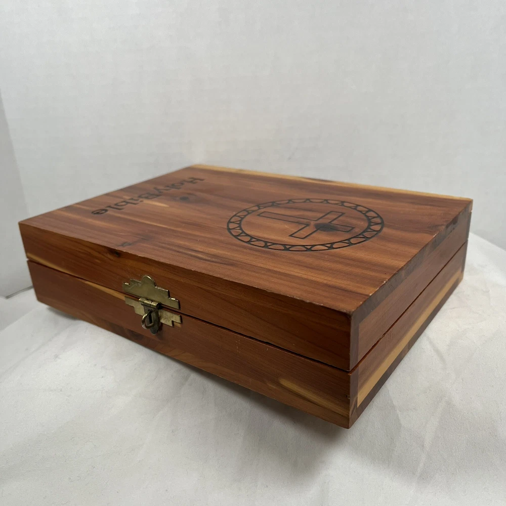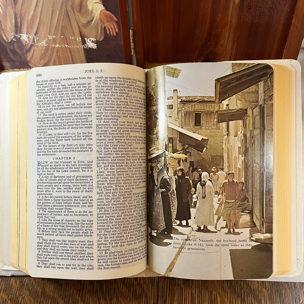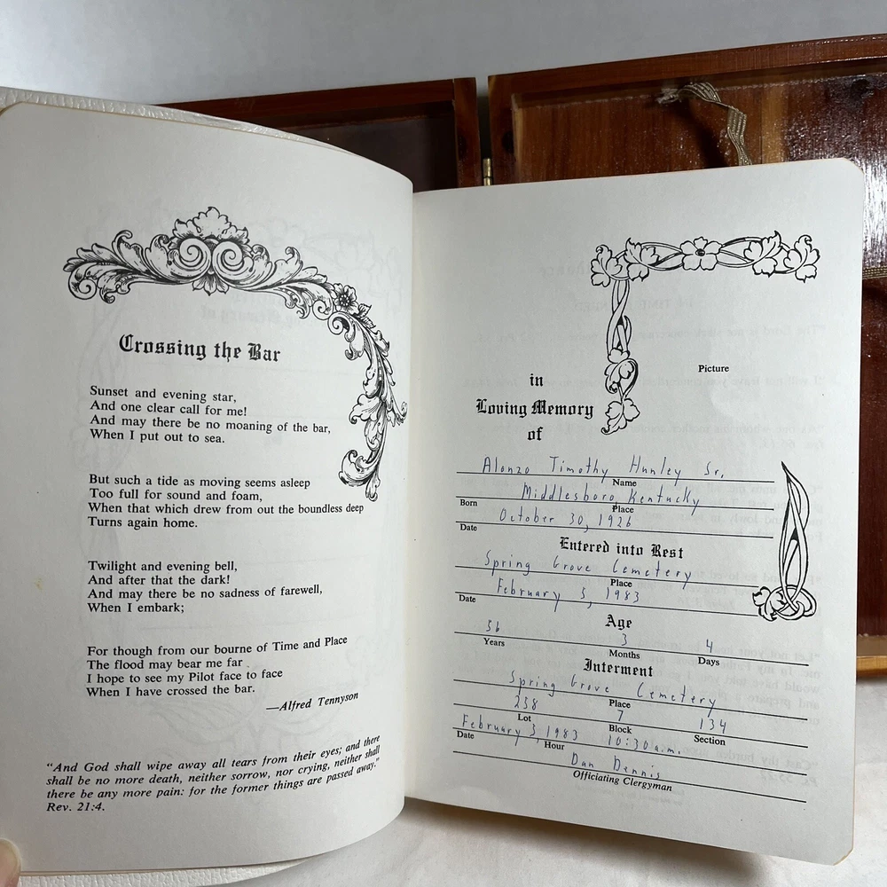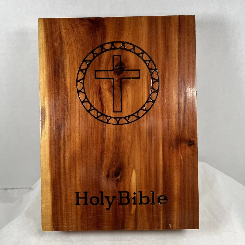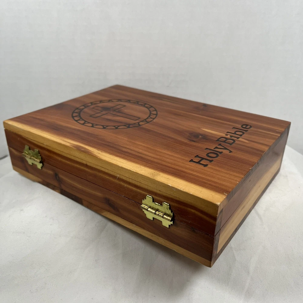 Holy Bible In Cedar Box White Leather King James Concordance Jesus Memorial Vtg Here is a beautiful vintage (1970s) white leather covered Holy Bible, King James Version, in a US union-made cedar wood box with an image of Jesus inside the cover. These boxed Bibles were often given to the family of the deceased at a funeral by the funeral home. This Bible is unmarked inside except for the memorial page which states the name of the deceased person. There is a area of tape damage on the Jesus image, where a card was attached and pulled off at some point in the past. Box is about 8.75 inches high by 6.5 inches wide by 2 inches deep. Please see photos and zoom in for details.
