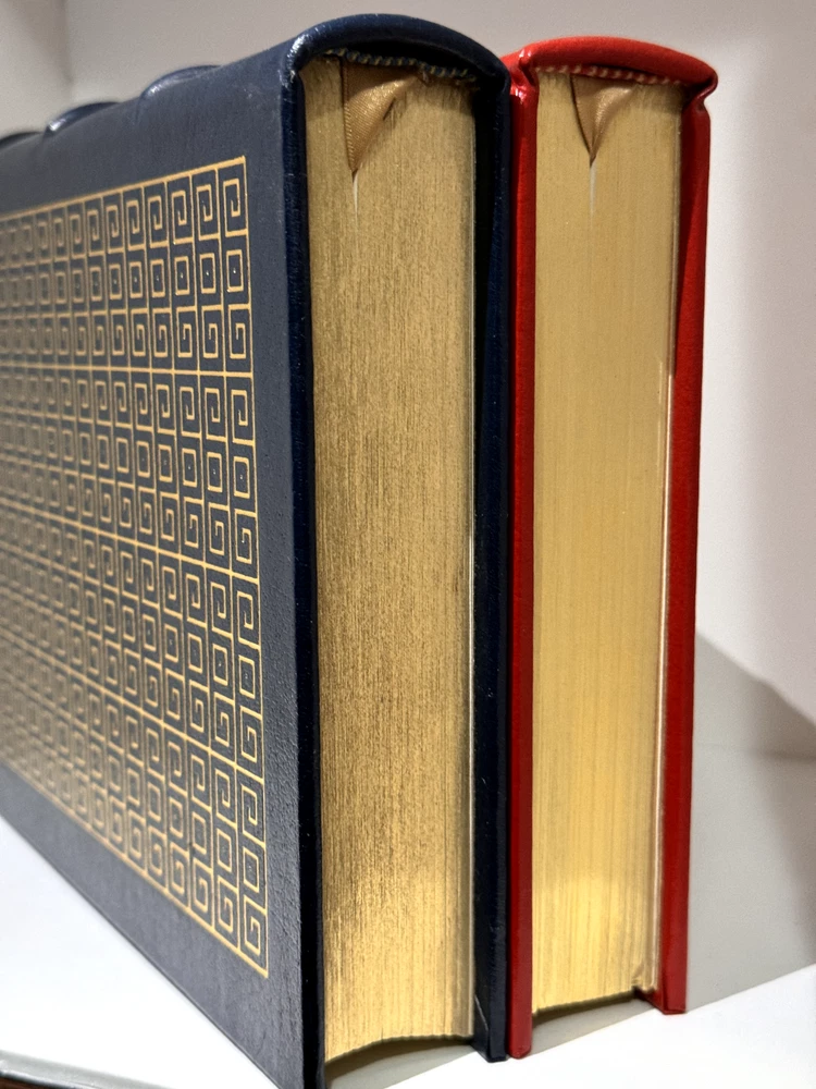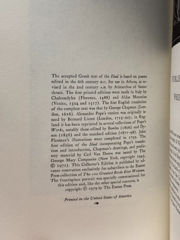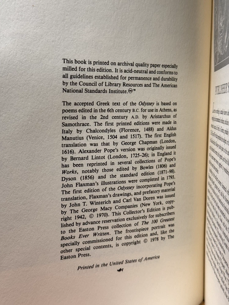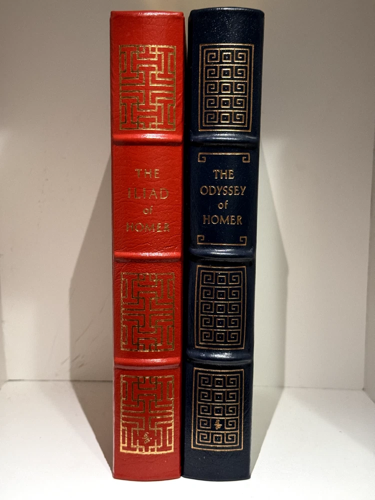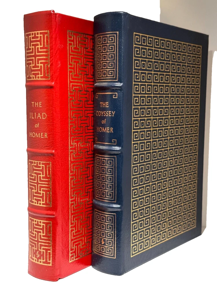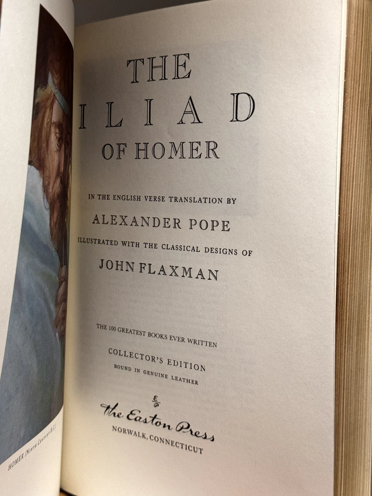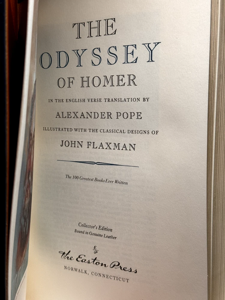 You are bidding on a stunning set of the Easton Press' 100 GREATEST BOOKS EVER WRITTEN series edition of Homer's ILIAD & THE ODYSSEY. Translated in the English verse by Alexander Pope. Illustrated with the classical designs of John Flaxman. THE ILIAD IS 1ST EDITION, 1ST PRINTING. THE ODYSSEY IS NEW, OUT OF THE SHRINKWRAP. Bound in beautiful genuine moroccan cowhide leather, the book features raised bars on the spine, gold tooling on the cover and spine, Moire ribbed endpages, satin silk sewn-in bookmark, 22k gold dust on page ends on all 3 sides. Printed on archival quality acid-neutral paper, that will last for generations without diminishing in quality or looks. LIMITED, COLLECTOR'S EDITION SPECIALLY FOR SUBSCRIBERS TO EASTON PRESS' 100 GREATEST BOOKS EVER WRITTEN. Free Shipping in all of Continental United States. All other buyers, please check with me for shipping rates before bidding. See my other listings. I have a large collection of rare and collectible books, most leather-bound, others of first edition, first printing, even unpublished manuscripts. I will combine them during shipping so you can receive them together. Just message me your intent to buy more than one book, and I will hold them to be shipped together. Happy Buying!