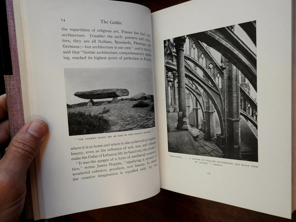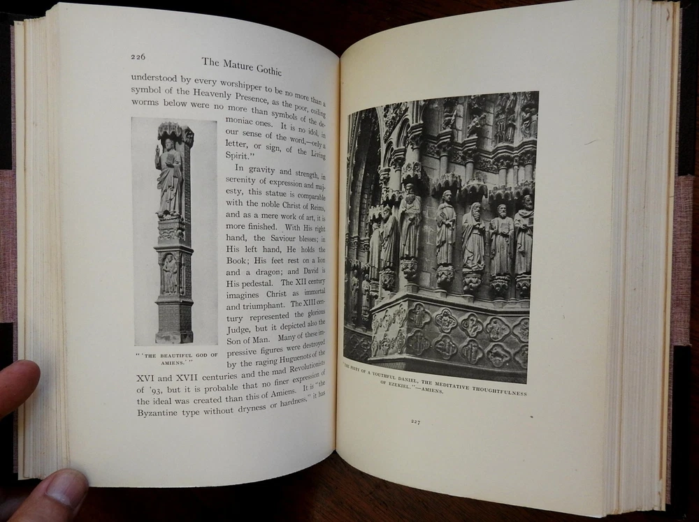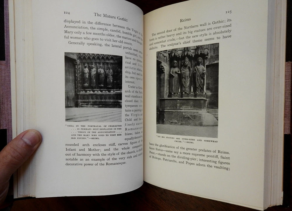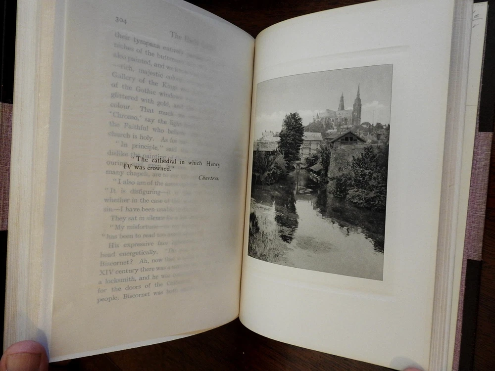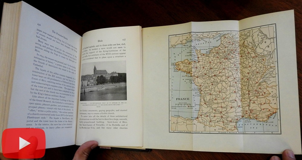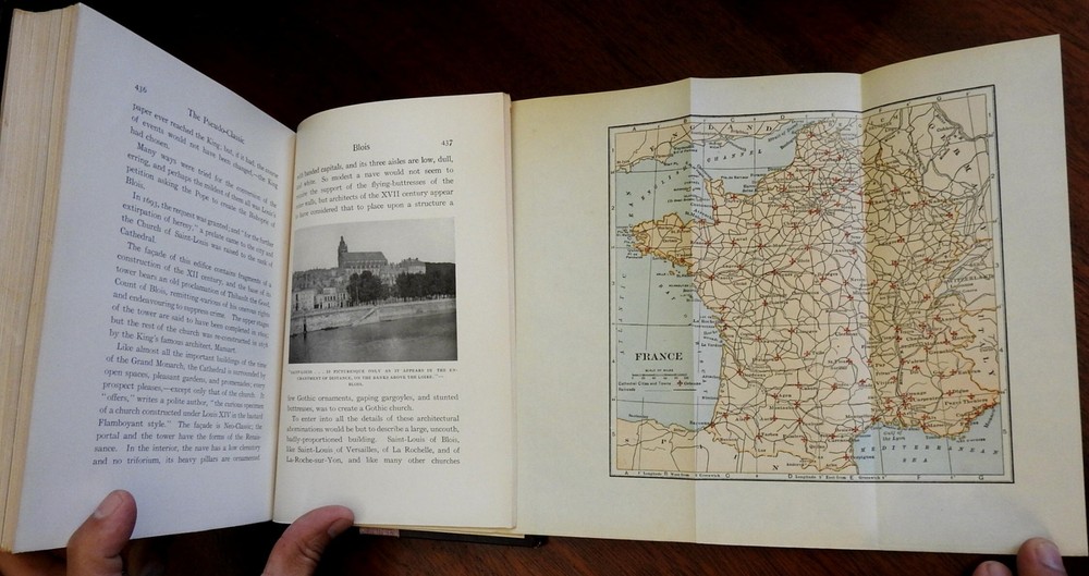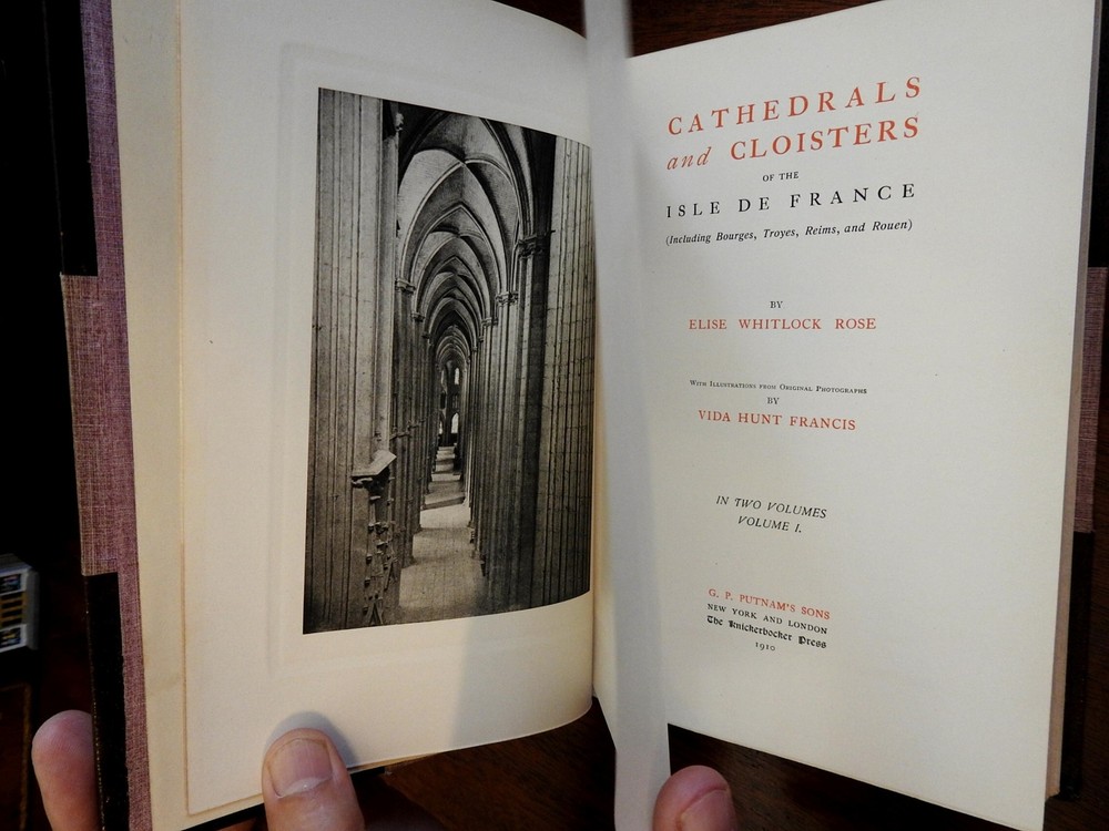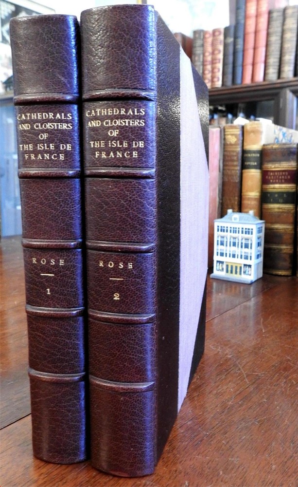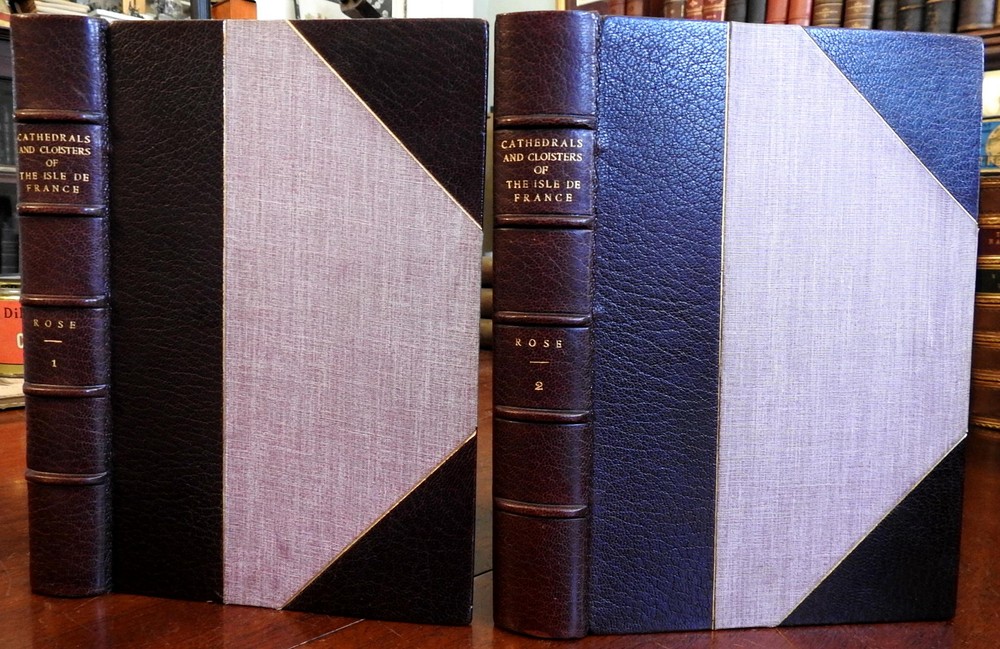 Ile de France Cathedrals & Cloisters 1910 Rose fine 2 vol. pictorial leather set Ile de France Cathedrals & Cloisters 1910 Rose fine 2 vol. pictorial leather set (Old Books, Early 20th Century Books, Leather Books, European History, Religious Architecture, France, Ile de France, Churches, Cloisters). Click here to view a short video presentation. Short video captures condition much better than photos. Please watch prior to purchase to ensure a full understanding of the set. Cathedrals and Cloisters of the Isle de France (including Bourges, Troyes, Reims, and Rouen), by Elise Whitlock Rose. Published 1910, New York by G.P. Putnam's Sons. 2 volumes, 392, 465 pages. Text in English. Profusely illustrated throughout, fold-out color map at rear of vol. 2 1/2 grained morocco leather bindings, raised bands, gilt title lettering. Stamped bindings by G.P. Putnam. Set is physically over 100 years old but is in lovely condition. Leather lightly rubbed but still supple, set remains overall attractive as an object. Text block paper is gently toned, internally still fresh, clean, well preserved, tight, sound. Still attractive on the shelf. Set displays a pleasing and unique age patina and is in nice antiquarian condition, any age flaws easy to overlook or forgive. Please review photos for more detail and our best attempt to convey how this beautiful antique set survives. Books Measure c. 9 1/4" H x 6 1/4" W. [B3134].