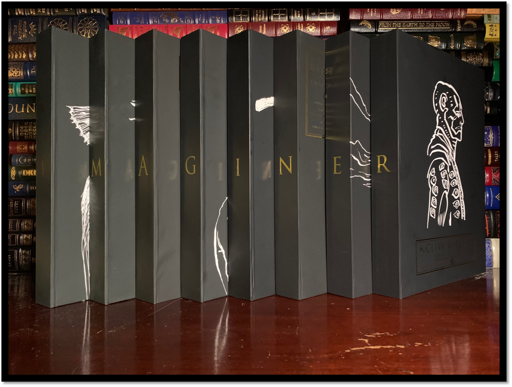 Imaginer Set This is a new traycased leather-bound 8 volume set of the Imaginer series each signed by Clive Barker. There were only 100 of each made, all of these are # 33. This series of Clive Barker art books wass being created as part of the ongoing archiving of Clive's artwork. Over the course of each volumes pages, features an afterword by Mark Miller, text and exhibition content by Thomas Negovan and newly-captured images of Clive's large-scale and vibrant canvases. Each edition features varied afterwords, texts, and amazing Clive Barker artwork. Deluxe edition : limited to 100 individually numbered leather-bound copies, with an art bookplate signed by Clive Barker, hardcover 10 x 13", Smyth sewn / square backed with black head and tail bands in custom clamshell case (11½ x 14½"). SHIPPING This will ship expedited at no additional expense within the U.S. I ship globally, but I use the U.S. service which I ship to in Kentucky and it ships out to the Country and uses their services. Also, if you are an international buyer and would like to combine shipping and the add to cart and request total option is not working please contact me about creating you a listing.