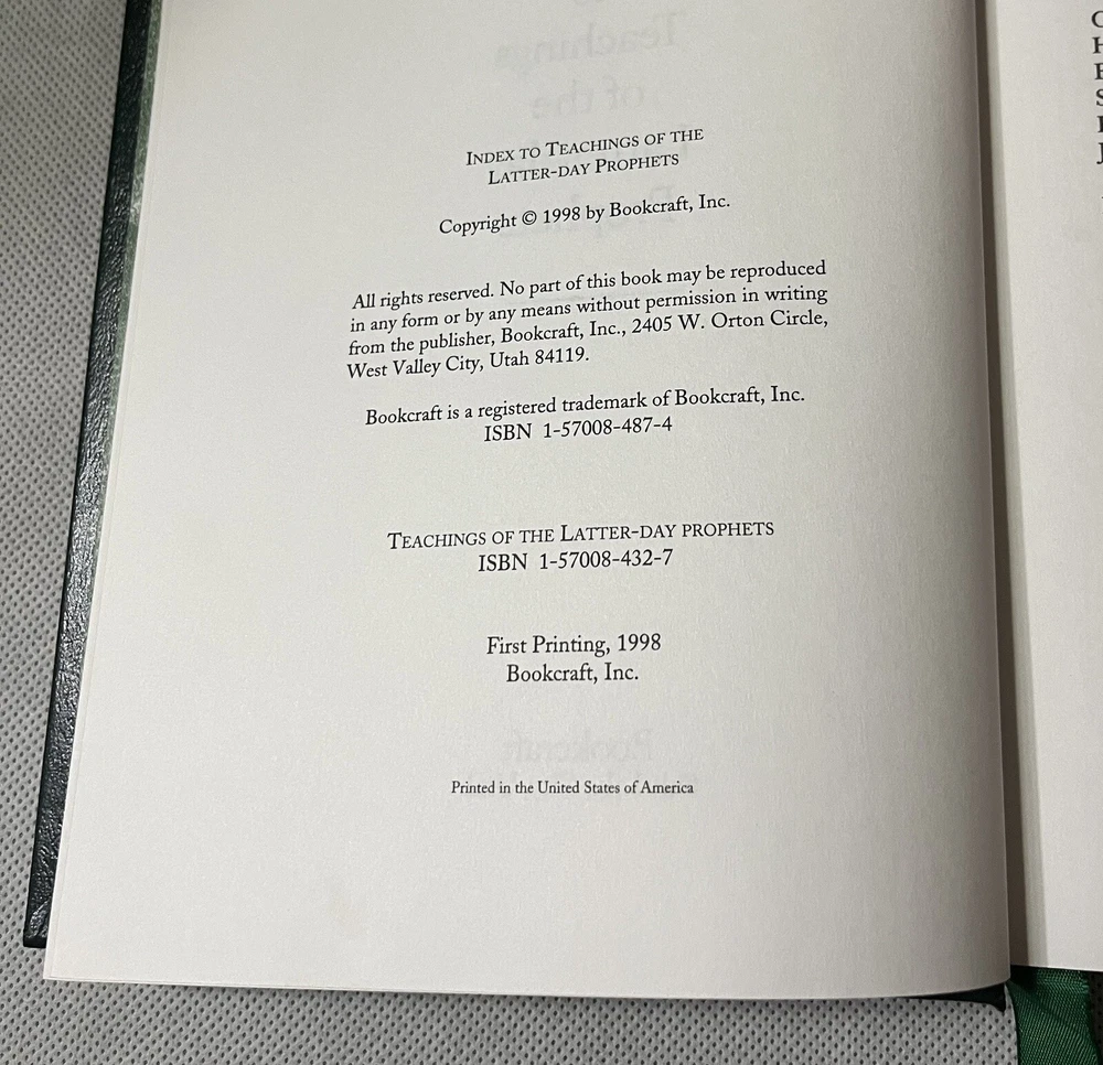 Index for Teachings of the Latter-day Prophets Leather Bound HC Special Edition Excellent condition. Please see all pics Shipped within one day of payment ********* This collector's edition of "Teachings of the Latter-Day Prophets" is a must-have for anyone interested in Christian life and general religion topics. The hardcover book features a green leatherette cover, green sewn-in marker, and gold gilded page edges. With a total of 394 pages, this book is perfect for young adults and adults who want to learn more about the teachings of the Latter-Day Prophets. The book is in English and was published by Deseret Book Company in 1998. It is not personalized, inscribed, or vintage, and does not feature an ex libris. This special edition also comes with a set copy and is not signed. The book is categorized under "Books & Magazines" and "Books". Get your hands on this unique edition and learn more about the teachings of the Latter-Day Prophets.