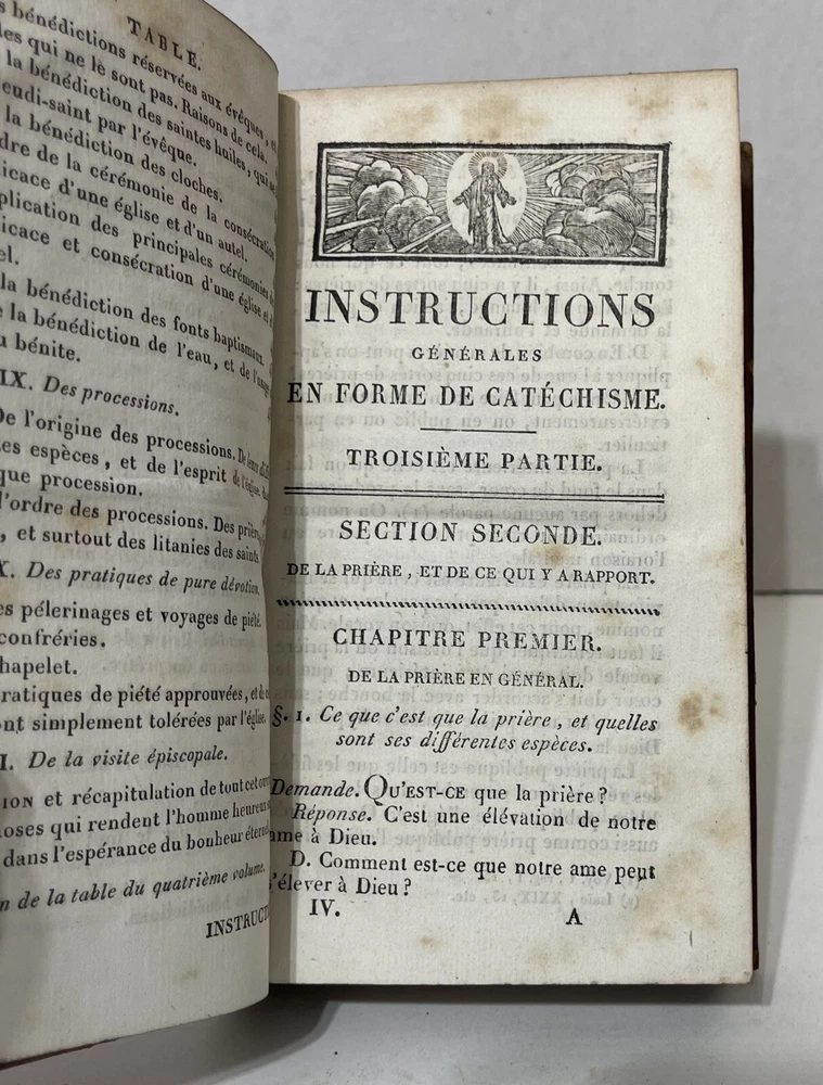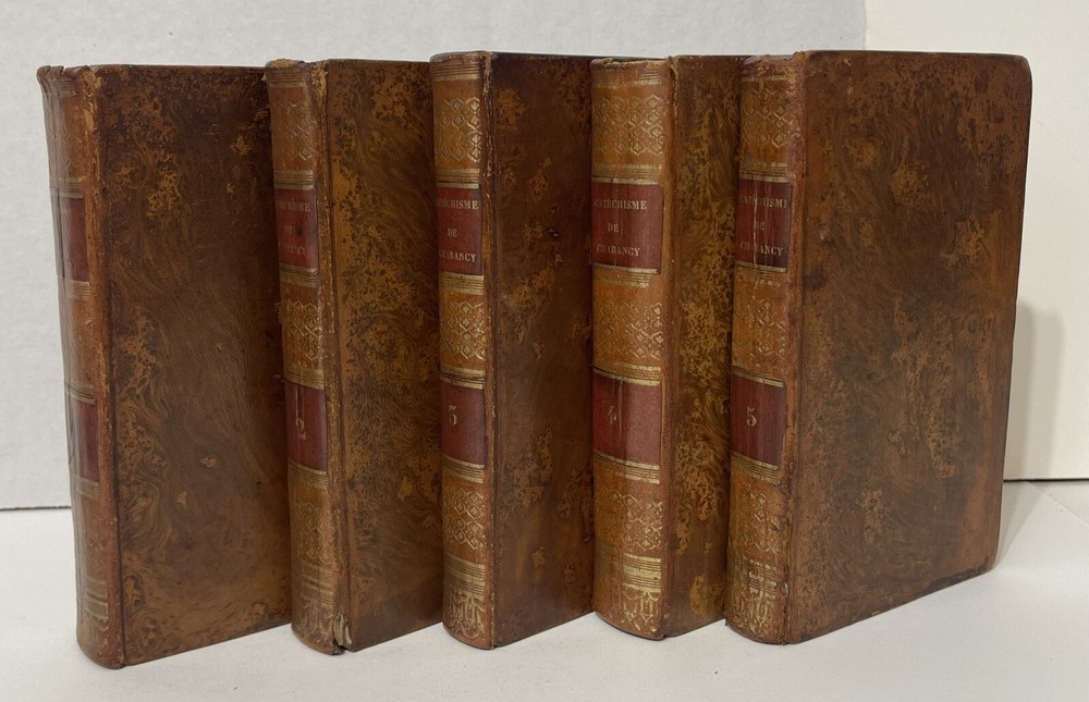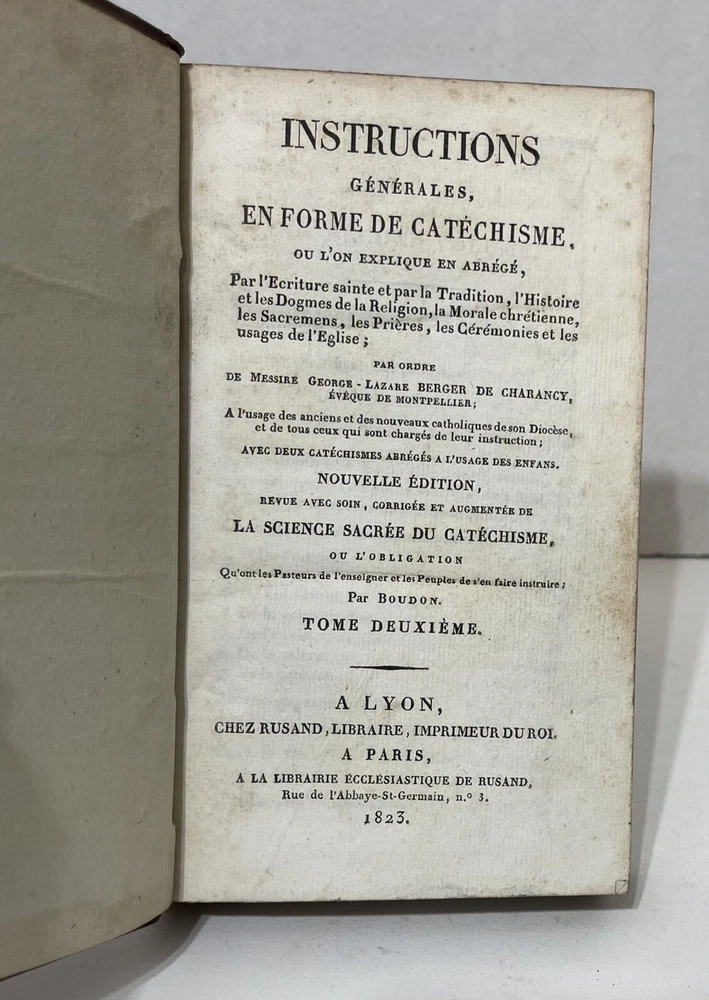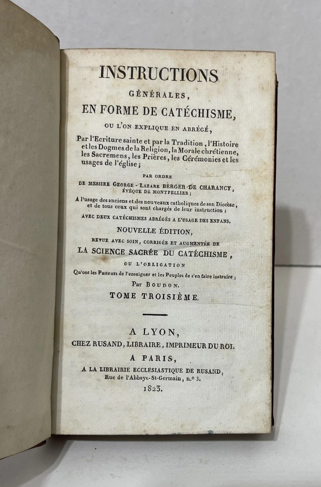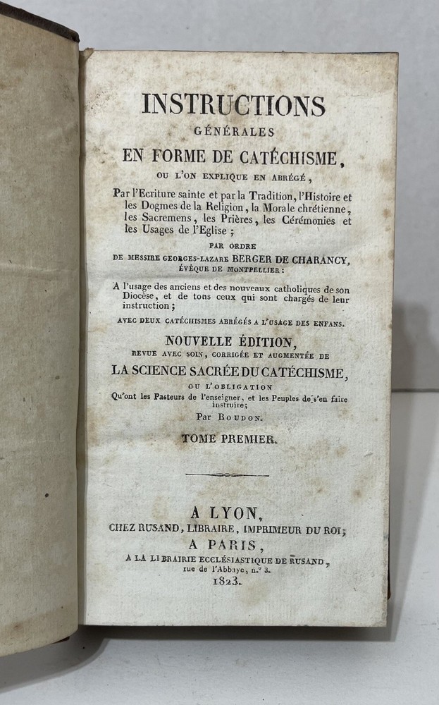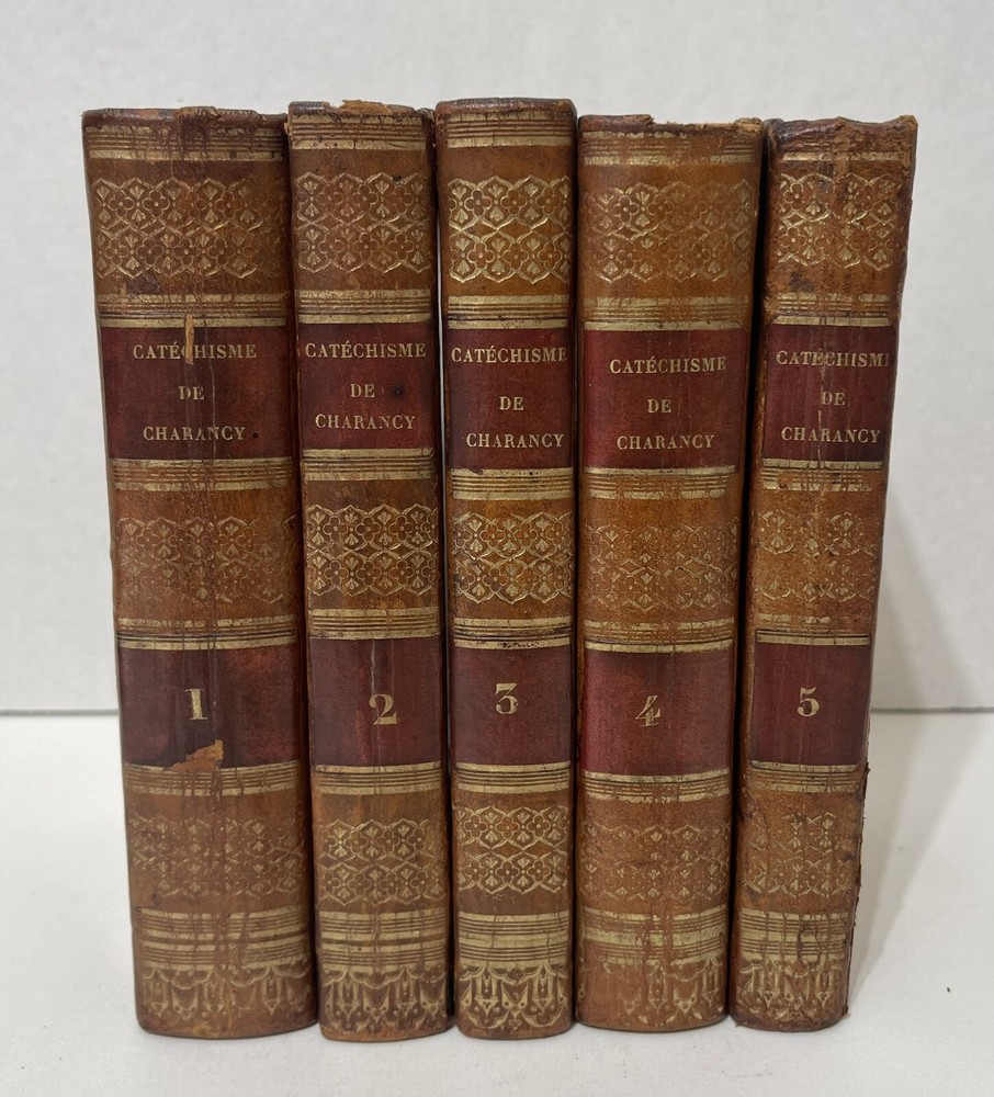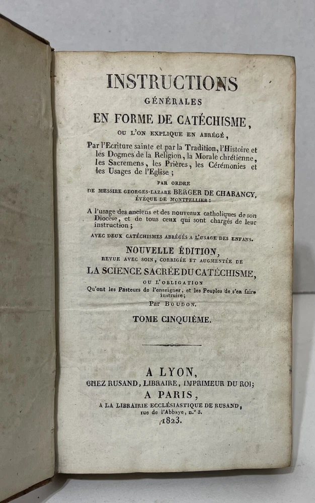 This 5-volume set of "Instructions générales en forme de Catéchisme" by Berger De Charancy is a rare find for collectors of antique religious texts. Published by CHEZ ROSAND, LIBRAIRE, IMPRIMEUR DU ROI in France in 1823, the set includes detailed instructions on religion and spirituality. The books are bound in leather and written in French, making them a valuable addition to any collection. With special attributes like the 5 volumes and the year of printing, this set is a must-have for enthusiasts of rare and collectible books. Full title : Instructions générales en forme de Catéchisme, où l'on explique en abrégé par l'Ecriture sainte & par la tradition, l'histoire & les dogmes de la Religion, la morale chrétienne, les sacremens, les prières, les cérémonies & les usages de l'Eglise Berger De Charancy, George Lazare In very good condition