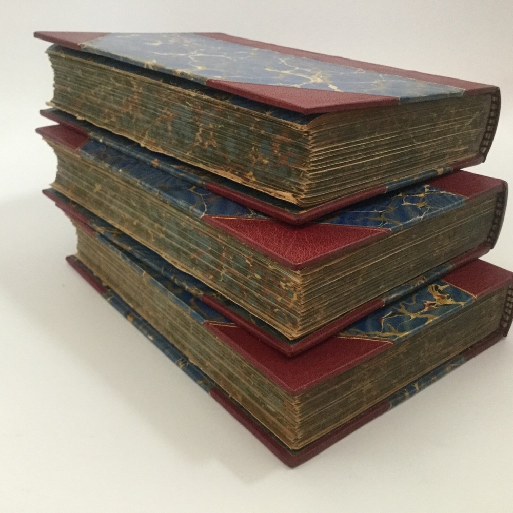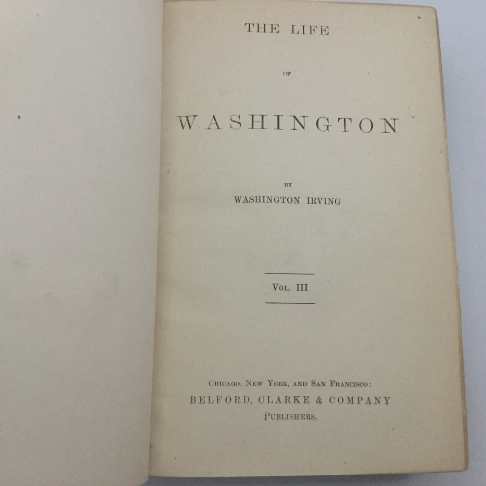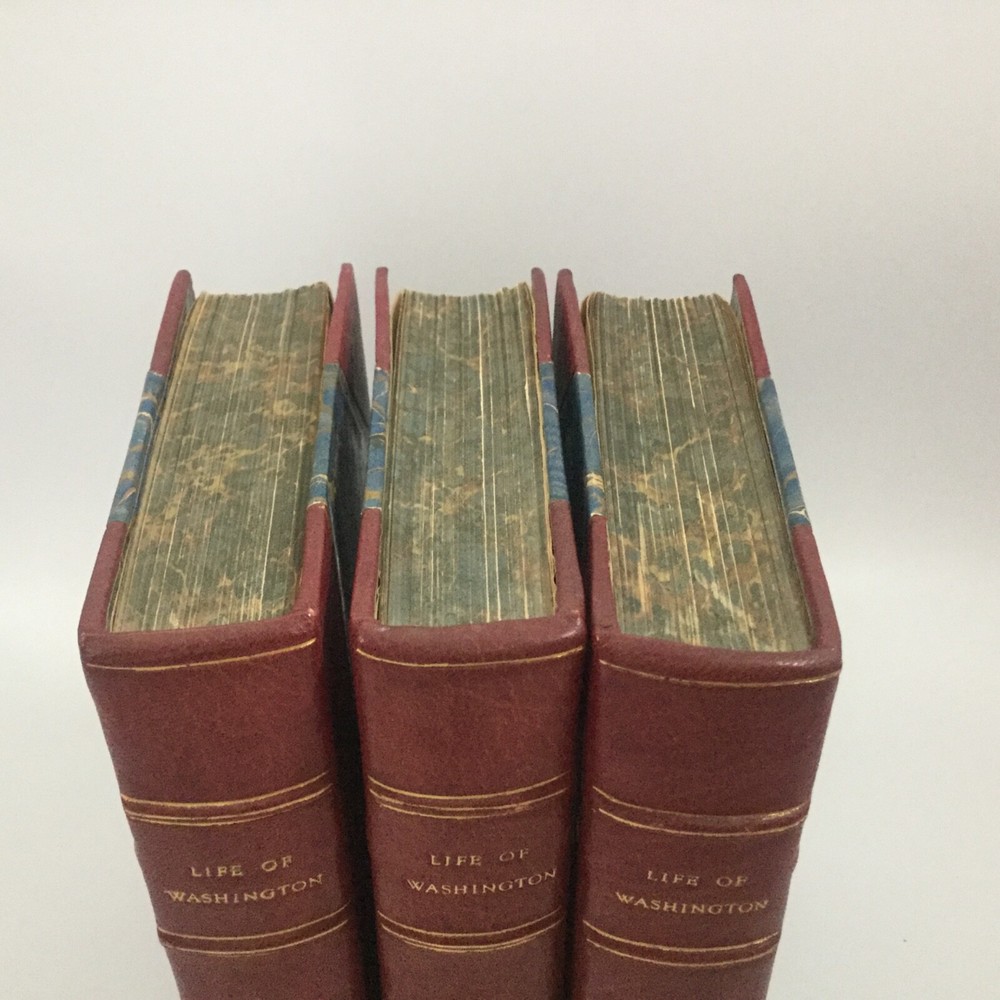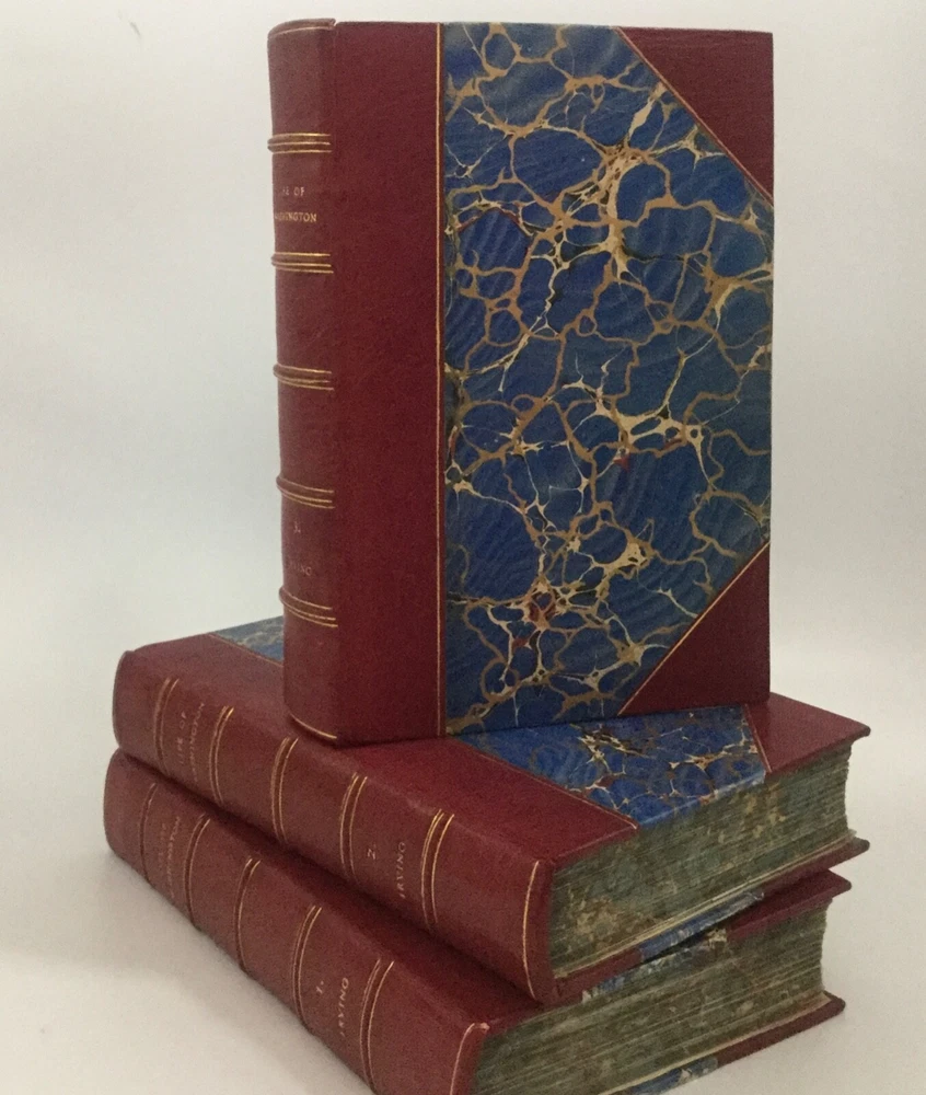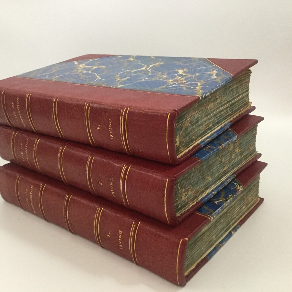 Washington Irving. THE LIFE OF WASHINGTON. 3 Volume set. New York; Belford, Clarke and Company. No copyright date. Quarter bound leather with marbled boards. Page ends are marbled in th same colors as the end pages. Gold stamped title on spine. Volume 1 printed 1888 by American Book Mart , volumes 2 & 3 by Belford, Clarke and Company unknown date