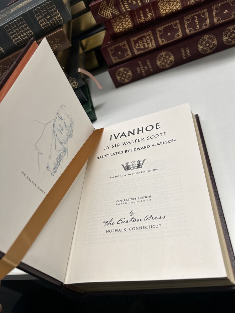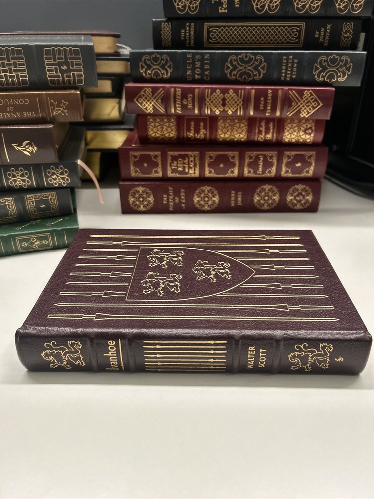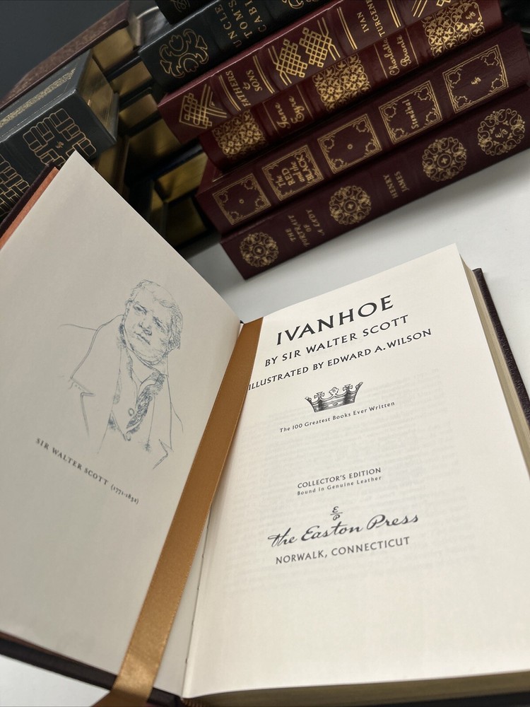 This is a rare and valuable collector's edition of "Ivanhoe" by Walter Scott. The beautiful leather binding and 24k gold accents make it a stunning addition to any library. The book was printed in 1977 by Easton Press and is written in English. It is a historical novel set in the 12th century, featuring Ivanhoe as the main character. The book is a must-have for any history enthusiast or collector of rare books.
