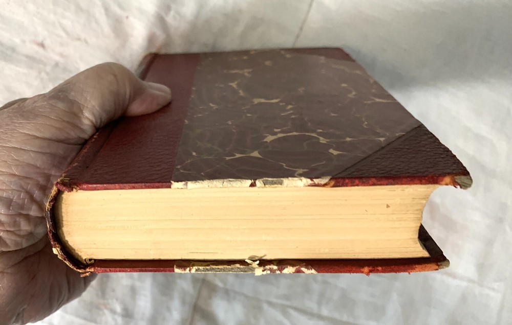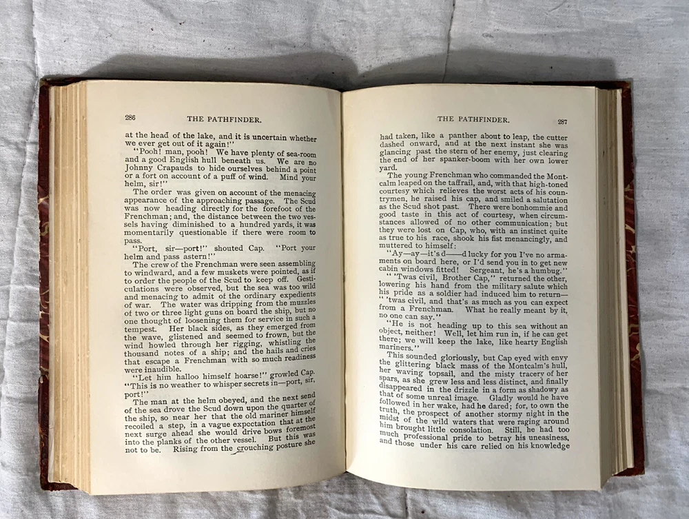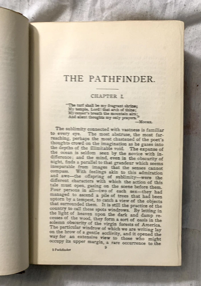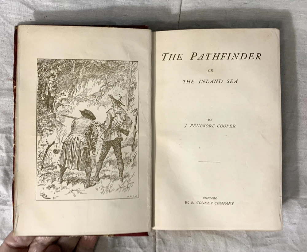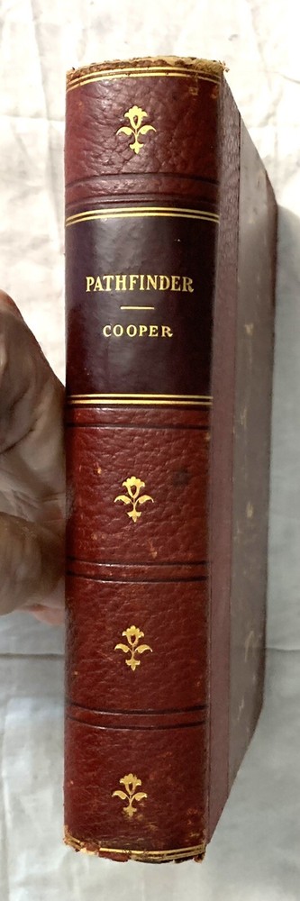 J. Fenimore Cooper THE PATHFINDER Or the Inland Sea Leather Circa Early 1900s. Very good condition hardcover book. Exterior: leather corners and spine. The rest is marbled paper. Binding is clean square and tight. Some wear to edges, corners, and spine ends. Top page edges are gilt. Interior: sewn binding. Pages are clean with no tears or creasing. Second free blank page has a price in pencil and an owner name stamped in ink. No other handwriting. Illustrated frontis plate. 551 pages plus four pages of book adv. in the back.