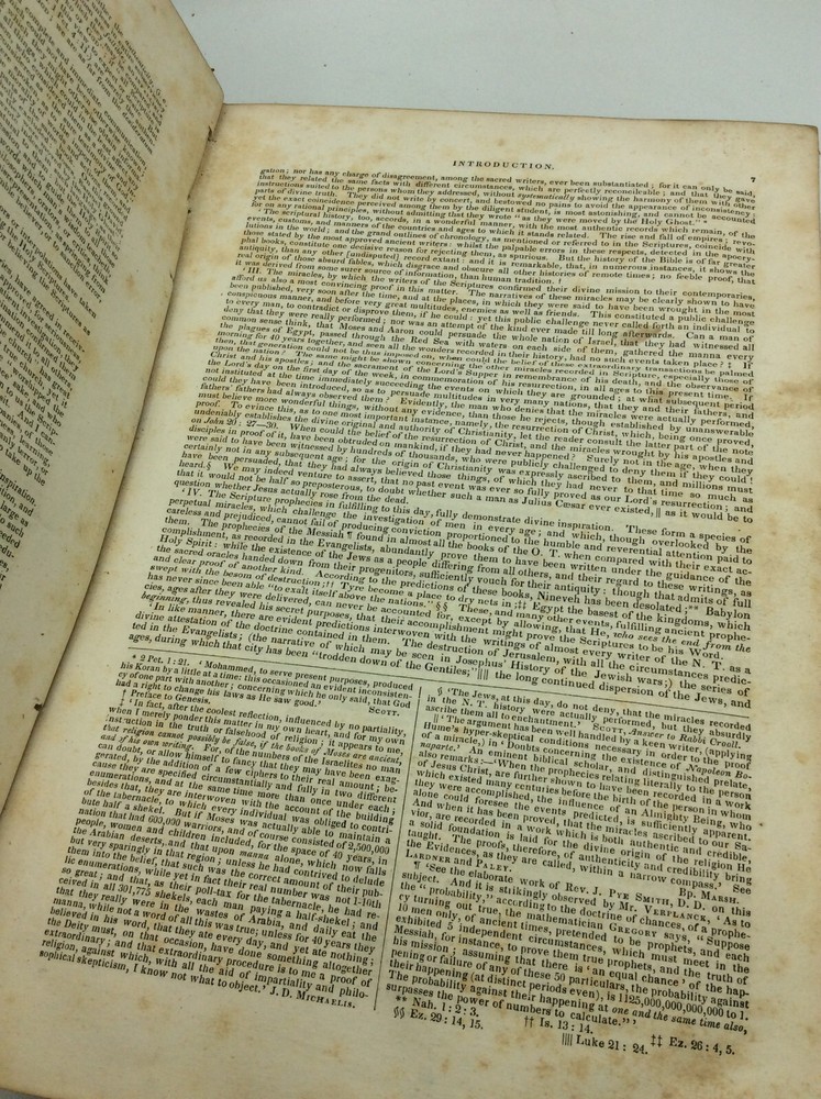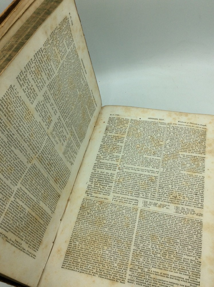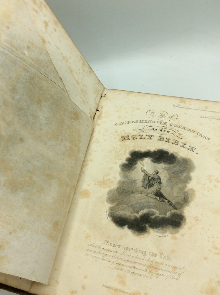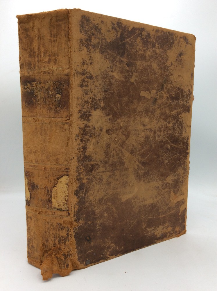 Rev. William Jenks, ed. A COMPREHENSIVE COMMENTARY OF THE HOLY BIBLE, Volumes I-V Brattleboro: Fessenden and Co., 1835. Leather. 5 vols. A set of five large hardcover books bound in full golden-brown leather with marbled edges and endpapers. FAIR condition overall. Covers are heavily scuffed and spine labels have chipped off. Old stamps on blank front endpapers. Some pages coming loose; all pages foxed with age. Volume 3's pages are dampstained. The Family Record section has been filled out by an early owner. The front cover of volume 5 is cracking off and has some tape repair at the top of the hinge. A much-used but readable set, covering Genesis through Revelation. Item #313736 Each volume measures approx. 11" x 7.5" and is illustrated with occasional black and white plates. William Jenks (1794-1866) was a Congregational clergyman and scholar from Massachusetts. This biblical commentary is one of his major works, using the Authorized King James Version with Scott's marginal references, Matthew Henry's commentary, and notes from Doddridge, Gill, and numerous other Scripture scholars. Published across 1835-38.