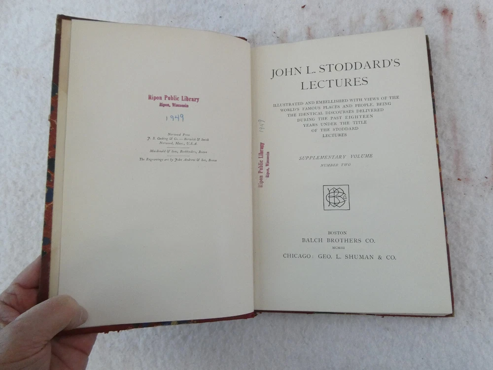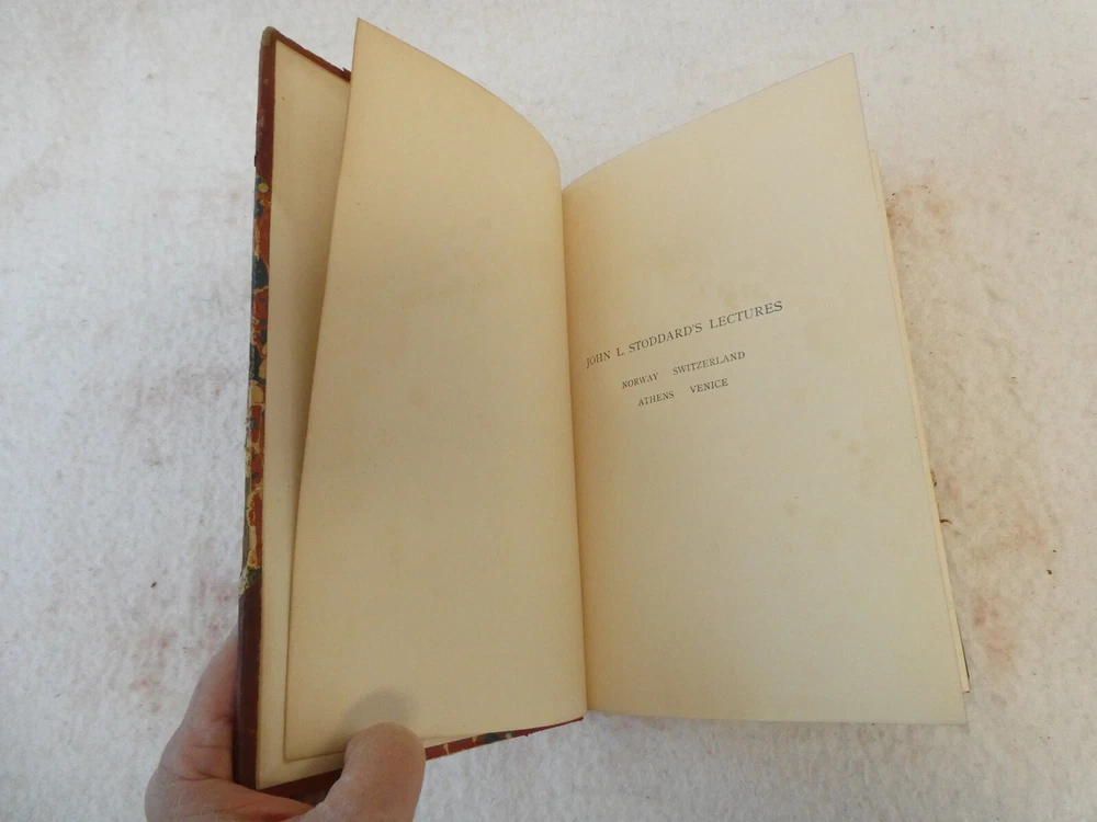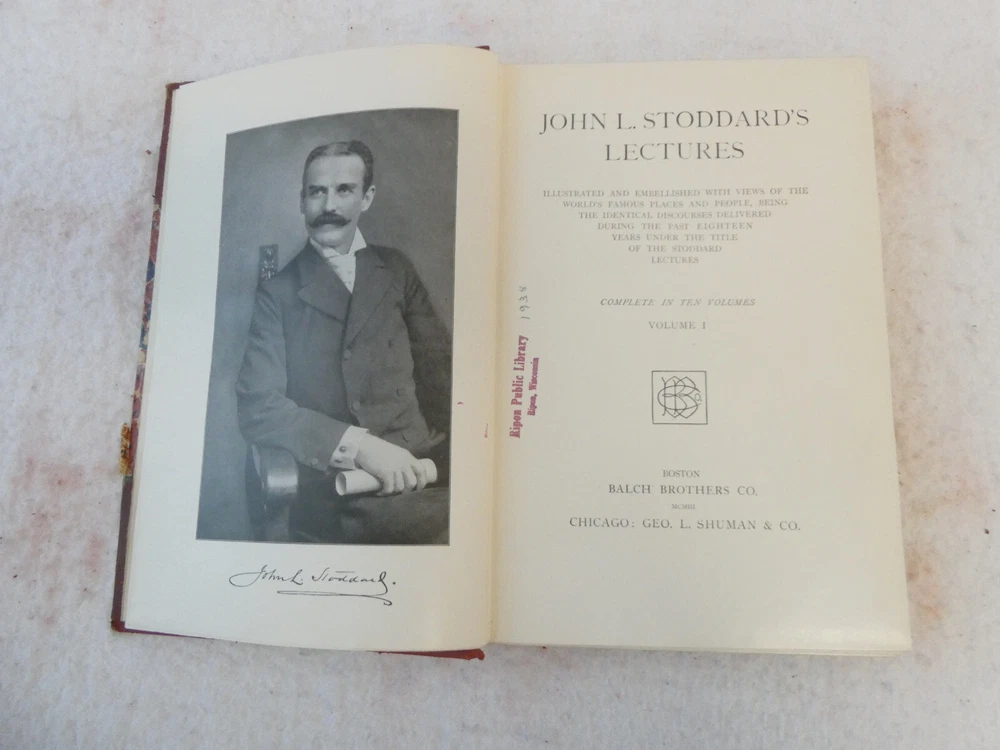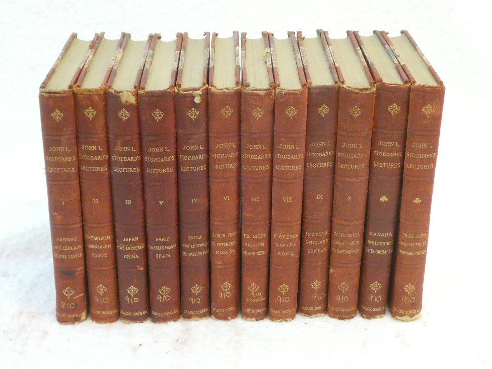JOHN L. STODDARD'S LECTURES Illustrated and Embellished with Views of the World's Famous Places and People, Being the Identical Discourses Delivered During the Past Eighteen Years Under the Title of the Stoddard Lectures Complete in Ten Volumes with Two Supplementary Volumes Boston: Balch Brothers Co., 1903 12 Half-Leather Volumes in Good Condition. Leather is flaking at edges. Boards are edgeworn. Ex-Library with minimal typical markings. Previous owner's name and date on front endpapers in each. Please examine photos for details. Condition: We strive to describe and photograph the condition of every item as accurately as possible. Photos are of the actual item that is being sold. Please examine the photos carefully for any condition details and possible flaws. Best Offers: We consider all offers in relation to current market values. We try to respond almost immediately to most offers. Most of our counteroffers are firm but we are open to bargaining. Shipping: We combine shipping. When ordering multiple items from us please request a total before paying. We charge postage based on weight plus $1 for each eBay listing. All of our orders are packed carefully to prevent damage during shipment. We ship most of our items within 24 hours. Contact Us: We are available 7 days a week and are happy to answer any questions you may have.
