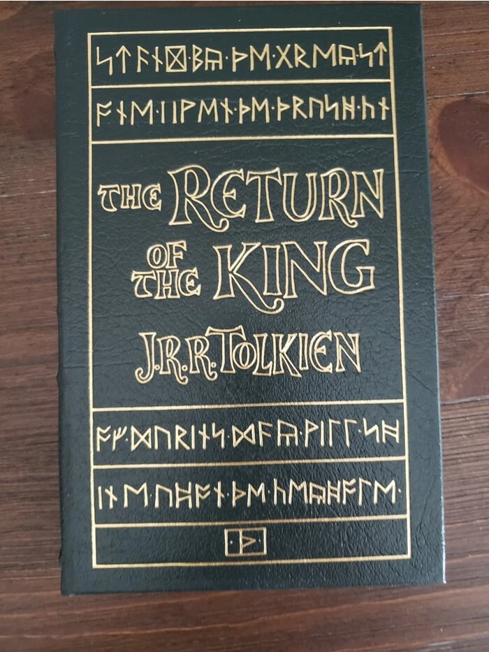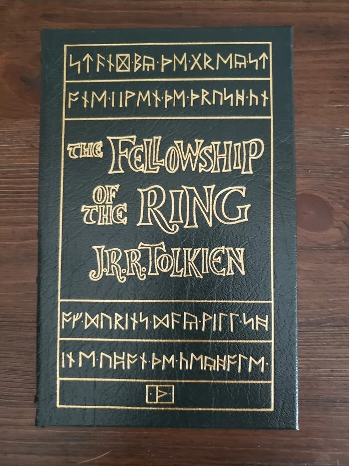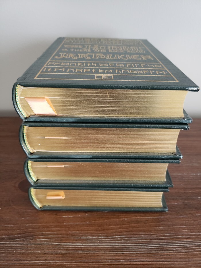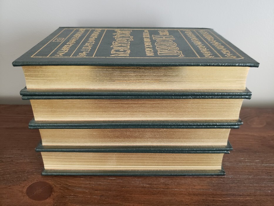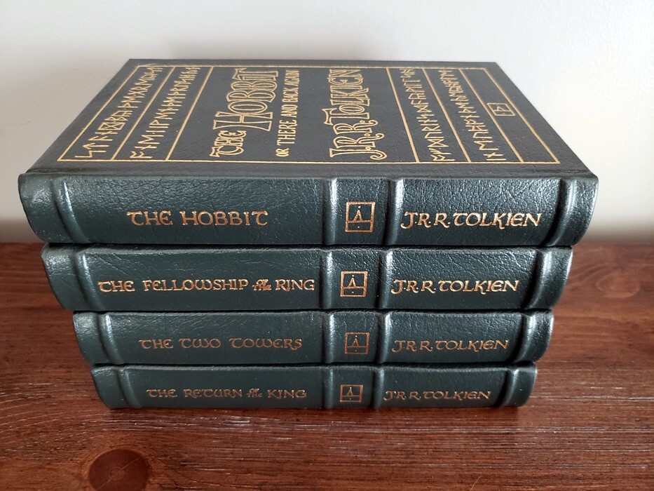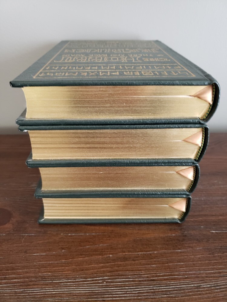 You're bidding on an J.R.R. TOLKIEN Set of 4 Easton Press Leather Bound Hardback Editions: THE HOBBIT, THE FELLOWSHIP OF THE RING, THE TWO TOWERS, and THE RETURN OF THE KING! Non-smoking and climate controlled environment, purchased new as original owner from Easton Press. Crisp clean pages and cover wear normal for book age and time on shelf.
