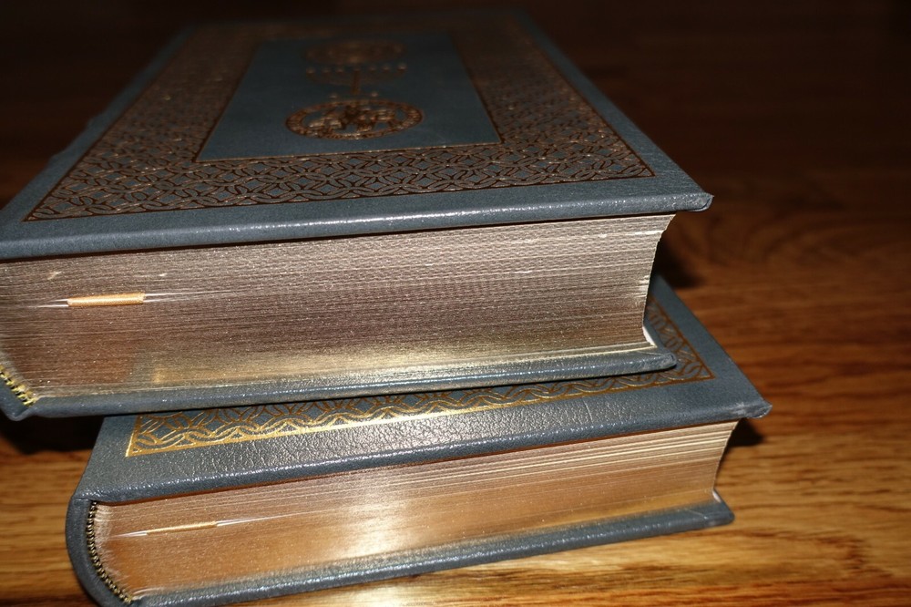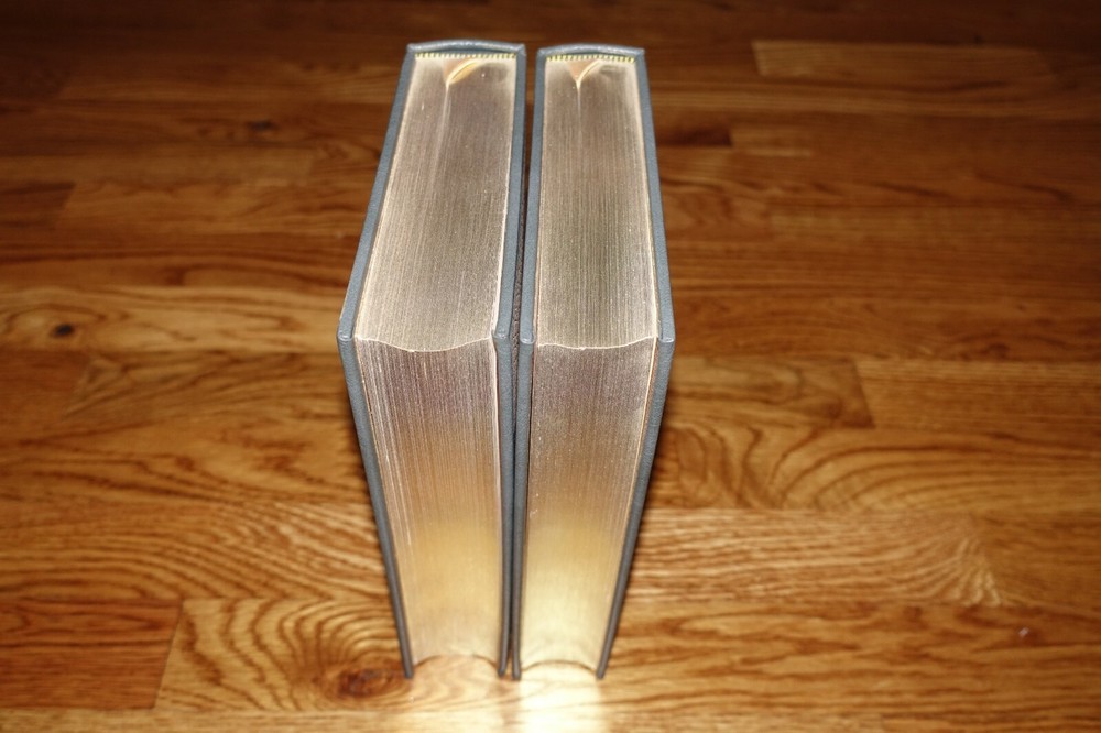 Bindings are tight in both volumes and neither has any wear or damage to note inside. No bookplates have been affixed. Leather covers do not have any wear or damage to note. The only wear I can find is some light rubbing or chipping to the page edge gilt in a few small areas. I have tried to take close-up photos of the page edge gilt to show what I am describing. Please feel free to contact me with any questions.