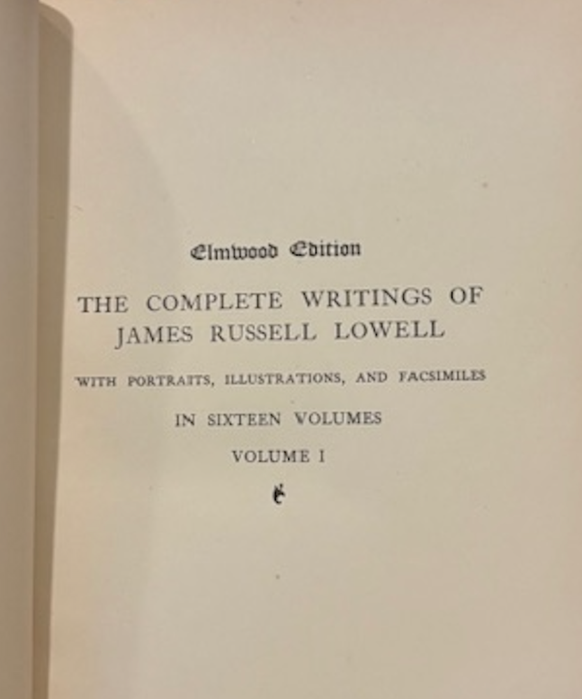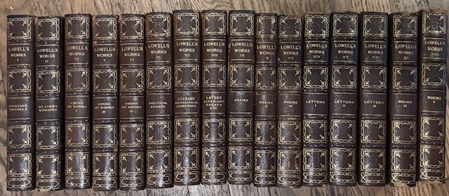 The Complete Writings of James Russell Lowell (1819-91), prominent American writer, critic, and philosopher. Lowell was the first editor of the "Atlantic Monthly" and author of "The Biglow Papers," described as "a masterpiece in the genre of folksy philosophizing in American dialect." Published by Riverside Press, 1904, Cambridge, Massachusetts. Elmwood Edition with portraits, illustrations, and facsimiles. 16 vols., 8 3/4" x 5 3/4", antique books bound in brown leather, top edges gilt, gilt spines with scrolling foliage. Condition notes: good condition consistent with age: bumped edges, yellowed pages (please see photos).