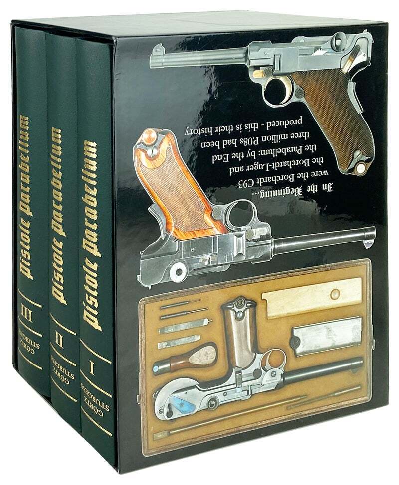 Pistole Parabellum: History of the "Luger System" [Three volumes in slipcase] Author: Joachim Gortz and Geoffrey L. Sturgess; R. Blake Stevens [ed.] Title: Pistole Parabellum: History of the "Luger System" [Three volumes in slipcase] Publication: Cobourg, Ontario, Canada: Collector Grade Publications Incorporated, 2010 Description: Near Fine. Cobourg, Ontario, Canada: Collector Grade Publications Incorporated, 2010. First Edition. Three quarto volumes. 1930pp., with continuous pagination. Profusely illustrated; color and b&w. Green leather boards stamped in gilt; no dust jackets. Housed in publisher's glossy slipcase. A few inoffensive smudges to boards. Bindings sound and pages unmarked. Slipcase shows mild shelfwear to edges and a couple inoffensive surface scratches; overall a Near Fine set. Seller ID: 31633 Subject: German Language, Military History, Science & Technology, World War I, World War II Capitol Hill Books is a used bookstore located on historic Capitol Hill in Washington DC, with three floors of quality used books, first editions, and rare books. [Note: Our online inventory is stored and managed at a separate location from at our brick and mortar shop. If you have a question about an item listed online, please send a direct message here rather than calling the store so that we can make sure someone familiar with the item in question can respond.] Terms Books described only as First Editions are First Printings unless otherwise specified. All items are guaranteed to be as described or they may be returned within 30 days of receipt for a full refund. All orders ship within two business days. Standard mail is USPS Media Mail. Expedited and international shipping are also available (please contact for estimates). We offer combined shipping on multiple orders. This listing was created by Bibliopolis.