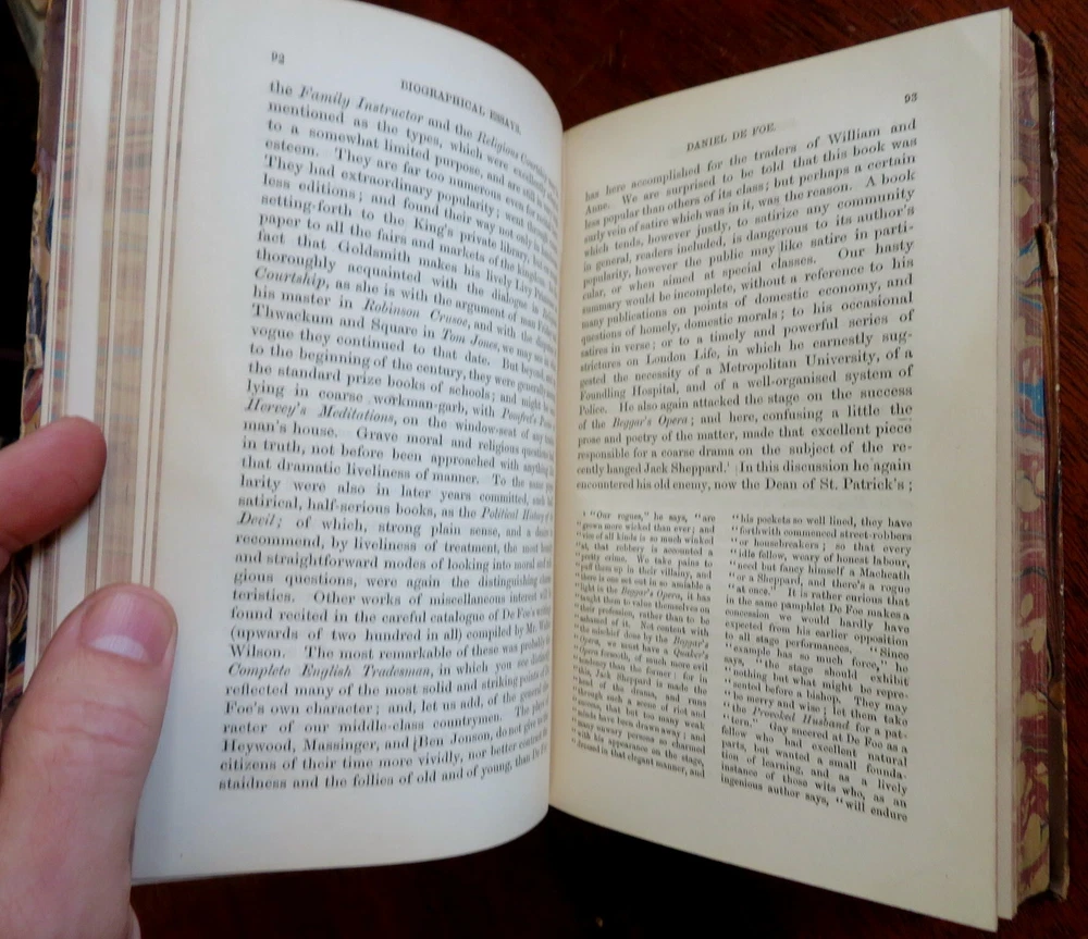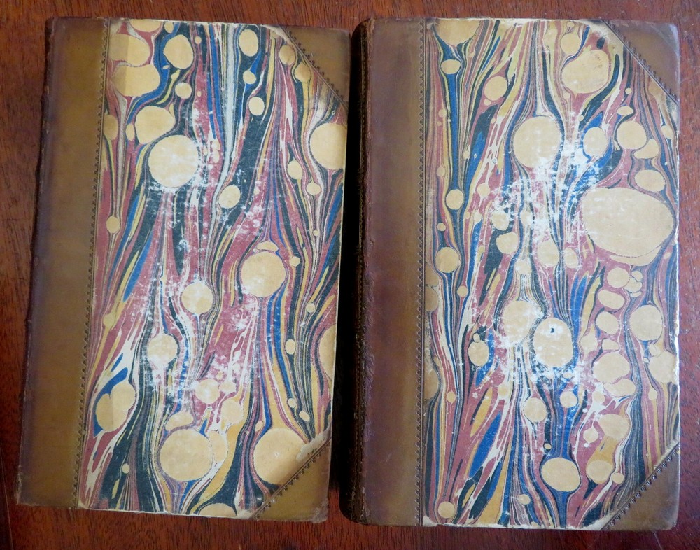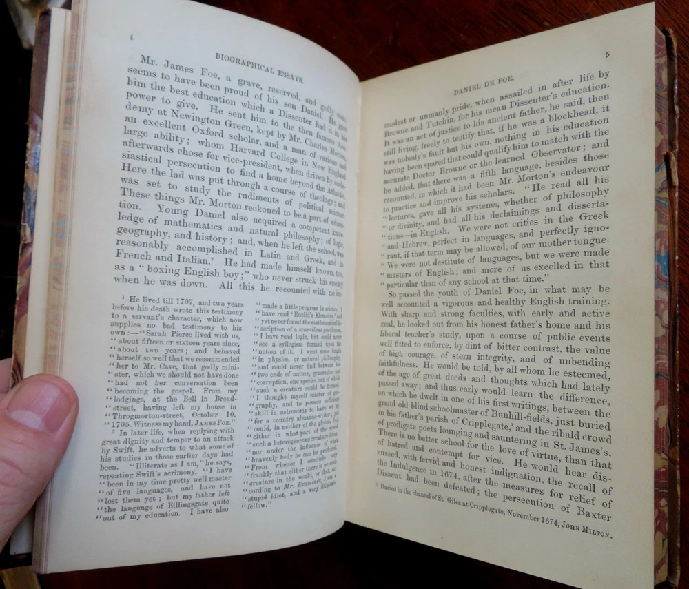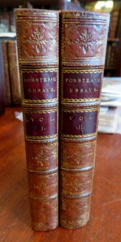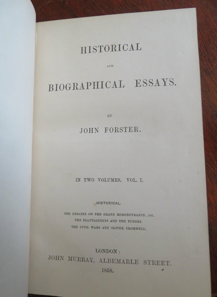 John Foster Collected Essays History Biography 1858 leather 2 vol. set John Foster Collected Essays History Biography 1858 leather 2 vol. set (Old Books, 19th Century Books, Leather Books, Decorative Book Bindings, History, Biography, John Foster,Daniel de Foe, Sir Richard Steele Charles Churchill, Samuel Foote). Historical and Biographical Essays by John Foster. Published 1858, London by John Murray. 2 volumes. 336, 437 pages. Text in English. With large folding lithographed facsimilie hand manuscript plate. Uncommon mid-19th century historical set. Attractive antiquarian 1/2 leather binding, raised & gilt bands, gilt title lettering on contrasting leather label, marbled covers, edges & end papers. Set is physically old and shows some signs of handling and time. Bindings gently age worn but still appealing, leather and joints slightly scuffed and rubbed but still supple, slight surface crackling to joints at spine ends, front joint of second volume slightly tender and starting, covers strong and well attached, set remains overall very attractive as an object. Text block paper is gently age toned as typical, internally set remains mostly clean, tight and sound. A set which has been taken care of but may/ does not look like new. Still attractive on the shelf. Set displays a pleasing and unique age patina and is in rather nice antiquarian condition, any age flaws seem easy to overlook or forgive. Please review photos for more detailed attempt to present this set as it survives. We often over-describe any flaws that many sellers would not even bother to mention since most people would overlook them as minor and unworthy of comment. Many people tell us the books they receive from us are nicer in person than they appears on the screen. We want you to be clear about what you are buying, so we take numerous photos and try to describe it openly and honestly. Set Measures c. 7 3/4" H x 5" W. [B8517].