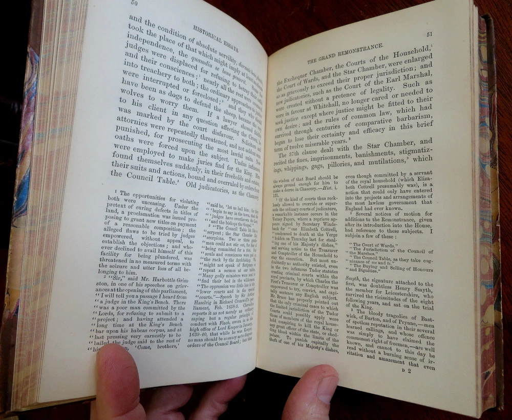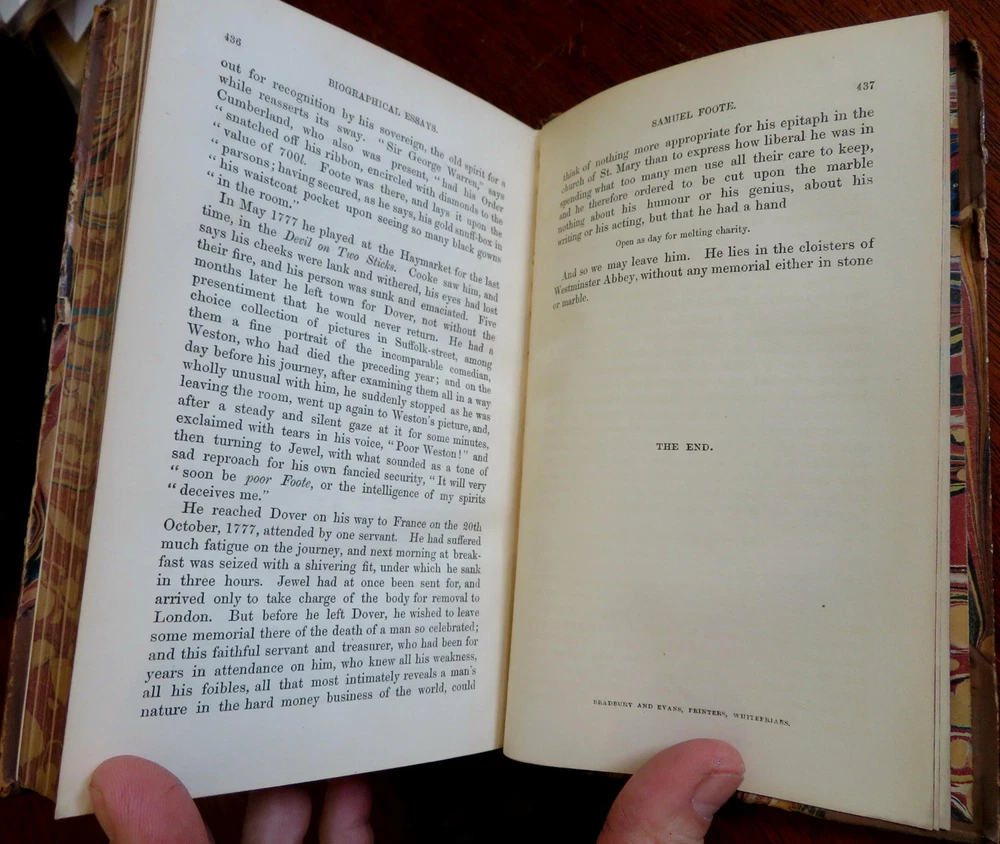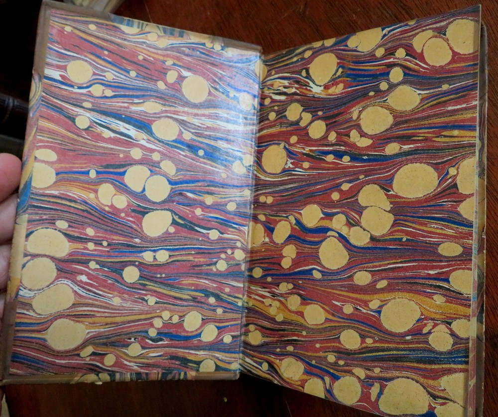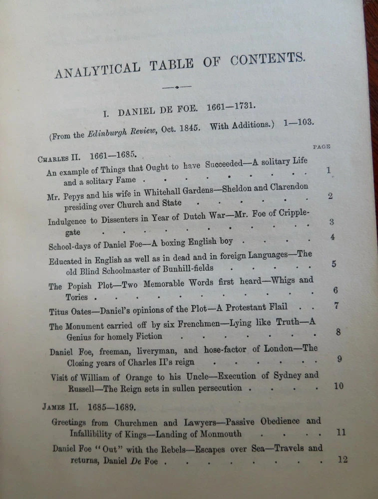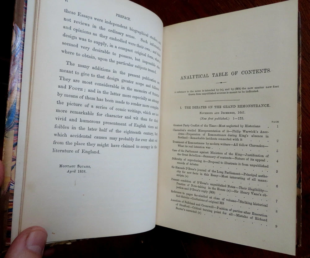 John Foster Collected Essays History Biography 1858 leather 2 vol. set John Foster Collected Essays History Biography 1858 leather 2 vol. set (Old Books, 19th Century Books, Leather Books, Decorative Book Bindings, History, Biography, John Foster,Daniel de Foe, Sir Richard Steele Charles Churchill, Samuel Foote). Historical and Biographical Essays by John Foster. Published 1858, London by John Murray. 2 volumes. 336, 437 pages. Text in English. With large folding lithographed facsimilie hand manuscript plate. Uncommon mid-19th century historical set. Attractive antiquarian 1/2 leather binding, raised & gilt bands, gilt title lettering on contrasting leather label, marbled covers, edges & end papers. Set is physically old and shows some signs of handling and time. Bindings gently age worn but still appealing, leather and joints slightly scuffed and rubbed but still supple, slight surface crackling to joints at spine ends, front joint of second volume slightly tender and starting, covers strong and well attached, set remains overall very attractive as an object. Text block paper is gently age toned as typical, internally set remains mostly clean, tight and sound. A set which has been taken care of but may/ does not look like new. Still attractive on the shelf. Set displays a pleasing and unique age patina and is in rather nice antiquarian condition, any age flaws seem easy to overlook or forgive. Please review photos for more detailed attempt to present this set as it survives. We often over-describe any flaws that many sellers would not even bother to mention since most people would overlook them as minor and unworthy of comment. Many people tell us the books they receive from us are nicer in person than they appears on the screen. We want you to be clear about what you are buying, so we take numerous photos and try to describe it openly and honestly. Set Measures c. 7 3/4" H x 5" W. [B8517].
