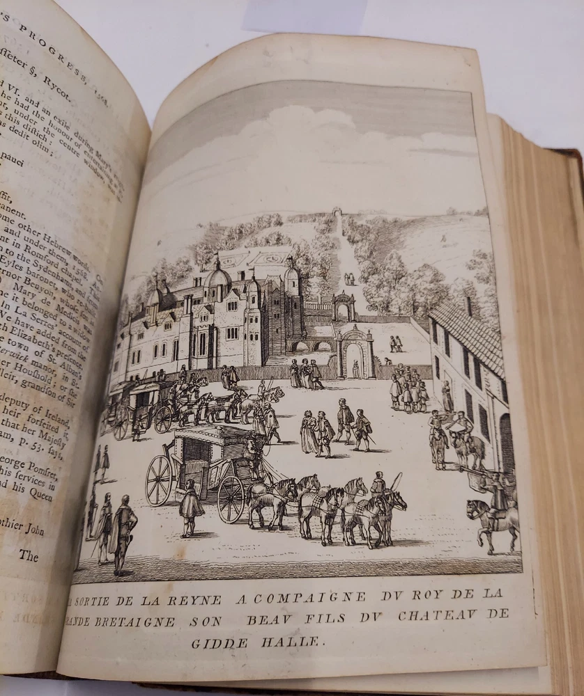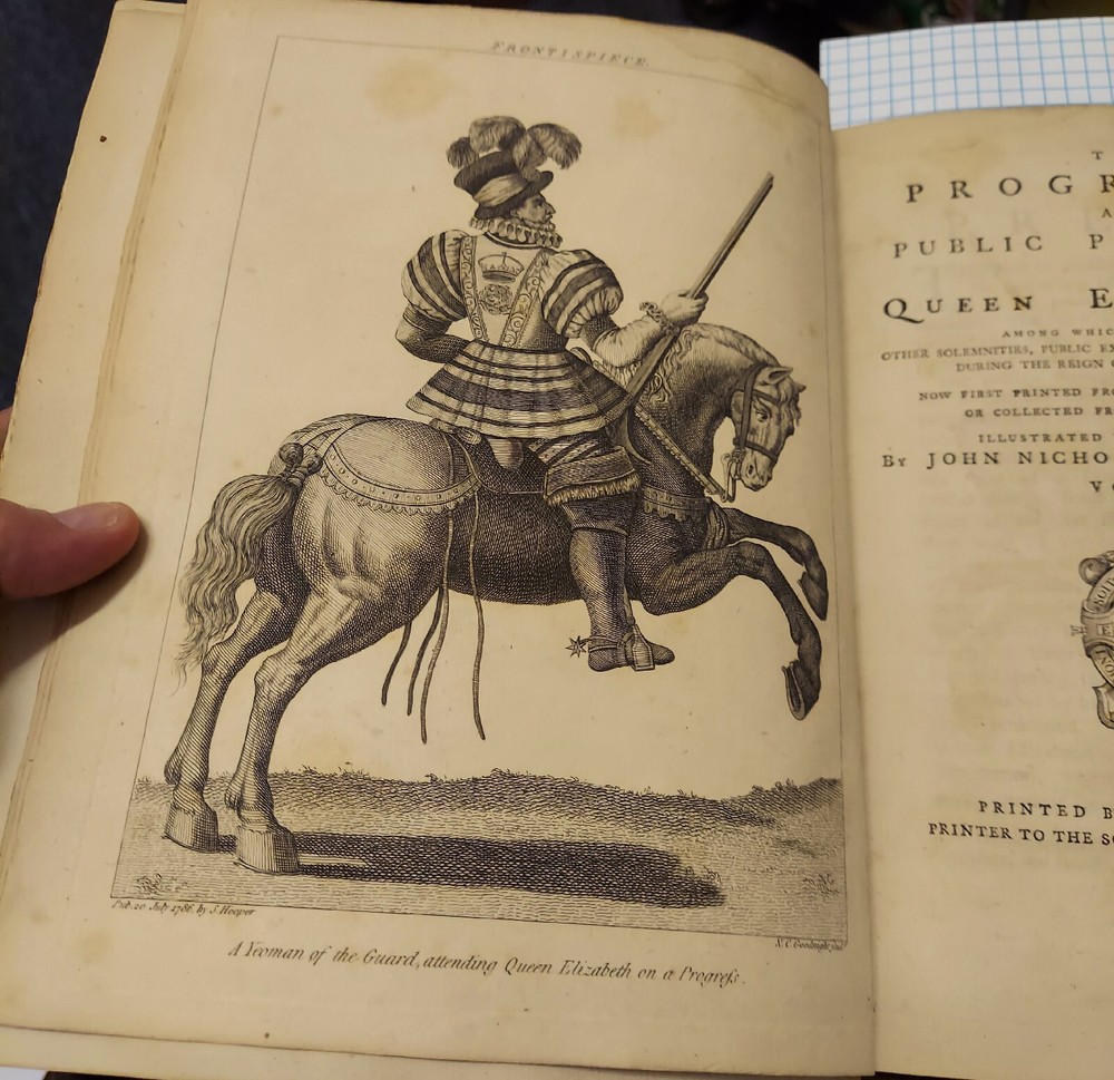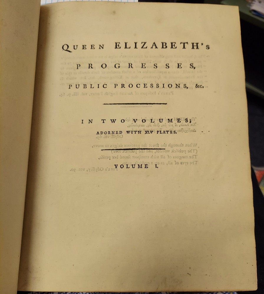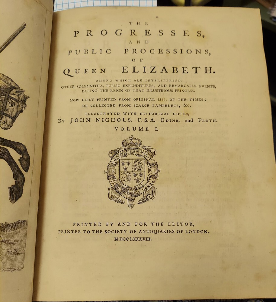 THE PROGRESSES AND PUBLIC PROGRESSIONS OF QUENN ELIZABETH. AMONG WHICH ARE INTERSPERSED OTHER SOLEMNITIES, PUBLIC EXPENDITURES, AND REMARKALBE EVENTS, DURING THE REIGN OF THE ILLUSTRIOUS PRINCESS. COLLECTED FROM ORIGONAL MANUSCRIPTS, SCARCE PAMPHLETS, CORPORATION RECORDS, PAROCHIAL REGISTERS,ILLUSTRATED WITH HISTORICAL NOTES, BY JOHN NICHOLS.. TWO VOLUME SET IN FULL LEATHER. THE COVERS ARE DETACHED, SOME FOXING AND TONING. CORNERS AND SPINE BUMPED. Some of the beautiful illustrations are toned and a couple of the foldout has a tear towards the edge. BE SURE TO LOOK AT ALL OF THE PHOTOGRAPHS BEFORE BIDDING.