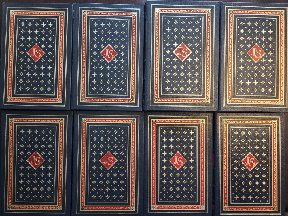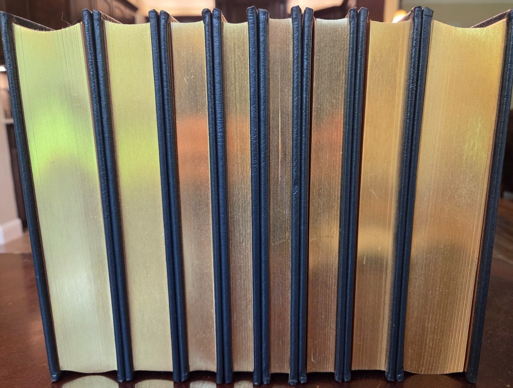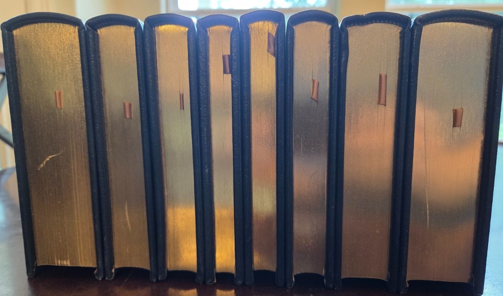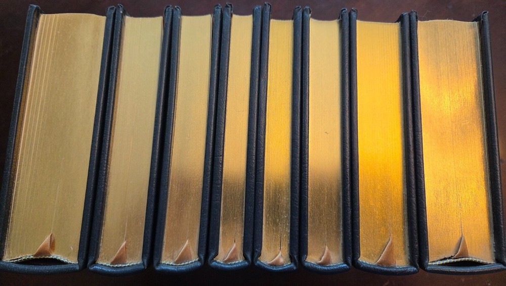 Complete 8 Volume John Steinbeck collection published by Easton Press. All books are bound in leather with ridged spines and still smell like new leather. There is a permanent ribbon page marker in each book. The page edges are gilded in gold, and a heavier long lasting acid neutral paper is used. None of these books have been read, just from my collection on my bookshelf for many years and a few moves. It's time to downsize and let someone else enjoy these beautiful books. The books included in this collection are: East of Eden The Pearl / The Long Valley Tortilla Flat Of Mice and Men The Red Pony Cannery Row The Winter of our Discontent The Grapes of Wrath One blank bookplate is included. Only The Red Pony has a bookplate installed. The books are like new, unread, clean covers and bindings with some very minor blemishes on the bottom page edge gilding. They come from a smoke free, pet free home. This is a wonderful set to add to your collection. FREE SHIPPING via USPS Media Mail. Don't hesitate to contact seller with any questions.