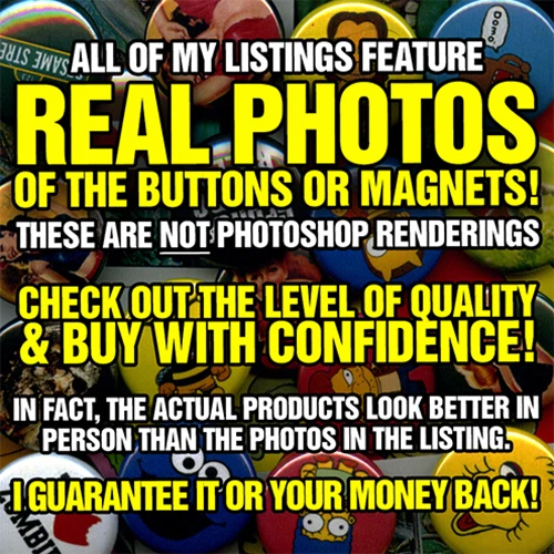 - MAGNET INFO - Each magnet is approximately 2" x 3" (or 50mm x 76mm) Made of a solid metal base with plastic backing and mylar coating, this heavyweight magnet is of the absolute highest quality. In other words, it's not a cheap "floppy" magnet printed on a home inkjet printer. This is the real deal commercial grade magnet. Lots of other sellers cut corners and use cheap, low grade equipment and materials. Not me. Quality is of the utmost importance and I know you will be 100% satisfied when you receive your order or your money back! - LISTING PHOTO INFO - The photo in this listing IS AN ACTUAL PHOTO OF THE MAGNETS! Unlike other sellers here on ebay, I dont use a digital photoshop generated rendering of the artwork. Im really proud of the quality of my magnets and have nothing to hide! eBay.com automatically compresses the quality of the image in this listing, so once your magnets arrive you'll see that they are even better looking in person. Guaranteed or your money back! - SHIPPING INFO - All orders are individually bagged and carefully packed in a bubble wrap lined kraft mailer to insure a safe delivery! Orders are generally shipped via USPS First Class mail with a 2-5 day delivery time within the USA. Most large orders will be shipped via USPS Priority with 1-3 day delivery time within the USA. If you need your order within in a certain time frame, please message me asap and I can make it happen! - SPECIAL ORDERS - If you need a higher quantity that is currently available in this listing, just message me to make arrangements. If you'd like to order anything to resell at your store, fleamarket, or anywhere but ebay, please get in touch for special pricing! PLEASE CHECK MY OTHER LISTINGS FOR MORE GREAT FRIDGE MAGNETS, BUTTONS, & MORE! - MAGNET INFO - Made of a solid metal base with plastic backing and mylar coating, this heavyweight magnet is of the absolute highest quality. In other words, it's not a cheap "floppy" magnet printed on a home inkjet printer. This is the real deal commercial grade magnet. Lots of other sellers cut corners and use cheap, low grade equipment and materials. Not me. Quality is of the utmost importance and I know you will be 100% satisfied when you receive your order or your money back! - LISTING PHOTO INFO - The photo in this listing IS AN ACTUAL PHOTO OF THE MAGNETS! Unlike other sellers here on ebay, I dont use a digital photoshop generated rendering of the artwork. Im really proud of the quality of my magnets and have nothing to hide! eBay.com automatically compresses the quality of the image in this listing, so once your magnets arrive you'll see that they are even better looking in person. Guaranteed or your money back! - SHIPPING INFO - All orders are individually bagged and carefully packed in a bubble wrap lined kraft mailer to insure a safe delivery! Orders are generally shipped via USPS First Class mail with a 2-5 day delivery time within the USA. Most large orders will be shipped via USPS Priority with 1-3 day delivery time within the USA. If you need your order within in a certain time frame, please message me asap and I can make it happen! - SPECIAL ORDERS - If you need a higher quantity that is currently available in this listing, just message me to make arrangements. If you'd like to order anything to resell at your store, fleamarket, or anywhere but ebay, please get in touch for special pricing! PLEASE CHECK MY OTHER LISTINGS FOR MORE GREAT FRIDGE MAGNETS, BUTTONS, & MORE!