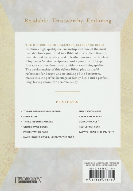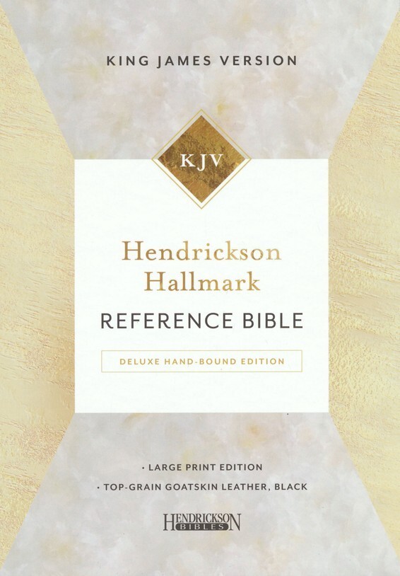 Product Description Hendrickson Publishers is proud to introduce the Hendrickson Hallmark Reference Bible- Deluxe Hand-Bound Edition in Large Print in top-grain goatskin leather. Hand-bound with care, this premium quality Bible was crafted with excellence on a detailed level including spine hubs, beautiful foil stamping, gilded page edges, and three ribbon markers. This newest addition to the Hendrickson Bible line offers a new tier for customers looking for the very best. Features: Top-grain goatskin leather Hand-bound lined-to-the-edge cover Foil stamping Spine hubs Three ribbon markers Gilded page edges Presentation page Full-color maps 2-piece box Verse references Concordance Red-letter text 11-pt. font size Product Information Title: Hendrickson Hallmark Reference Bible, KJV, Large Print, Deluxe Hand Bound, Top Grain Goatskin Leather, Black Format: Genuine Leather Number of Pages: 1632 Vendor: Hendrickson Publishers Publication Date: 2018 Dimensions: 9.25 X 6.00 X 1.50 (inches) Weight: 2 pounds 12 ounces ISBN: 1683071913 ISBN-13: 9781683071914 Text Color: Red Letter Text Size: 11 Point Thumb Index: No Ribbon Marker: Yes Spine: Sewn Page Gilding: Gold Stock No: WW071914 Imprintable: Yes I usually ship books USPS media mail. If there is no best offer option in the listing it is because I am not taking offers at this time. Thank you for viewing my item and have a nice day! (: