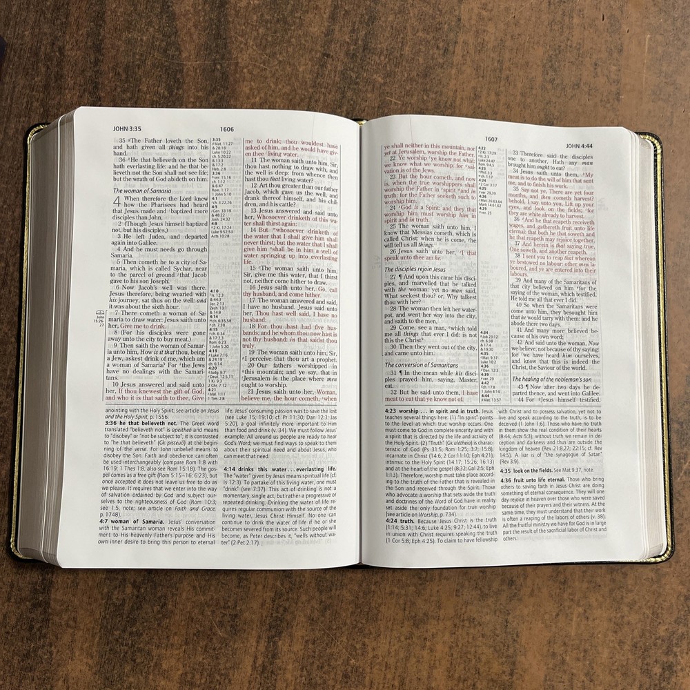 Brand new as described, Great deal, Nice blue and gray color, and Good quality binding. Love the silver edged paper lining. This is awesome Bible, which has all of the Special Features for studying. Packaged nicely and arrived earlier than expected. Excellent Seller and Customer Services. Thank you very much, and I will be visiting your storefront again soon. :))))))