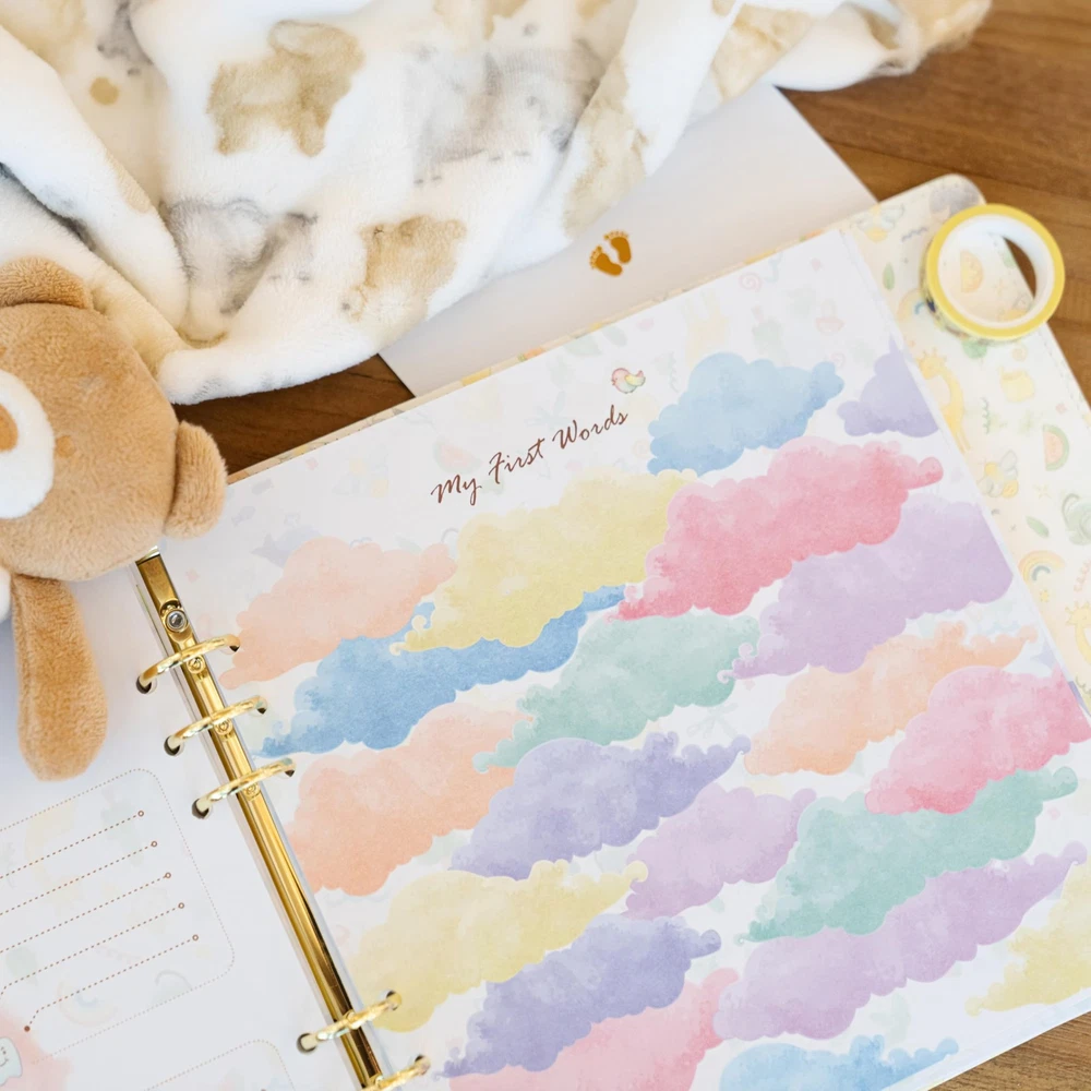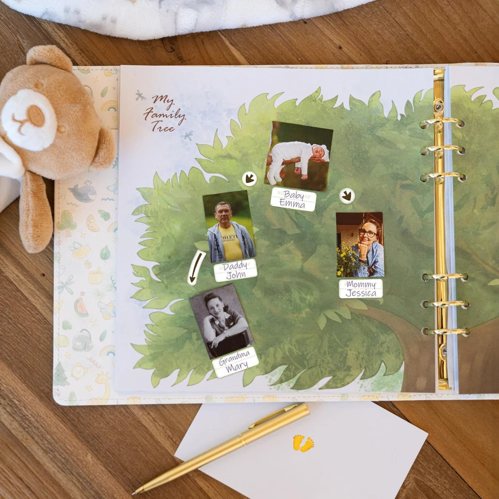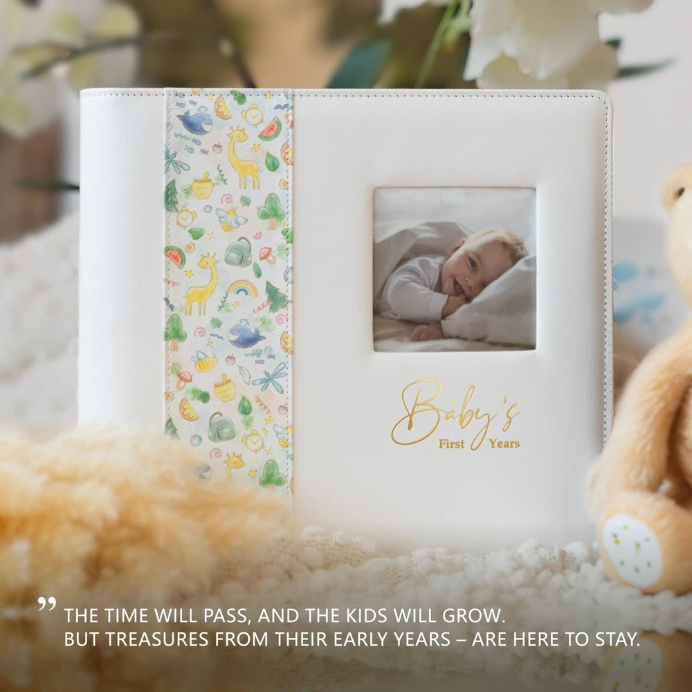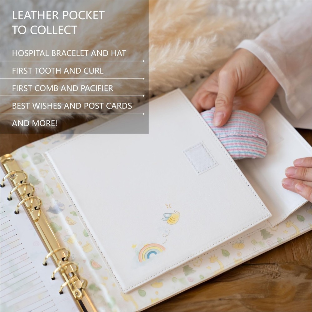 The baby milestone book is a great way to celebrate the beauty of a new life and capture all those precious milestone moments for years to come. The baby first memory book is a unique scrapbooking tool that gives you plenty of space for personal letters, stories, and photographs, as well as physical items such as your baby's drawings, hospital wristband, first tooth, first haircut, favorite small-size toys, and other memorable items your child has enjoyed. The beautifully illustrated baby photo book will guide you through your baby's first 5 years, and also record their firsts and development milestones, from baby shower to their first day of school. You get to pick exactly what goes into your baby’s first journal, and can choose from a variety of milestone stickers included in the set; also, you can add / remove pages by using the beautiful gold-style openable rings. The book sections comprise: A Letter to Future You, My Baby; Baby Shower; My Birth Story (the page reserves space for baby hand and footprint); Baby's Hand and Footprints; Average Prices and Top Headlines on the Day You Were Born; My Family Tree; Milestones (monthly for the first 12 months of life and annually for years 2-5); My First Birthday Story; And Now I Have Teeth; My First Words; Holiday Celebrations (no religious or cultural affiliation); My First Day of School; My Funny Quotes; and Advice and Wishes . You can also add additional pages for notes or photos, which are beautifully illustrated in the journal’s style. The Advice and Wishes pages can be used by your family and friends to send good vibes to your baby – use these for baby showers, family gatherings, and more. The durable leather cover and velvet bag included in the set will help secure your precious memories for years to come. The baby memory journal has a deep leather keepsake pocket on the back cover of the baby book to the most precious memorable items that belong to your baby. Faux Leather Cover – Durable, attractive 9" X 9" leather-bound baby album and memory book for boys and girls; 94 pages to keep your precious memories, simple unisex memory book from baby shower up to age 5. Loose-Leaf Openable Rings - Add your boy or girl's drawings, letters, and winners certificates. Consider adding extra pages to your baby photo album for notes and photos illustrated in the baby journal’s style. A beautiful baby diary and baby book childhood journal. Deep Keepsake Pocket - Beautiful baby 1st year memory book and a shower gift with a deep keepsake leather envelope to baby's hospital bracelet and other memorable items. Inclusive – The baby journal memory book is for all family types and both boys and girls. The baby keepsake book can accommodate any photo size / orientation and all holidays (no religious / cultural affiliation). The Album Set Includes - Leather-bound loose-leaf baby journal with a keepsake pocket, 160 milestone stickers (1" X 1"); 1 velvet storage case.