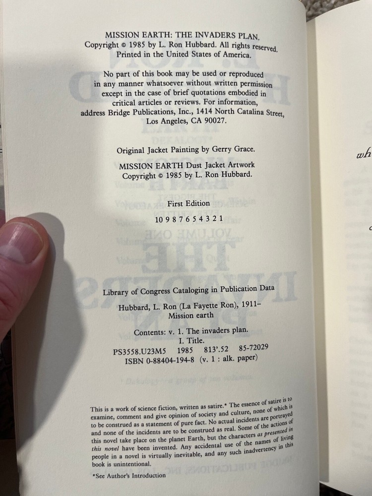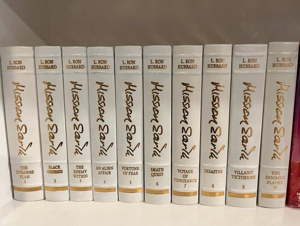 This is for L. Ron Hubbard's Mission Earth series. This is the very rare, white leatherbound limited edition set. They are all first printing, first edition. The entire series 1-10 is included. This is a beautiful set for any collectors of science fiction, Mission Earth fans or L. Ron Hubbard. These have gold gilt edges on acid free paper. As they have never been read, the pages are in perfect condition. I purchased these directly from the publisher. It was their last set, literally.
