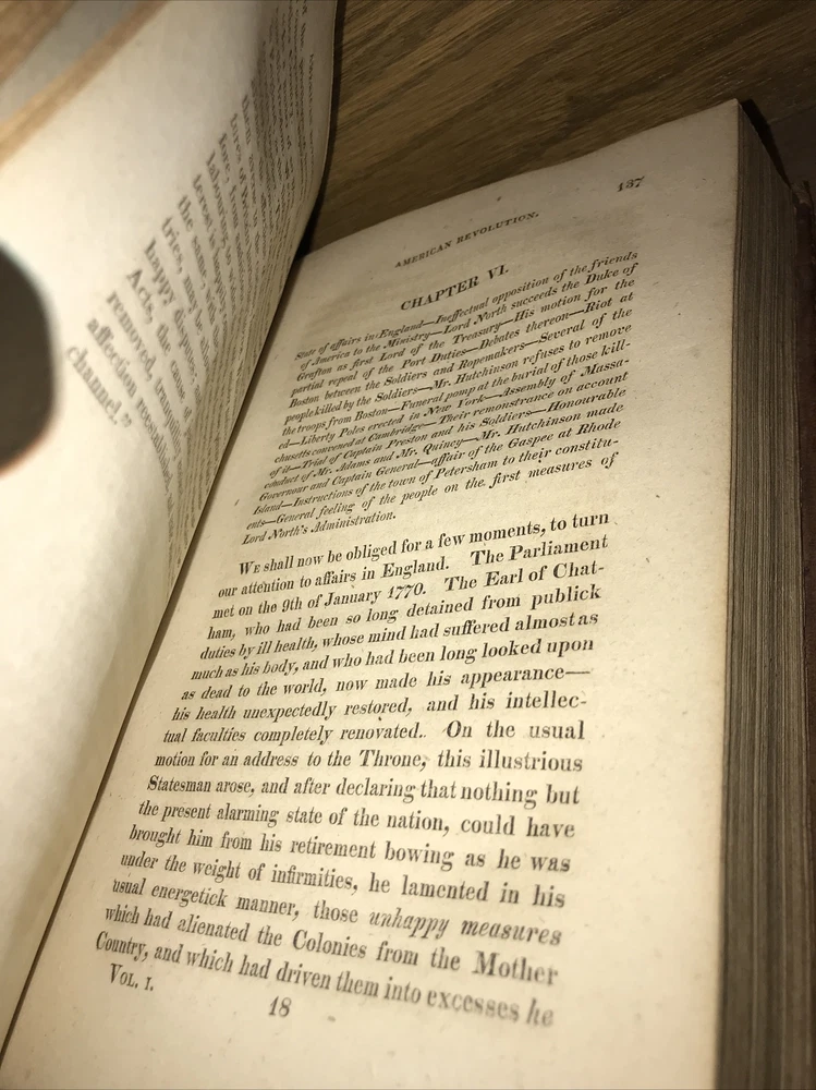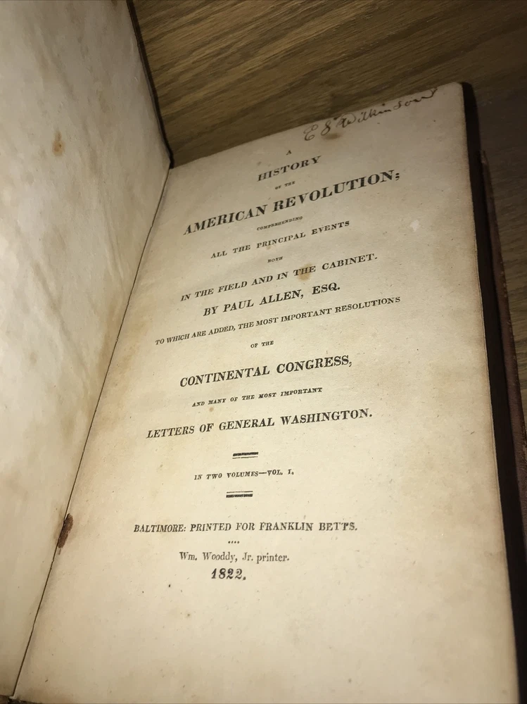 A History of the American Revolution. Printed in 1822. Complete in 2 volumes. The bindings are original. The first edition was in 1819. This 1822 edition is a first edition thus (by this publisher), using original sheets from the 1819 first edition, with a new title page. Printed on quality rag paper. The bindings are original. These measure 9 inches tall. Generalized wear. Front hinge volume one starting but strong. Very good condition overall. The bindings are original. These come protected in archival Mylar sleeves. Quality rag paper. This set will be well protected for shipping via Priority Mail. 2022.02.31