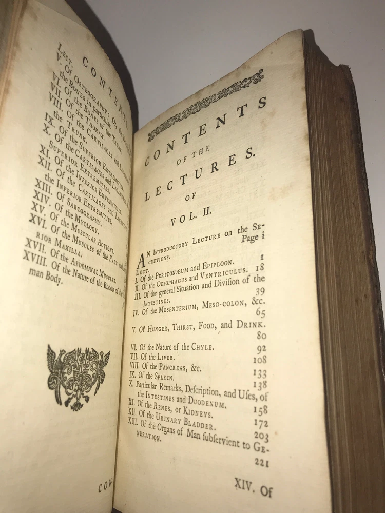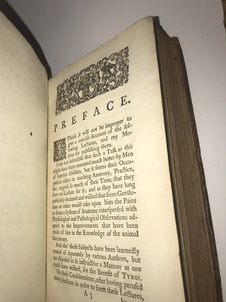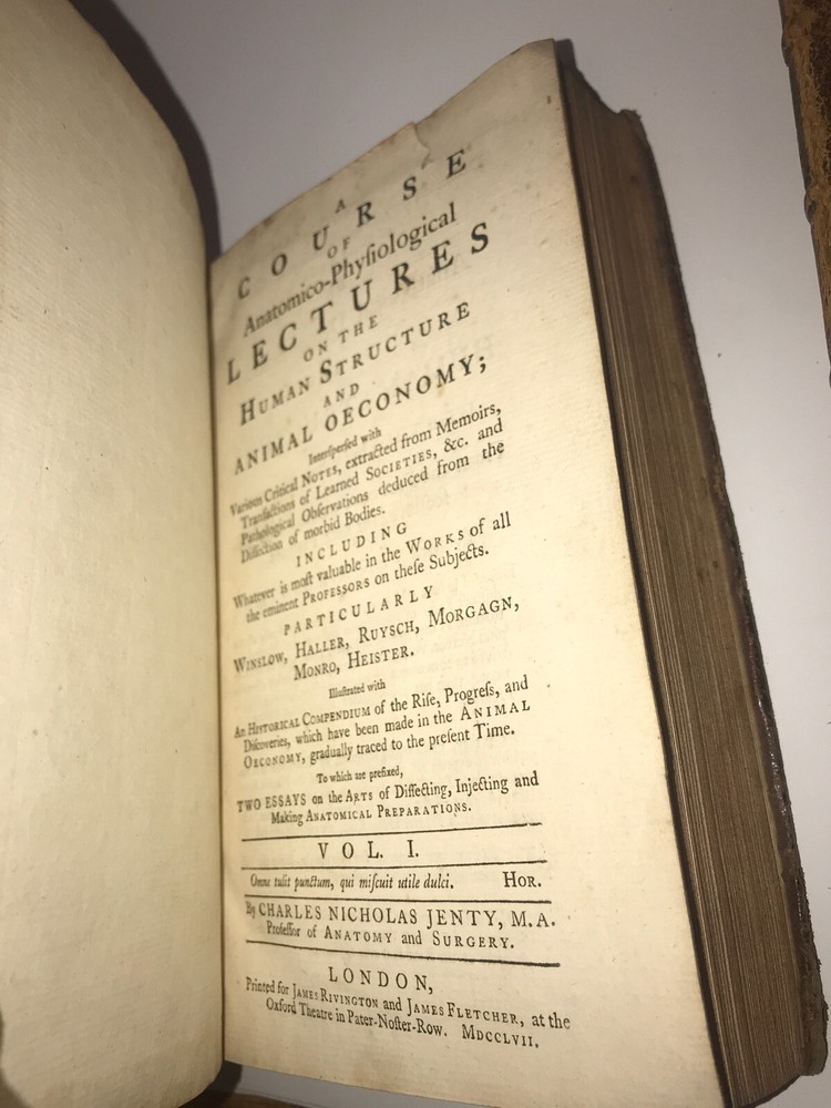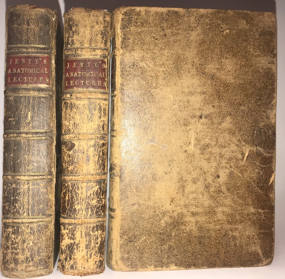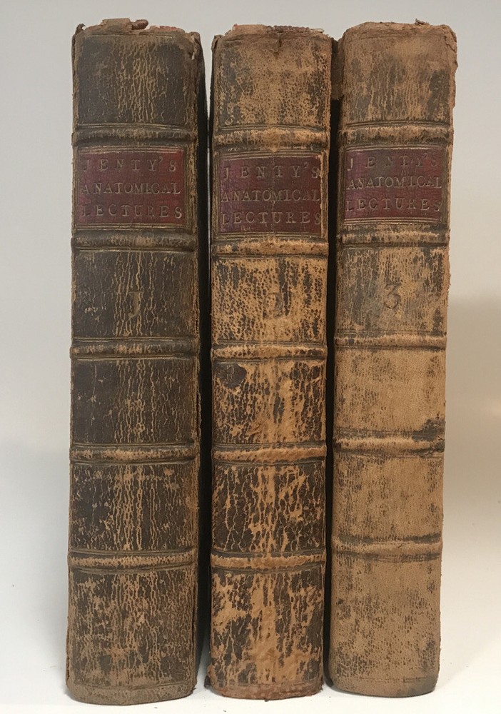 A COURSE OF ANATOMICO-PHYSIOLOGICAL LECTURES ON THE HUMAN STRUCTURE! Complete in 3 volumes. Printed in 1757. FIRST EDITION / FIRST PRINTING. This set is not illustrated. This set contains an advertisement o n the verso of the title page for his previous mezzotints. Those mezzotints in the advertisement currently retail at $5000 each, $35000 for a complete set. This set is not illustrated. By Nicholas Jenty, the famous author of: An essay on the Demonstration of the Human Structure, Half as Large as Nature, in Four Tables, from the Pictures Painted after Dissections, for that Purpose. (That book is impossible to find, was a massive undertaking to produce, and the plates sell individually at $5000. The most recent auction record for a single plate is $4750 + 15% = $5462.50, they’re scarce and they don’t come up for auction, which increases the value of this work by association.) This Anatomico-Physiological Lectures was printed the following year, and it includes an advertisement on the rear of the title page for the prior work, referencing the four tables done in mezzotints. This work printed the following year has significance on it’s own, as well as value by association with the significant mezzotints in the previous work.All works by Jenty are scarce. The print count was low and it is unlikely that these works will be available. Provenance: This set was imported from the United Kingdom from a large bookshop that acquired the Royal college Of Surgeon’s Library. This copy is not ex library. _______ By Charles Nicholas Jenty, the famous author of: Humanae structurae demonstrationes, An Essay on the Demonstration of the Human Structure, Half as Large as Nature, in Four Tables, from the Pictures Painted after Dissections, for that Purpose (London: Printed for, and Sold by, The Author, at his House in Fetter-Lane, and all the Eminent Booksellers in Europe, 1756). With 4 tables, a work near impossible to find, where each table/plate sells at $5000 each, making that entire work worth likely in excess of $35,000 - $50,000. All works by Jenty are scarce. This listing is for the First Edition of his Anatomico-Lectures, printed the following year, in 1757. ____ Concerning Jenty's life nothing is known except what is stated in his publications. He was born in Paris and trained in surgery there. By around 1756 he was living in London and lecturing on anatomy, and perhaps practicing surgery from his home. ALL OF HIS PUBLICATIONS ARE EXTREMELY RARE. Anatomie de la couleur 122; Roberts & Tomlinson p. 456. On the verso of the title page is the advertisement for his Anatomical Structures. This is a significant and seldom seen first edition on Anatomy. ___ A Course of Anatomico-Physiological Lectures on the Human Structure and Animal Oeconomy. Complete 3 volume set The rare First Edition. Published by James Rivington & James Fletcher, London, 1757 x, 400pp; xxx, 568pp; 605pp. CONDITION: Covers and spine worn. Volume I- Front cover weak but holding. Top right hand corner of title page clipped. Volume II - Wear to spine head. Volume III - Top one inch of fep removed. Signature of previous owner on prelims of volumes I and II. Occasional foxing. Content in good condition. All works by Jenty are scarce.