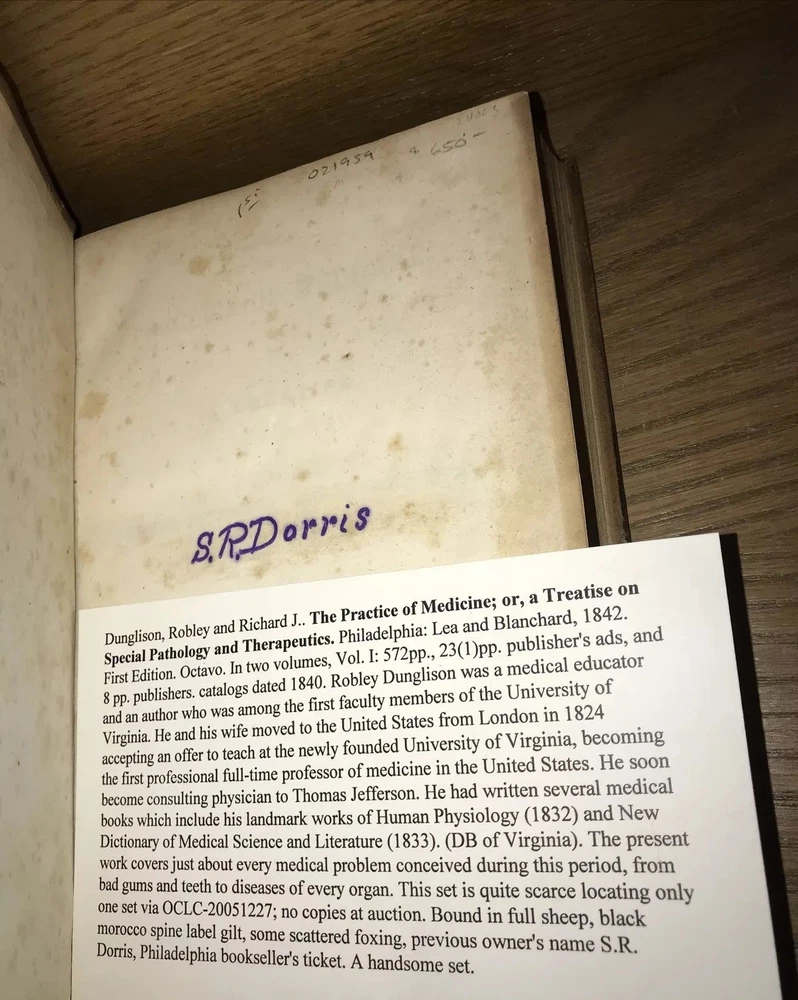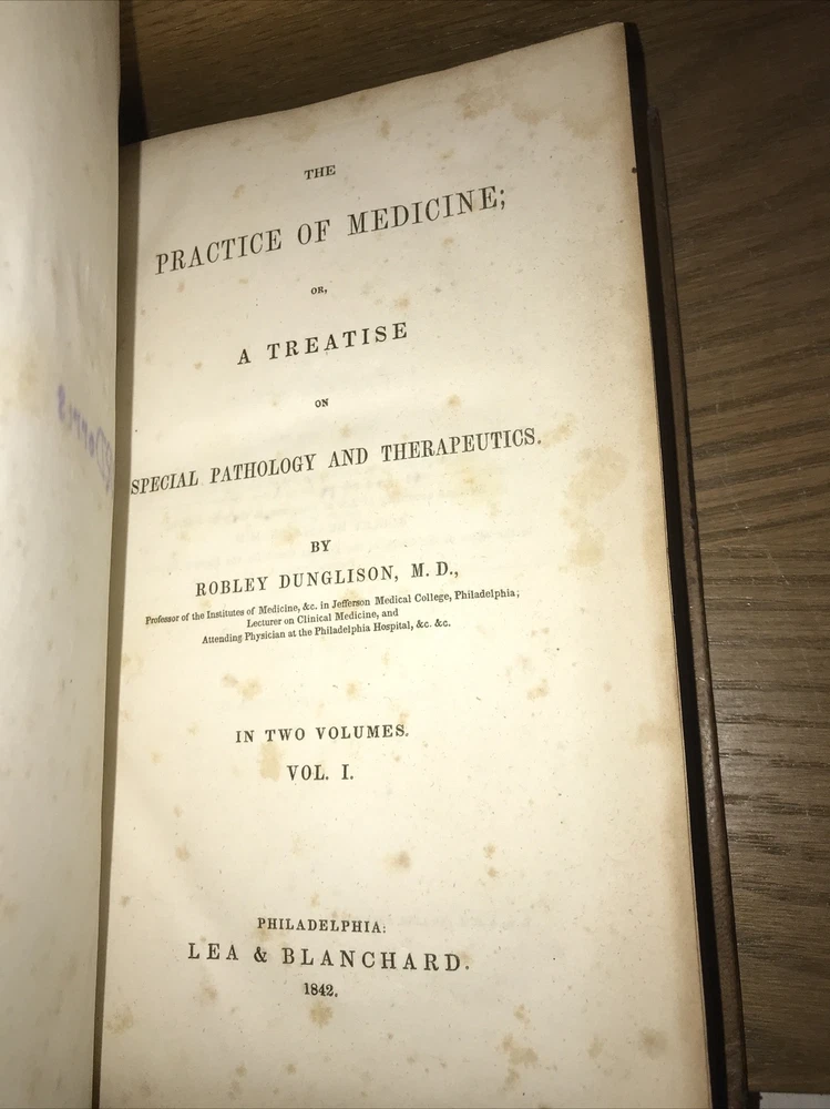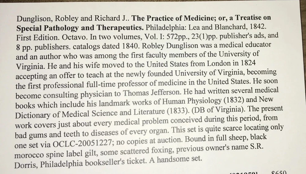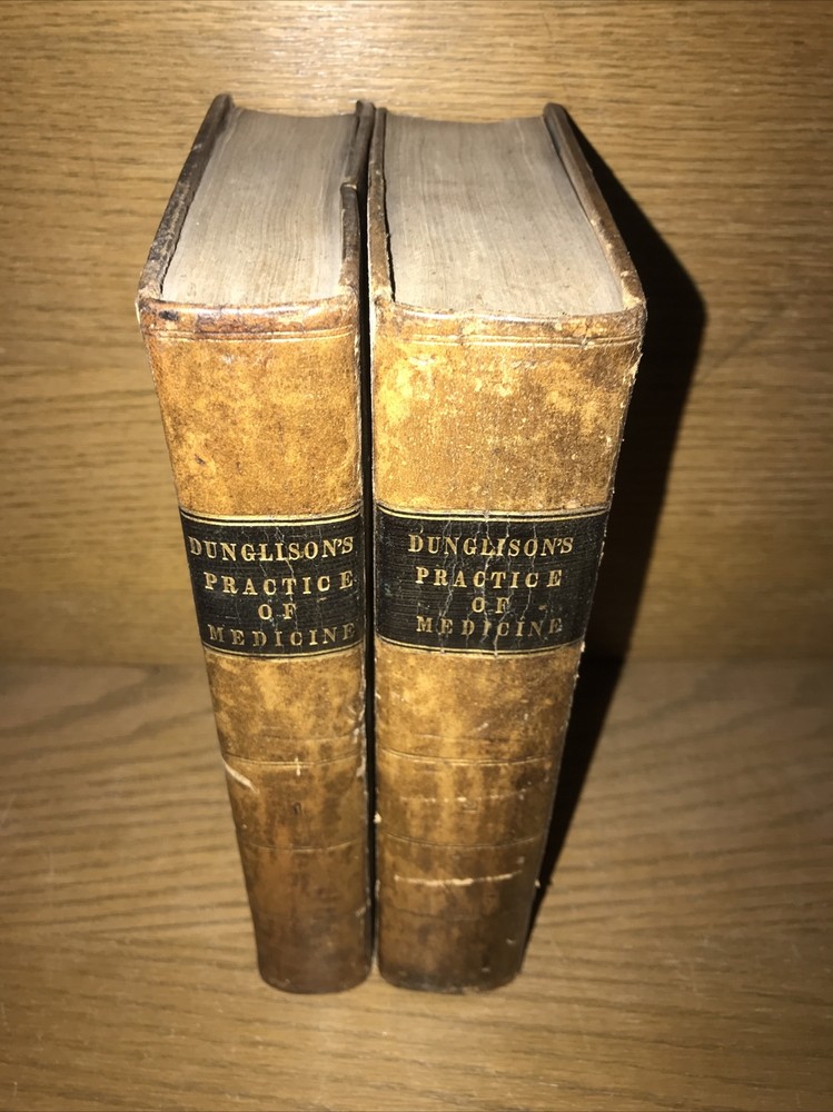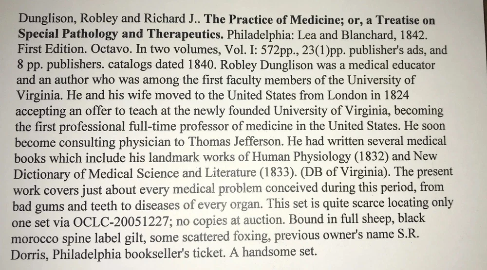 The Practice of Medicine; or, a Treatise on Special Pathology and Therapeutics. DUNGLISON, Robley and Richard J.. Philadelphia, Lea and Blanchard, 1842. First Edition. Octavo. In two volumes, Vol. I: 572pp., 23(1)pp. publisher’s ads, and 8 pp. publishers. catalog dated 1840. Robley Dunglison was a medical educator and an author who was among the first faculty members of the University of Virginia. He and his wife moved to the United States from London in 1824 accepting an offer to teach at the newly founded University of Virginia, becoming the first professional full-time professor of medicine in the United States. He soon become consulting physician to Thomas Jefferson. He had written several medical books which include his landmark works of Human Physiology (1832) and New Dictionary of Medical Science and Literature (1833) (DAB of Virginia). The present work is broad, from dentistry to diseases of every organ. This set is quite scarce locating only one set via OCLC-20051227; no copies at auction. Bound in full sheep, black morocco spine label gilt, some scattered foxing, previous owner’s name S.R. Dorris, Philadelphia bookseller ticket. Very good condition. Complete in two volumes. The bindings are original. The leather is supple and hinges sound. The paper is fresh. Light foxing. Complete in two volumes with an Index. These are large books, measuring 9 inches tall. Printed in 1842. Just prior to Gray’s Anatomy. Published by the same American publisher as Gray’s Anatomy. Gray’s Anatomy was published 16 years later, in 1858. This set will be well protected for shipping. Please see my other listings for similar books. 23.04