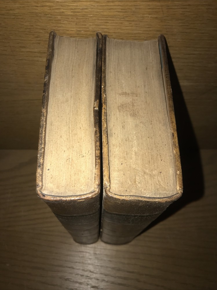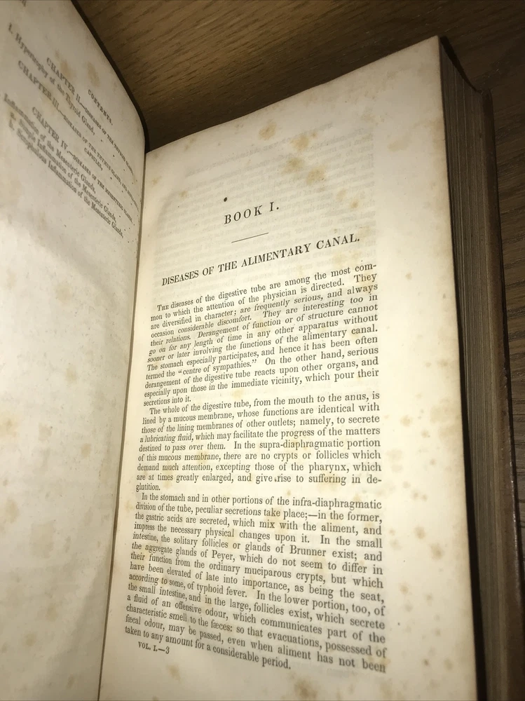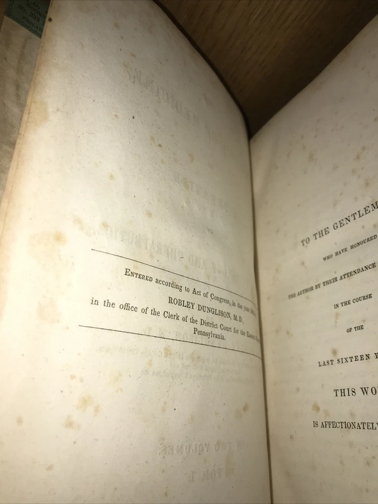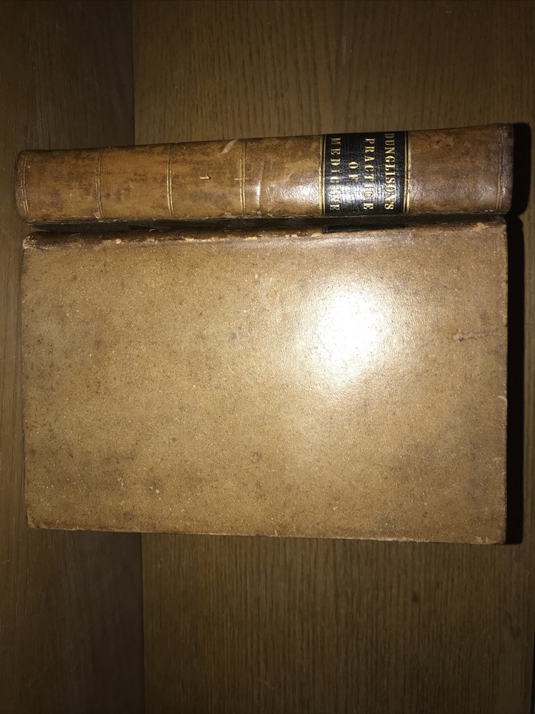 The Practice of Medicine; or, a Treatise on Special Pathology and Therapeutics. DUNGLISON, Robley and Richard J.. Philadelphia, Lea and Blanchard, 1842. First Edition. Octavo. In two volumes, Vol. I: 572pp., 23(1)pp. publisher’s ads, and 8 pp. publishers. catalog dated 1840. Robley Dunglison was a medical educator and an author who was among the first faculty members of the University of Virginia. He and his wife moved to the United States from London in 1824 accepting an offer to teach at the newly founded University of Virginia, becoming the first professional full-time professor of medicine in the United States. He soon become consulting physician to Thomas Jefferson. He had written several medical books which include his landmark works of Human Physiology (1832) and New Dictionary of Medical Science and Literature (1833) (DAB of Virginia). The present work is broad, from dentistry to diseases of every organ. This set is quite scarce locating only one set via OCLC-20051227; no copies at auction. Bound in full sheep, black morocco spine label gilt, some scattered foxing, previous owner’s name S.R. Dorris, Philadelphia bookseller ticket. Very good condition. Complete in two volumes. The bindings are original. The leather is supple and hinges sound. The paper is fresh. Light foxing. Complete in two volumes with an Index. These are large books, measuring 9 inches tall. Printed in 1842. Just prior to Gray’s Anatomy. Published by the same American publisher as Gray’s Anatomy. Gray’s Anatomy was published 16 years later, in 1858. This set will be well protected for shipping. Please see my other listings for similar books. 23.04
