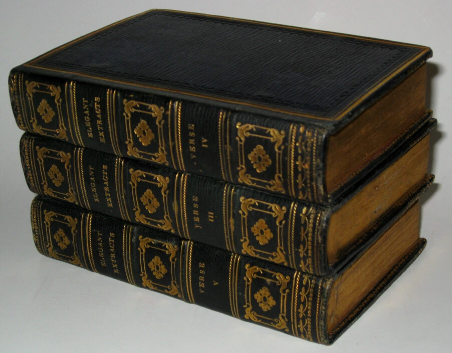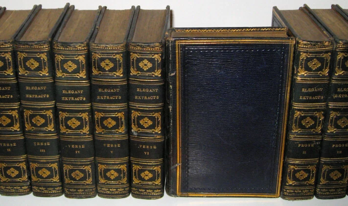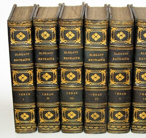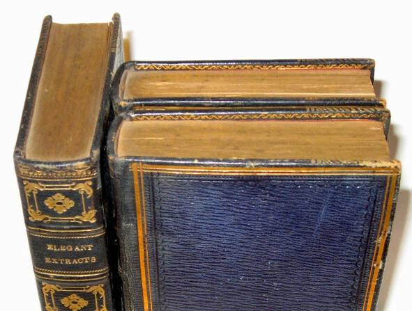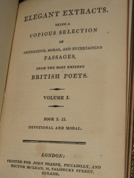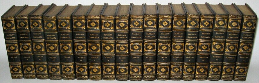 ELEGANT EXTRACTS! ELEGANT EXTRACTS: B eing a copious selection of instructive, moral and entertaining passages from the most eminent British poets. Complete in 18 volumes. Bound in the highest quality full tooled leather. Printed on rag paper. These measure 5 1/4 inches tall. This is an endearing set. This set is a FIRST EDITION/FIRST PRINTING, of this improved 'copious selection', based on the original set, originally compiled by THE REV. VICESIMUS KNOX, D.D. initially intended for a younger audience. This set is still bound in the original 200+ year old, full tooled moroccan leather bindings. The leather is still supple despite being almost 220 years old. The hinges are all fully attached and sound. This set looks like it sat in a box for 220 years. There is no date printed on the title page. This set was printed between 1803-1809. John Sharpe printed from 1803-1809 at this Picadilly address. From 1809 to 1829 he had an address 'Opposite York House'. He died in 1829. Later Editions by Sharpe are ' Printed by Howlett & Brimmer, Soho', and are dated 1820. This set is the FIRST EDITION by Sharpe, printed at his Picadilly address. There is no date printed on the title page. This set was printed between 1803-1809. This set is 200 years old, and is still bound in the original full moroccan bindings. This is a gorgeous and highly endearing set, bound in a highly elaborate and expensive binding. Elegant Extracts: Prose, Poetry & Epistles. Complete in 18 volumes. [Printed circa 1803-1809.] This set is comprised of 3 subsets: Elegant Ext racts from the Most Eminent British Poets (complete in 6-vols). Elegant Extracts from the Most Eminent Prose Writers (complete in 6-vols). Elegant Epistles from the Most Eminent Epistolary Writers (complete in 6-vols). This set is complete with all 3 subsets of 6 volumes each; and is complete in 18 volumes total. Complete in 18 volumes. This is an important version of Elegant Extracts; the FIRST EDITION of this iteration, designed for adults. Originally compiled in the late 1700's by: THE REV. VICESIMUS KNOX, D.D. as ' ELEGANT EXTRACTS, OR USEFUL AND ENTERTAINING PASSAGES, FROM THE BEST ENGLISH AUTHORS AND TRANSLATIONS; PRINCIPALLY DESIGNED FOR THE USE OF YOUNG PERSONS.' This is a thorough collection of literature. Each volume has an engraved title page. This set is printed on quality rag paper. These are small books intended to be carried by the reader. These are more pocket sized than miniature. These measure 5 1/4 inches tall. This is an endearing set. This set is still bound in the original bindings. Rich blue, full morocco with extensive gilding, trimming, and gilt frames to the boards. All edges are cased in gilt. These are the original full-leather bindings. These display beautifully. London: John Sharpe, et al... (no date, printed circa 1803-1809). CONDITION : A truly gorgeous set. Exceedingly well preserved. This set is in exceptional condition despite it's sheer age. These are the original 200+ year old bindings. The leather is still supple and the hinges all sound. This set is exceedingly supple and fresh. Printed on quality rag paper, and well laid out. This set looks to have sat in a box for over 200 years. Very Good condition. Some generalized shelf wear/rubs. Light general wear and abrasions. Hinges are all strong and sound. Some minor foxing. Printed on quality rag paper. There is an early name. This set is still bound in the original 200+ year old bindings. This is an incredibly endearing set. This is a thorough collection of literature consisting of 3 subsets: Elegant Extracts. from the Most Eminent British Poets (6-vols). Elegant Extracts. from the Most Eminent Prose Writers (6-vols). Elegant Epistles from the Most Eminent Epistolary Writers (6-vols). Complete in 18 volumes total. A sample of content: Ancient and Classical Cicero Julius Caesar Tacitus, etc. Modern: Queen Anne to King Henry VIII Hooke Lord Bacon Queen Elizabeth Mr. Locke, etc Alexander Pope Joseph Addison Gay Swift, etc Rousseau Franklin Beattie Goldsmith Prior Green Cowper Cowley Milton Johnson Crabbe Churchill Young Pitt Sheridan Shakespeare Dryden Sterne Hume Smollett Voltaire and HUNDREDS more 1149 OOT Set is attributed to: Vicesimus Knox From Wikipedia, the free encyclopedia Jump to navigation Jump to search Vicesimus Knox, 1809 engraving Vicesimus Knox (1752–1821) was an English essayist, headmaster and Anglican priest. Contents 1 Life 2 Views 2.1 War and peace 2.2 Novels 3 Works 4 Family 5 Notes 6 Further reading Knox was born December 8, 1752, at Newington Green , Middlesex , the son of Vicesimus Knox (1729–1780), a cleric and schoolmaster, and his wife Ann Wall, daughter of Devereux Wall. He was educated at St John's College, Oxford , matriculating in 1771 graduating in 1775. Meanwhile, his father became headmaster of Tonbridge School in 1772. Knox became a Fellow of his college, and was ordained by Robert Lowth , becoming deacon in 1775 and priest in 1776. [1] [2] Knox replaced his father, who was in poor health, as headmaster of Tonbridge School in 1778. He was successful in raising the number of pupils, from around 20 to around 80. [1] Among Knox's students were Charles Girdlestone and John Mitford . [3] [4] During the 1790s Knox was critical of British foreign policy, [5] towards France and Poland, in articles written for the Morning Chronicle . [6] The pupil numbers at the school fell back again, after his unpopular views became known. [7] Knox accumulated some livings: Shipborne (1800, a chapelry, as bequest from William Holles Vane, 2nd Viscount Vane ), Ramsden Crays (1801), and Runwell (1807). But he did not become vicar of Tonbridge when the incumbent Henry Harpur died in 1790, the advowson passing out of the Vane family (to David Papillon), and John Rawstorn Papillon being appointed. Theophilus Lindsey had an account from Henry Austen of West Wickham of Knox acting as stand-in after Harpur's death, as a showy preacher who made pointed remarks about Unitar