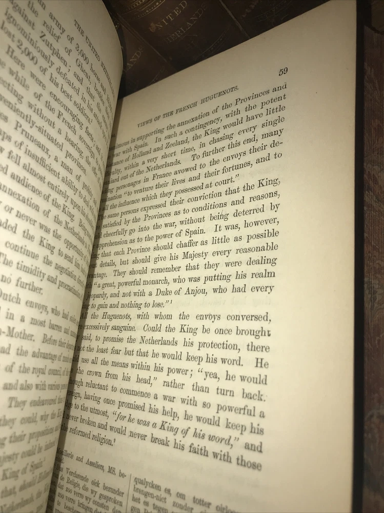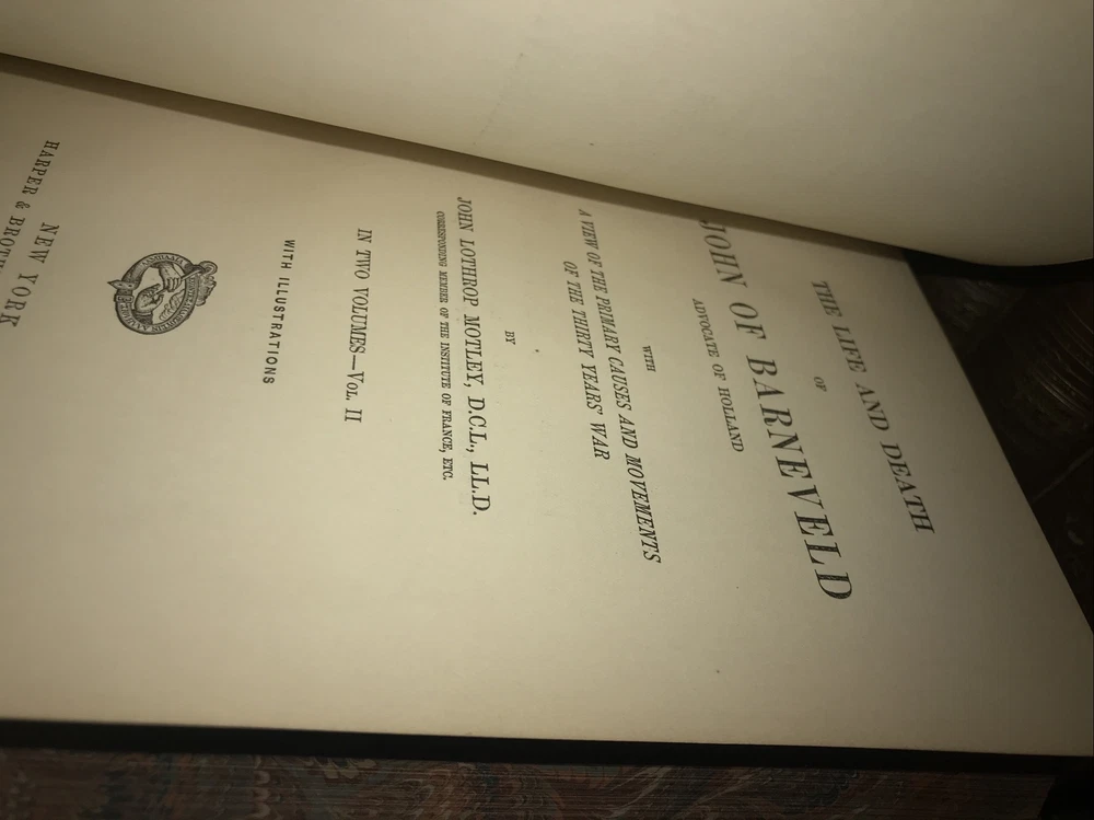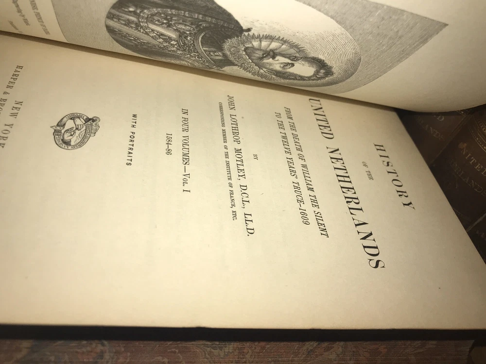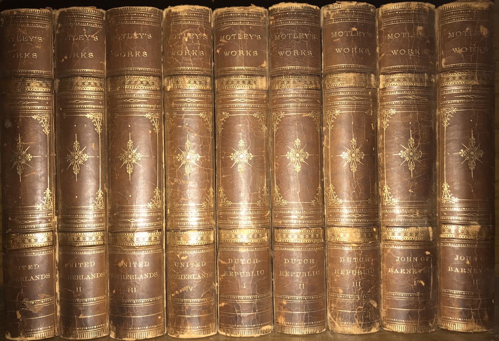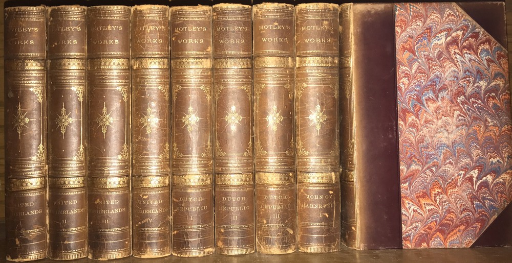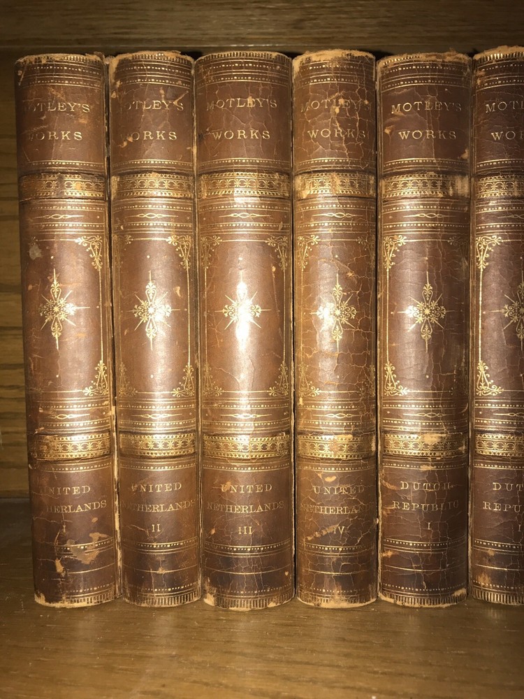 Complete in 9 volumes, which is standard. History of the United Netherlands complete in 4. Dutch Republic complete one 3. John of Barnevale in 2. The bindings are original. Quality leather. Copyright 1888, and 1874. Some spine scuffing and abrasions. All hinges strongly attached. Quality paper is fresh and well preserved. A high quality set bound in calf leather. Marbled end papers and edges. Light shelf wear. In very good condition. Some spine abrasion. A good old display set. Each book will be individually wrapped and well protected for shipping via Priority Mail. 4.3.21