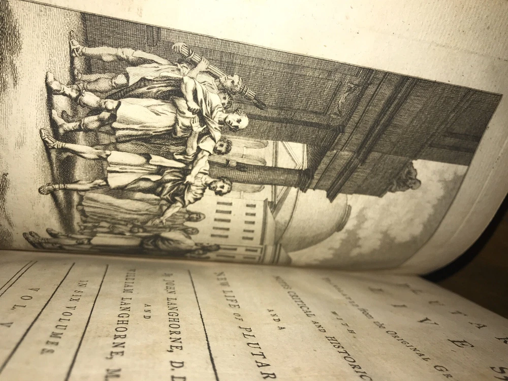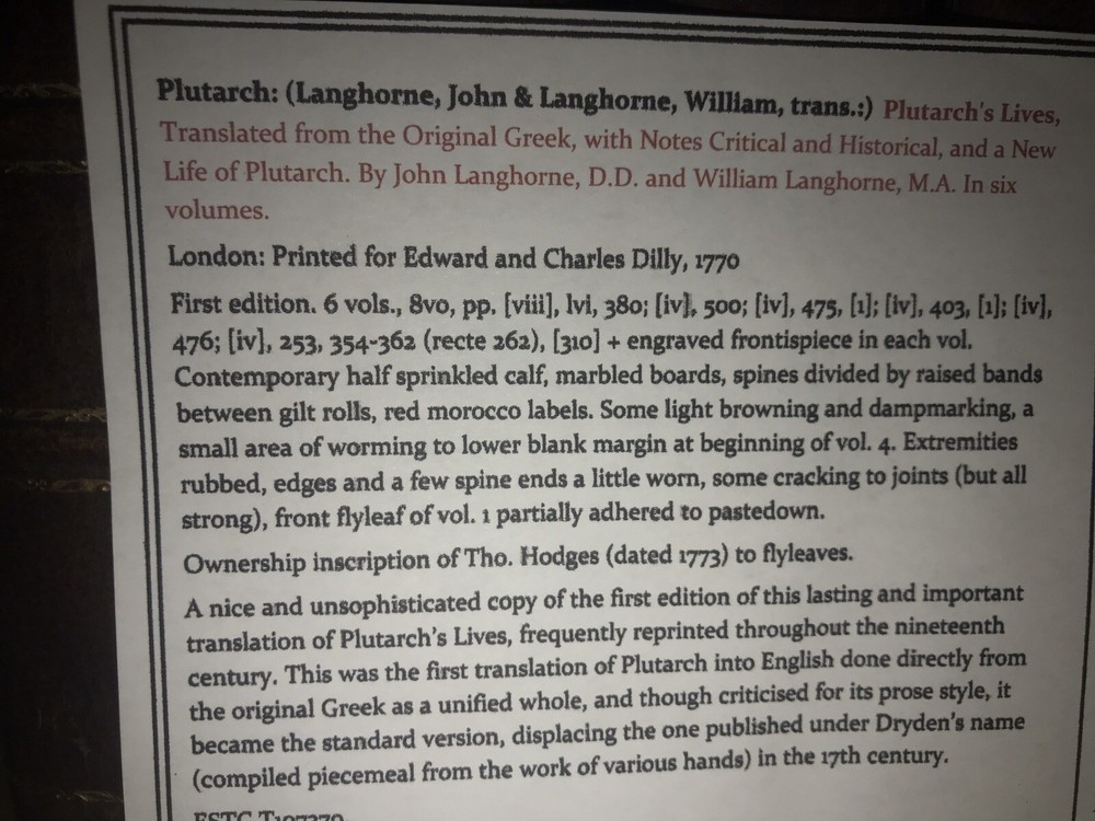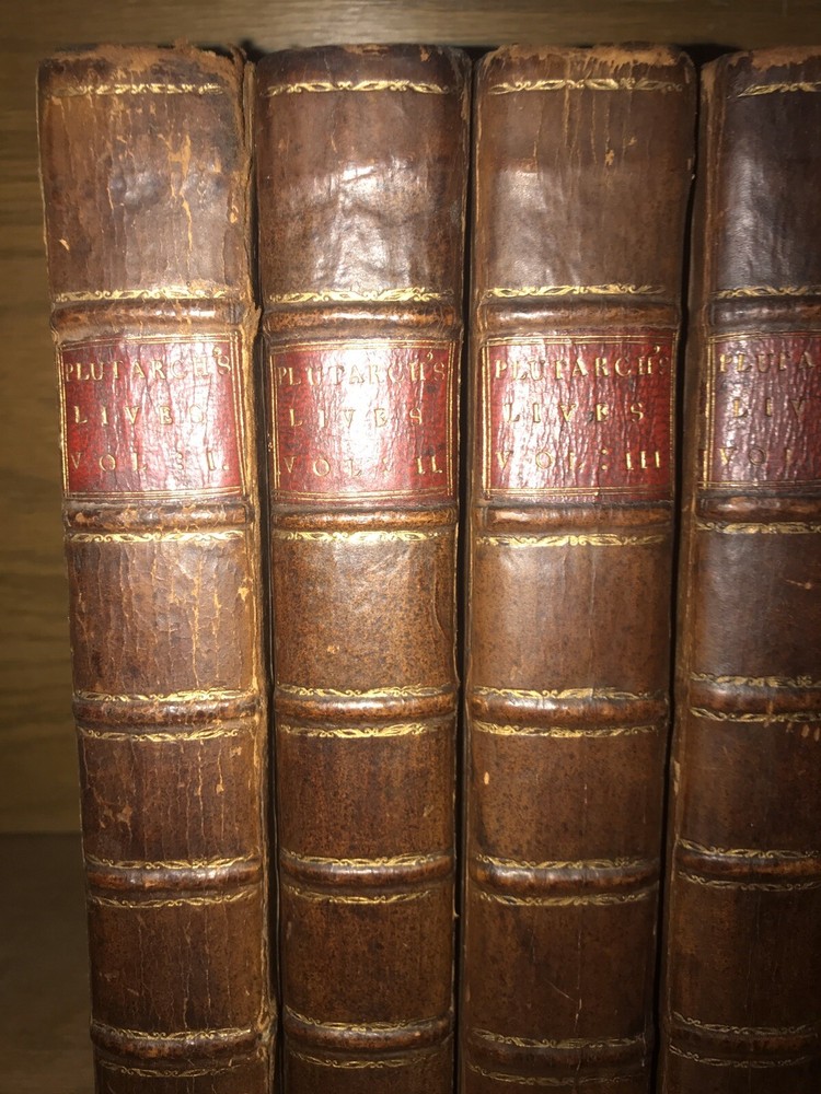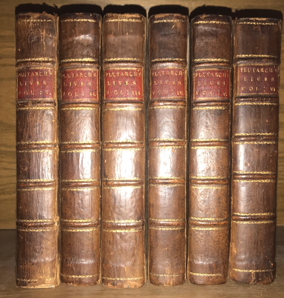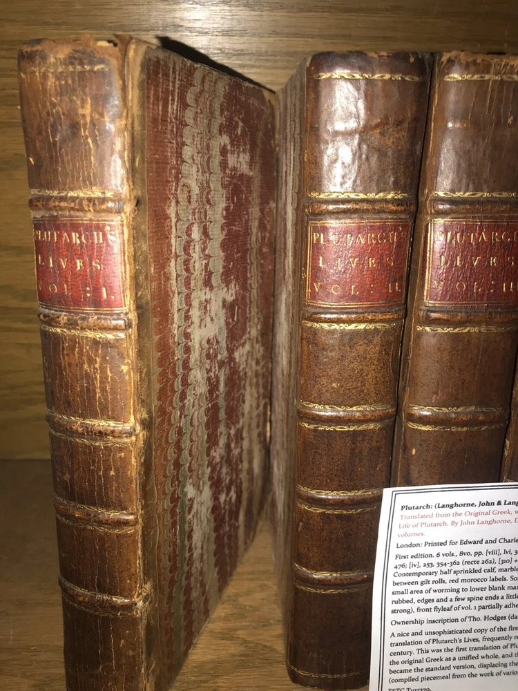 Printed in 1770. First edition of this translation by John and William Langhorne. Previously only translated by under Dryden's name (compiled piecemeal from the work of various hands). This is the first edition of Langhorne’s translation. It became the standard version. This is a significant set. ———— This was the first translation of Plutarch into English done directly from the original Greek as a unified whole, and though criticised for its prose style, it became the standard version, displacing the one published under Dryden's name (compiled piecemeal from the work of various hands) in the 17th century. ESTC T107379 Printed in English. Complete in 6 volumes. The bindings are original. All 6 frontisplates are present. Printed on rag paper that is still fresh. In remarkable condition. All hinges strongly attached. Hinges are starting. Spine labels are all present. Approximately 8.75 inches tall. Each book will be individually wrapped and well protected for shipping via Priority Mail. Plutarch's Lives, Translated From The Original Greek, With Notes Critical And Historical, And A New Life Of Plutarch. By John Langhorne, D.D. And William Langhorne, M.A. In Six Volumes. By Plutarch (Langhorne, John & Langhorne, William, Trans.)London: Printed for Edward and Charles Dilly, 1770 First edition. 6 vols., 8vo, pp. [viii], lvi, 380; [iv], 500; [iv], 475, [1]; [iv], 403, [1]; [iv], 476; [iv], 253, 354-362 (recte 262), [310] + engraved frontispiece in each vol. Contemporary half sprinkled calf, marbled boards, spines divided by raised bands between gilt rolls, red morocco labels. Some light browning and dampmarking, a small area of worming to lower blank margin at beginning of vol. 4. Extremities rubbed, edges and a few spine ends a little worn, some cracking to joints (but all strong), front flyleaf of vol. 1 partially adhered to pastedown. Ownership inscription of Tho. Hodges (dated 1773) to flyleaves. A nice and unsophisticated copy of the first edition of this lasting and important translation of Plutarch's Lives, frequently reprinted throughout the nineteenth century. This was the first translation of Plutarch into English done directly from the original Greek as a unified whole, and though criticised for its prose style, it became the standard version, displacing the one published under Dryden's name (compiled piecemeal from the work of various hands) in the 17th century. ESTC T107379 2022.06.03