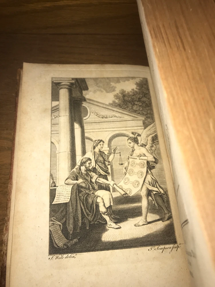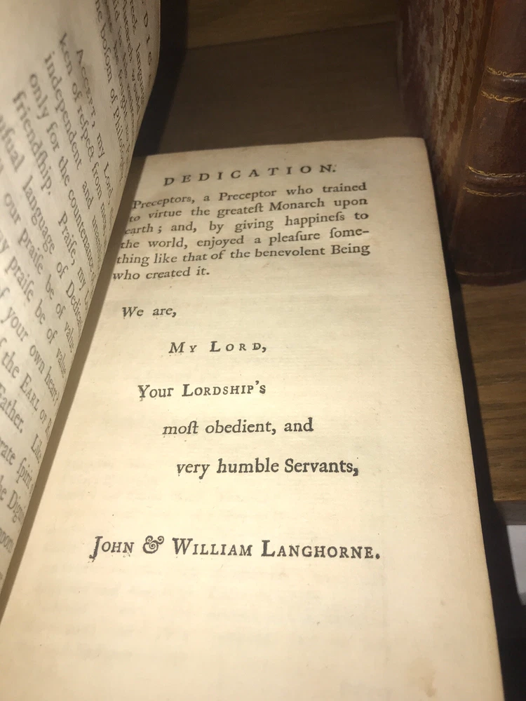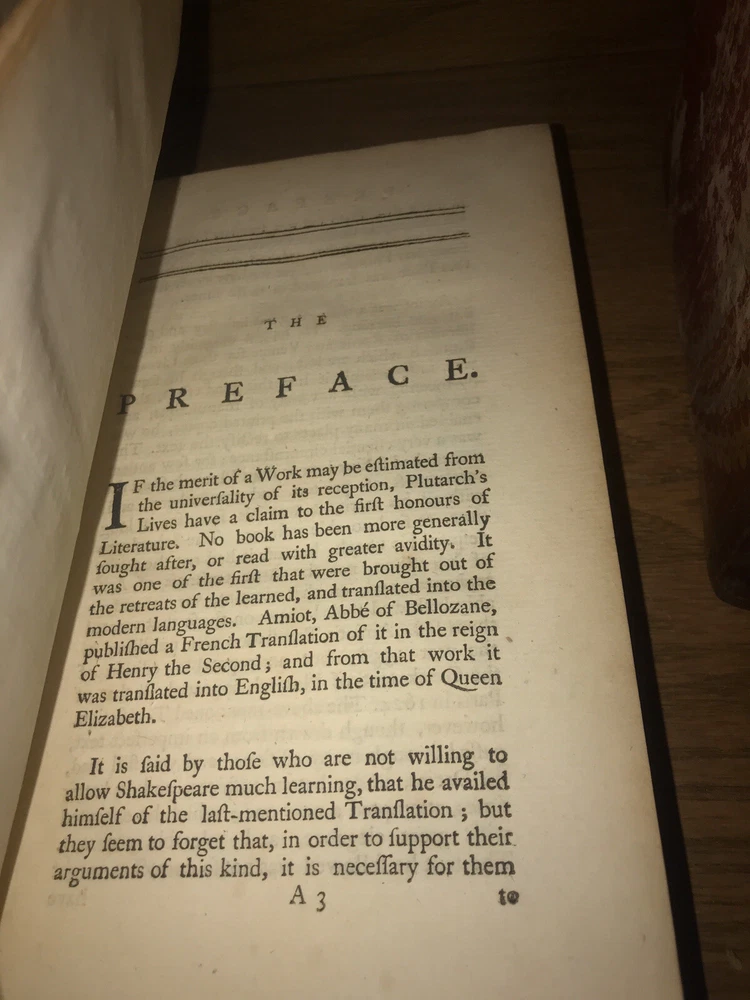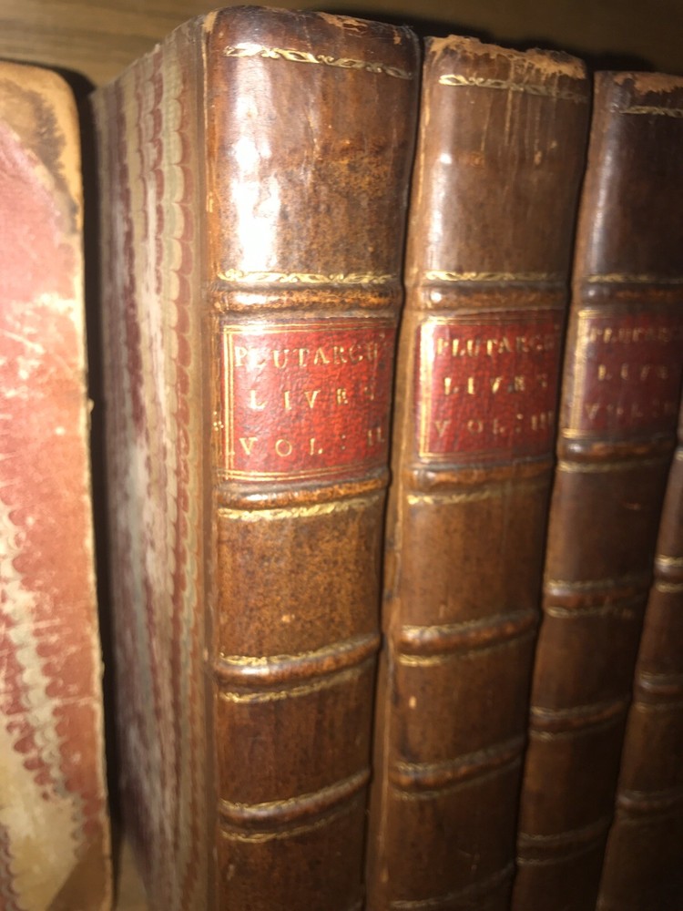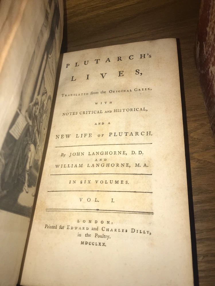 Printed in 1770. First edition of this translation by John and William Langhorne. Previously only translated by under Dryden's name (compiled piecemeal from the work of various hands). This is the first edition of Langhorne’s translation. It became the standard version. This is a significant set. ———— This was the first translation of Plutarch into English done directly from the original Greek as a unified whole, and though criticised for its prose style, it became the standard version, displacing the one published under Dryden's name (compiled piecemeal from the work of various hands) in the 17th century. ESTC T107379 Printed in English. Complete in 6 volumes. The bindings are original. All 6 frontisplates are present. Printed on rag paper that is still fresh. In remarkable condition. All hinges strongly attached. Hinges are starting. Spine labels are all present. Approximately 8.75 inches tall. Each book will be individually wrapped and well protected for shipping via Priority Mail. Plutarch's Lives, Translated From The Original Greek, With Notes Critical And Historical, And A New Life Of Plutarch. By John Langhorne, D.D. And William Langhorne, M.A. In Six Volumes. By Plutarch (Langhorne, John & Langhorne, William, Trans.)London: Printed for Edward and Charles Dilly, 1770 First edition. 6 vols., 8vo, pp. [viii], lvi, 380; [iv], 500; [iv], 475, [1]; [iv], 403, [1]; [iv], 476; [iv], 253, 354-362 (recte 262), [310] + engraved frontispiece in each vol. Contemporary half sprinkled calf, marbled boards, spines divided by raised bands between gilt rolls, red morocco labels. Some light browning and dampmarking, a small area of worming to lower blank margin at beginning of vol. 4. Extremities rubbed, edges and a few spine ends a little worn, some cracking to joints (but all strong), front flyleaf of vol. 1 partially adhered to pastedown. Ownership inscription of Tho. Hodges (dated 1773) to flyleaves. A nice and unsophisticated copy of the first edition of this lasting and important translation of Plutarch's Lives, frequently reprinted throughout the nineteenth century. This was the first translation of Plutarch into English done directly from the original Greek as a unified whole, and though criticised for its prose style, it became the standard version, displacing the one published under Dryden's name (compiled piecemeal from the work of various hands) in the 17th century. ESTC T107379 2022.06.03