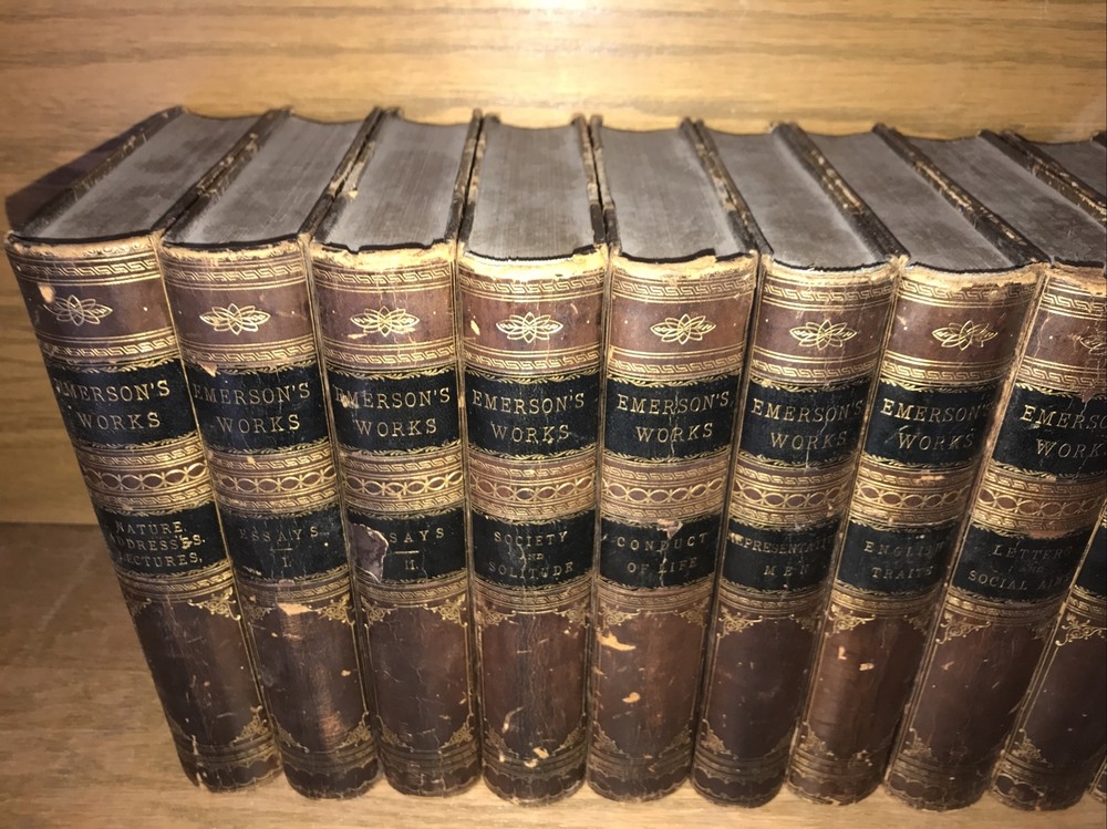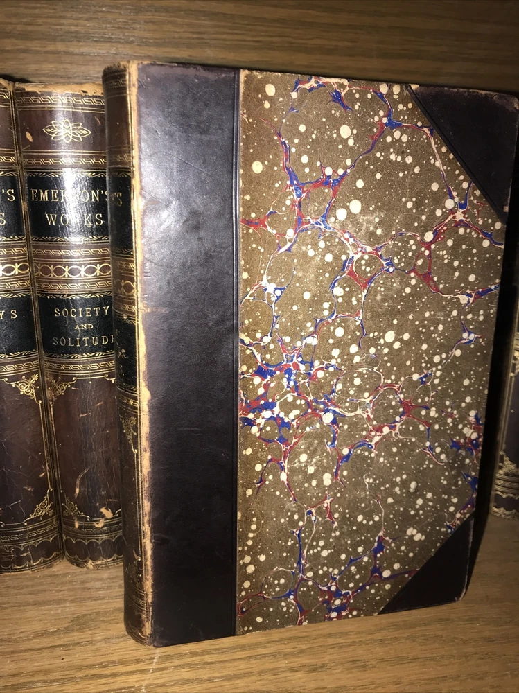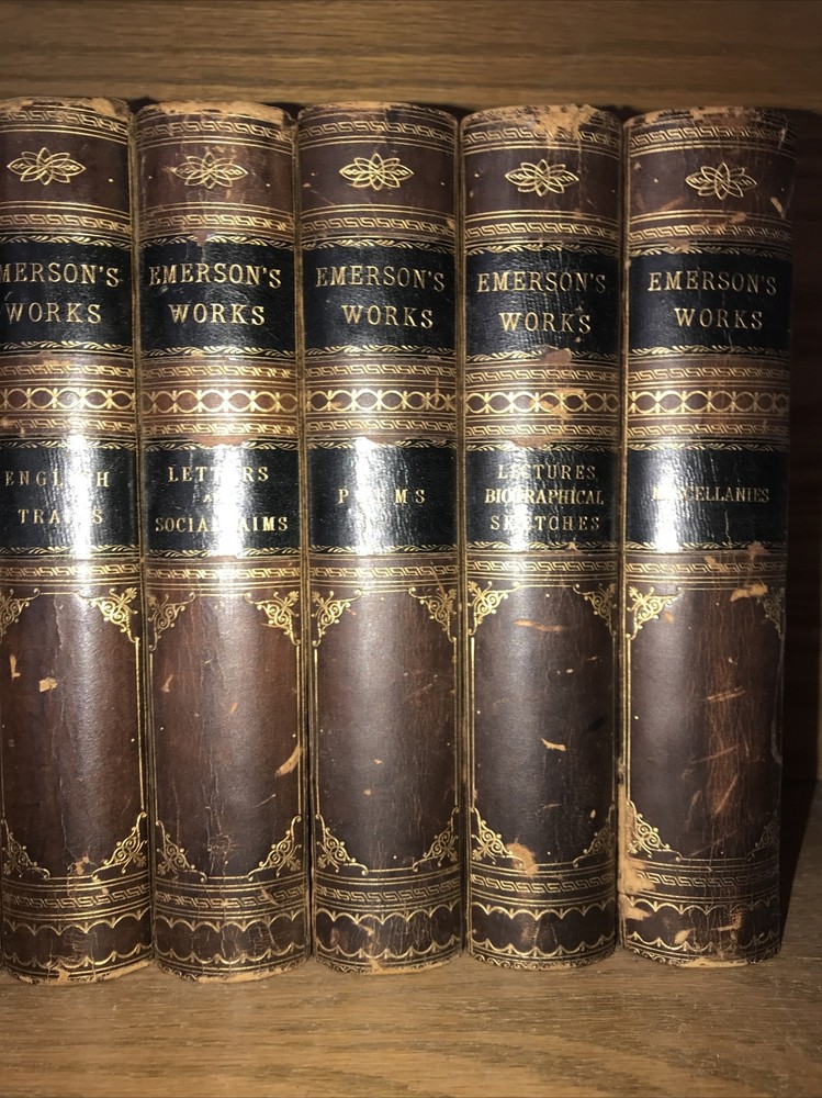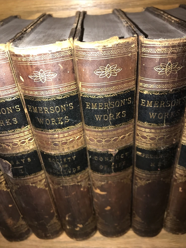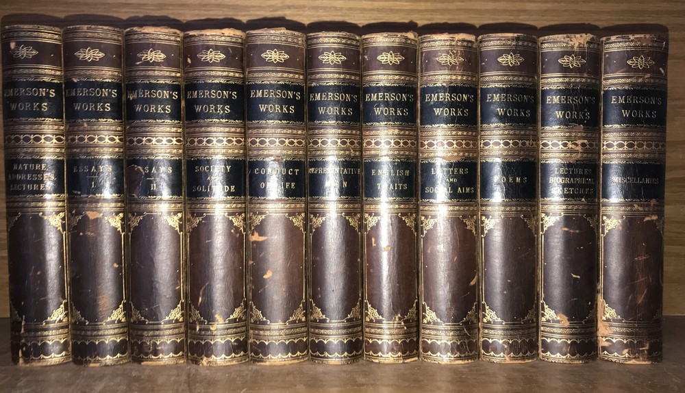 Complete in 11 volumes. Printed in 1884. 1884 is extremely early for Emerson. Set is dated 1884 on the title pages. Presumably the first edition of the Riverside Edition by Houghton Mifflin. Copyright 1883, title pages dated 1884. Thus set was reprinted into the early 1900’s. It’s extremely difficult to find Emerson from 1883. Set is remarkably well preserved. Internally the paper is fresh bright and clean. Set looks unread. The bindings have extremity abrasions and scuffs. Some gouges and scuffs in the spines and head caps. Leather supple. Hinges all sound. Each book will be individually wrapped and well protected for shipping via Priority Mail. Set has extremity abrasions as shown in the pictures. Wear at spine heads. The half titles list each volume number. The miscellanies is volume 11. 11 is standard for early Emerson. Set is complete. The bindings are original. Set has 2 old bookplates. Quality paper. The bindings are the original Victorian hindings. The bindings are original. 8 inches tall. Each book will be individually wrapped for shipping. 2022.03.10