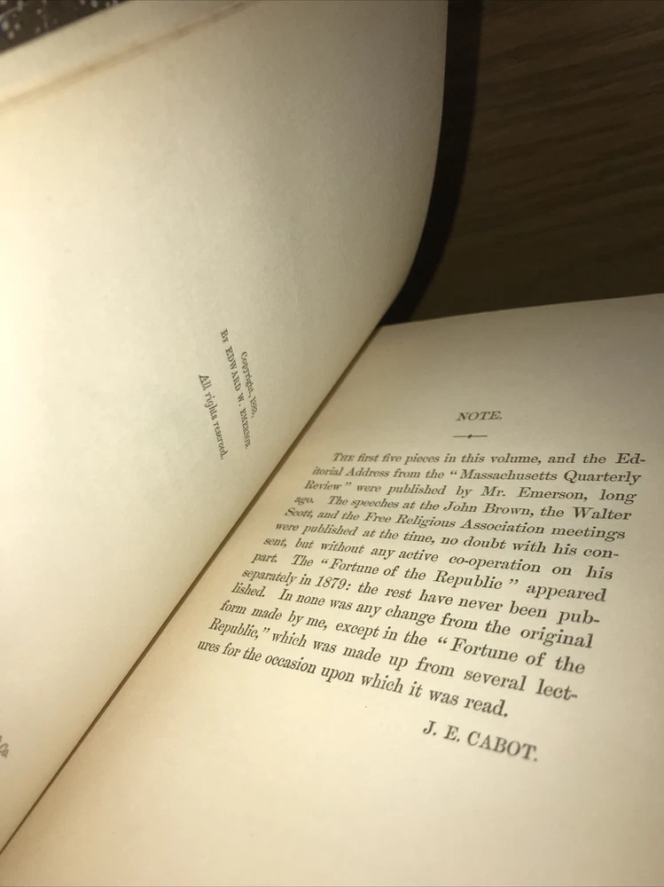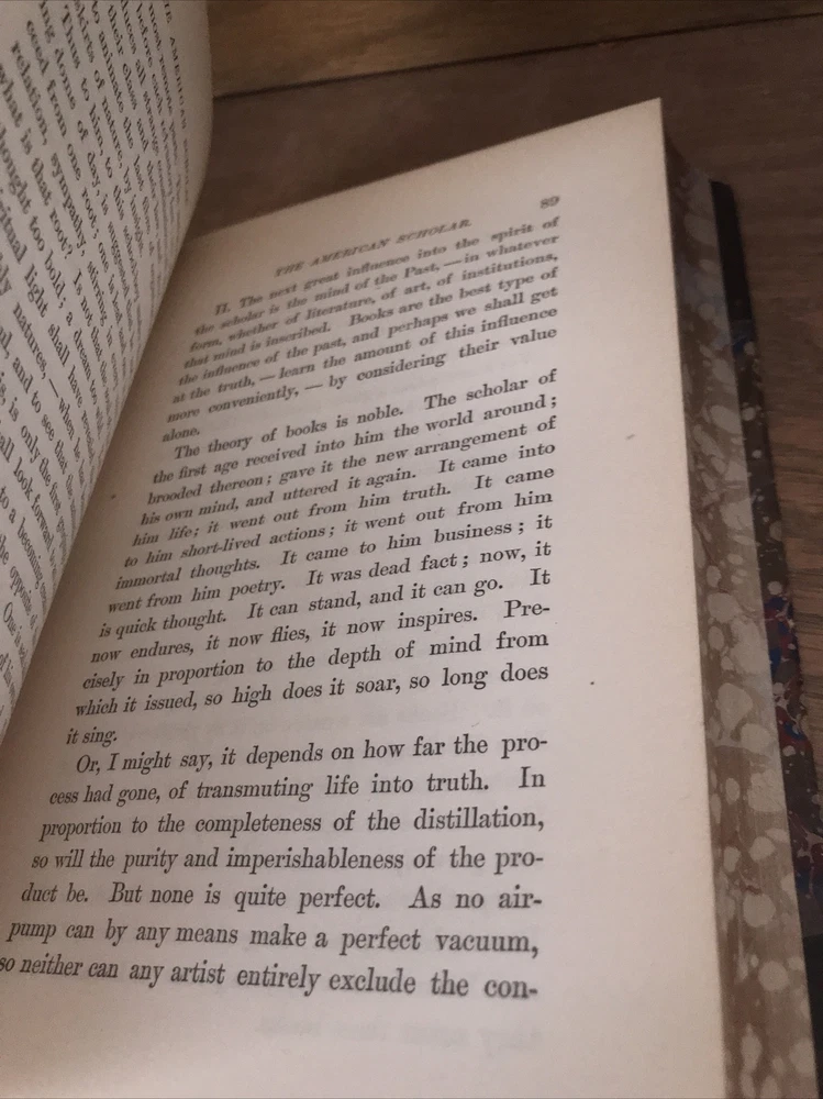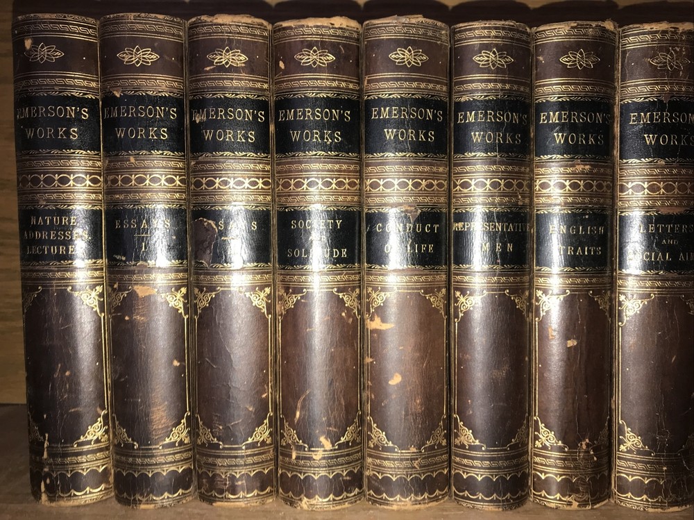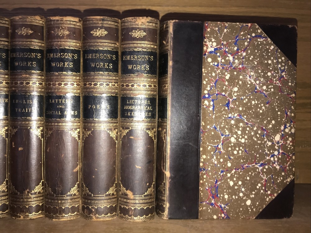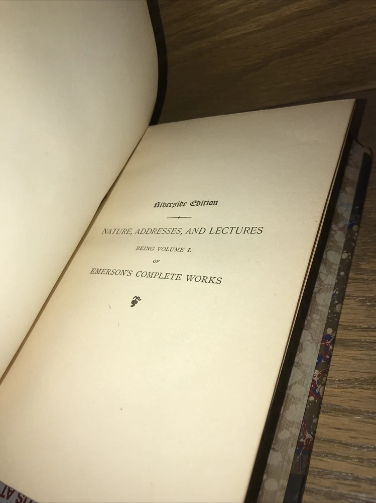 Complete in 11 volumes. Printed in 1884. 1884 is extremely early for Emerson. Set is dated 1884 on the title pages. Presumably the first edition of the Riverside Edition by Houghton Mifflin. Copyright 1883, title pages dated 1884. Thus set was reprinted into the early 1900’s. It’s extremely difficult to find Emerson from 1883. Set is remarkably well preserved. Internally the paper is fresh bright and clean. Set looks unread. The bindings have extremity abrasions and scuffs. Some gouges and scuffs in the spines and head caps. Leather supple. Hinges all sound. Each book will be individually wrapped and well protected for shipping via Priority Mail. Set has extremity abrasions as shown in the pictures. Wear at spine heads. The half titles list each volume number. The miscellanies is volume 11. 11 is standard for early Emerson. Set is complete. The bindings are original. Set has 2 old bookplates. Quality paper. The bindings are the original Victorian hindings. The bindings are original. 8 inches tall. Each book will be individually wrapped for shipping. 2022.03.10