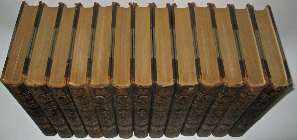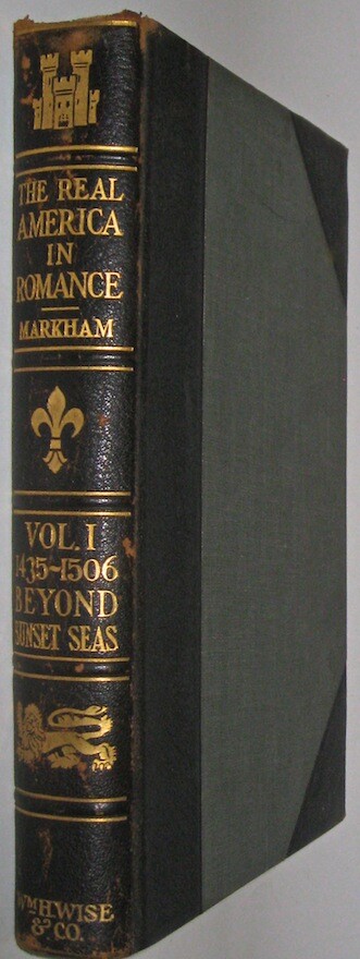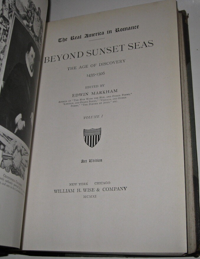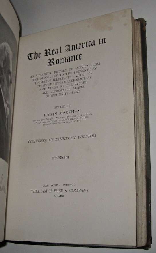 THE HISTORY OF THE UNITED STATES OF AMERICA! The Real America In Romance. Complete in 13 large and extremely heavy volumes. By Edwin Markham. ___________ Edwin Mark ham (born Charles Edward Anson Markham April 23, 1852 – March 7, 1940) was an American poet. From 1923 to 1931 he was Poet Laureate of Oregon. In 1922, Markham's poem "Lincoln, the Man of the People" was selected from 250 entries to be read at the dedication of the Lincoln Memorial . The author himself read the poem. Of it, Dr. Henry Van Dyke of Princeton said, "Edwin Markham's Lincoln is the greatest poem ever written on the immortal martyr, and the greatest that ever will be written." [The HISTORY OF AMERICA] The Real America In Romance An Authentic View Of The History Of America From The Discovery To The Present Day; Complete in 13-volumes, as stated on the title pages. Profusely Illustrated With Portraits Of Historical Characters And Views Of The Sacred And Memorable Places Of Our Native Land. Printed in 1911. This set is well over 100 Years Old! This is the Art Edition. Bound in thick quality moroccan leather bindings. This is an exceptionally heavy set. Very durable and heavy books, bound in thick leather, with the Publisher's reinforced hinges to withstand their bulk. The top edges are gilded. Marbled end papers. 9 5/8 inches tall, these are very large books. These take up 18 inches of shelf space. These display beautifully, with their ornately gilded spines and raised hubs. The spines are armorially embossed with a gilded: Castle, Fleur-de-lys, and Lion! [History of America.] Markham, Edwin. THE REAL AMERICA IN ROMANCE. An Authentic History of America From The Discovery To The Present Day. Profusely illustrated with portraits of historical characters and views of the sacred and memorable places of our native land. Bound in leather. Gilding on spine featuring a lion, castle, and fleur-de-lys. Top edges gilded. Marbled end-papers. These are large, heavy books at 9 1/2''. COMPLETE in thirteen volumes, as stated on title page. William H. Wise & Company, New York. 1911. In Very Good condition overall, with some wear to the spines as shown in the picture. Some abrasions and wear, some wear at the head of volume twelve. Hinges strongly attached and sound. Some general rubbing. Interior shows some foxing. Bright pages. Early name in pencil on blank end-paper, easily erased. Bound in quality morocco. Art Edition. Each volume contains a frontis and many detailed illustrations. A comprehensive history of America. Titles; Vol. I 1434 - 1506 Vol. II 1506-1547 Vol. III 1547-1570 Vol. IV 1570 - 1620 Vol. V 1620-1643 Vol. VI 1643-1680 Vol. VII 1680-1700 Vol. VIII 1700-1763 Vol. IX 1763-1783 Vol. X 1783-1824 Vol. XI 1824-1854 Vol. XII 1854-1868 Vol. XIII 1868-1910 This is a gorgeous antiquarian set. This set has been in archival storage since 2005 and still requires additional verification of condition. This is the ART EDITION, and is an incredibly high quality set. This is a massive set. These are very large and heavy books. These books measure almost 10 inches tall! # 1899 OOT REV QL [3516I] The Real America in Romance: Complete in Thirteen Volumes - An Authentic History of America from the Discovery to the Present Day, 1435-1910. Profusely Illustrated with Portraits of Historical Characters and Views of the Sacred and Memorable Places etc. By Markham, Edwin Edwin Markham From Wikipedia, the free encyclopedia Jump to navigation Jump to search For the British general, see Edwin Markham (British Army officer) . Edwin Markham Born April 23, 1852 Oregon City, Oregon Died March 7, 1940 (aged 87) Staten Island Occupation Poet Nationality American Signature Edwin Markham (born Charles Edward Anson Markham April 23, 1852 – March 7, 1940) was an American poet. From 1923 to 1931 he was Poet Laureate of Oregon. [1] Contents 1 Life 2 Career 3 Legacy 4 Bibliography 5 Footnotes 6 Further reading 7 External links Edwin Markham was born in Oregon City, Oregon , and was the youngest of 10 children; his parents divorced shortly after his birth. At the age of four, he moved to Lagoon Valley, an area northeast of San Francisco; there, he lived with his sister and mother. He worked on the family's farm beginning at twelve. Although his mother was opposed to his pursuing higher education, he studied literature at the California College in Vacaville, California , and received his teacher's certificate in 1870. In 1872 he graduated from San Jose State Normal School and in 1873 finished his studies of classics at Christian College in Santa Rosa . He went by "Charles" until about 1895, when he was about 43, when he started using "Edwin." [2] In 1898, Markham married his third wife, Anna Catherine Murphy (1859–1938), and in 1899 their son Virgil Markham was born. They moved to Rio de Janeiro in 1900 to study natives and their appeasement, then to New York City, where they lived in Brooklyn and then Staten Island . Edwin Markham had, by the time of his death, amassed a huge library of 15000+ books. This collection was bequeathed to Wagner College 's Horrmann Library, located on Staten Island. Markham also willed his personal papers to the library. Edwin's correspondents included Franklin D. Roosevelt , Ambrose Bierce , Aleister Crowley , [3] Jack and Charmian [4] London, Carl Sandburg , Florence Earle Coates [5] and Amy Lowell . L'homme à la houe by Jean-François Millet Markham taught literature in El Dorado County until 1879, when he became education superintendent of the county . While residing in El Dorado County, Markham became a member of Placerville Masonic Lodge . He also accepted a job as principal of Tompkins Observation School in Oakland, California , in 1890. While in Oakland, he became well acquainted with many other famous contemporary writers and poets, such as Joaquin Miller , Ina Coolbrith , Charles Warren Stoddard , and Edmund Clarence Stedman . Edwin Markham's most famous poem, "The Man with the Hoe," which accented laborers' hardship