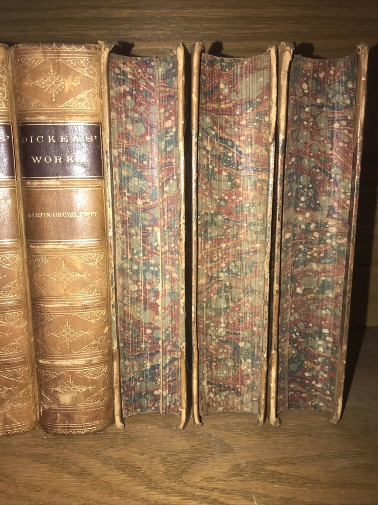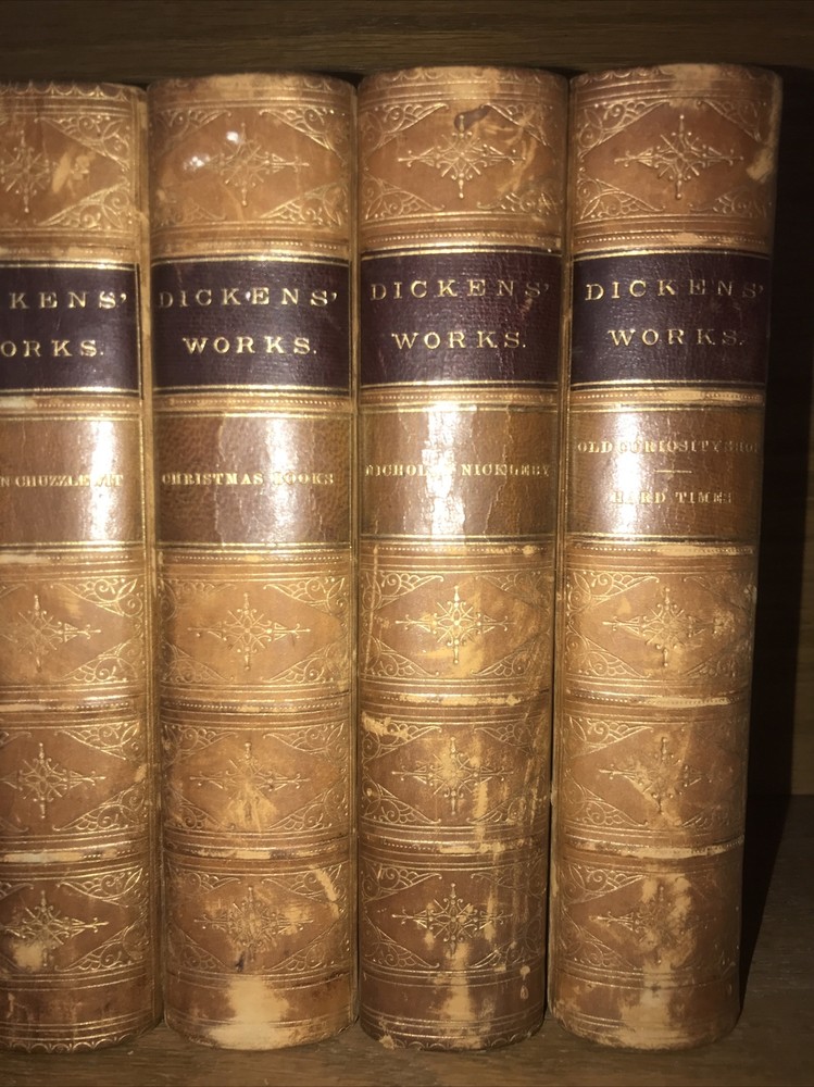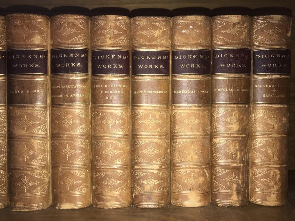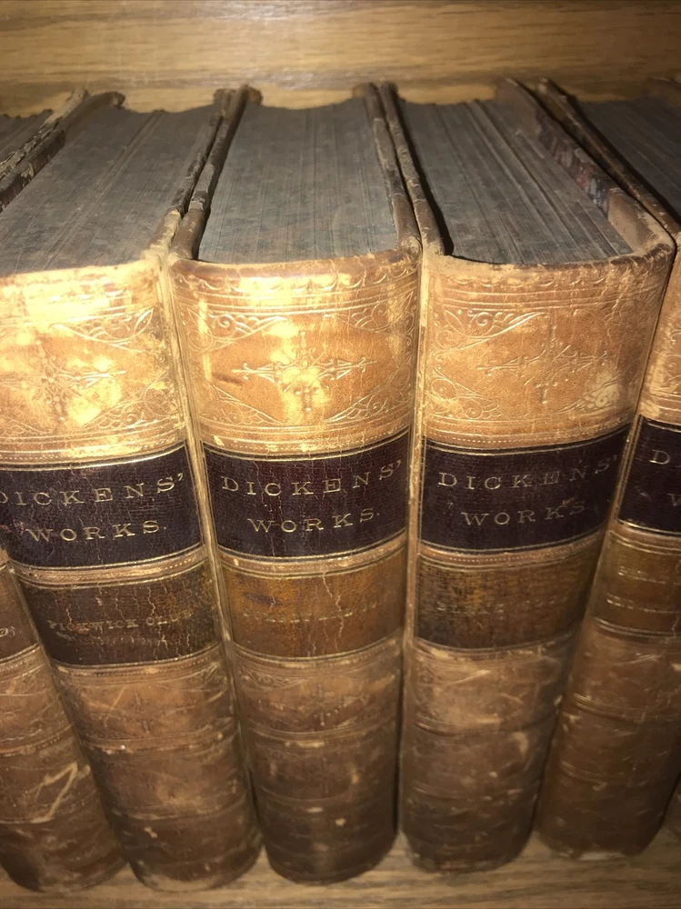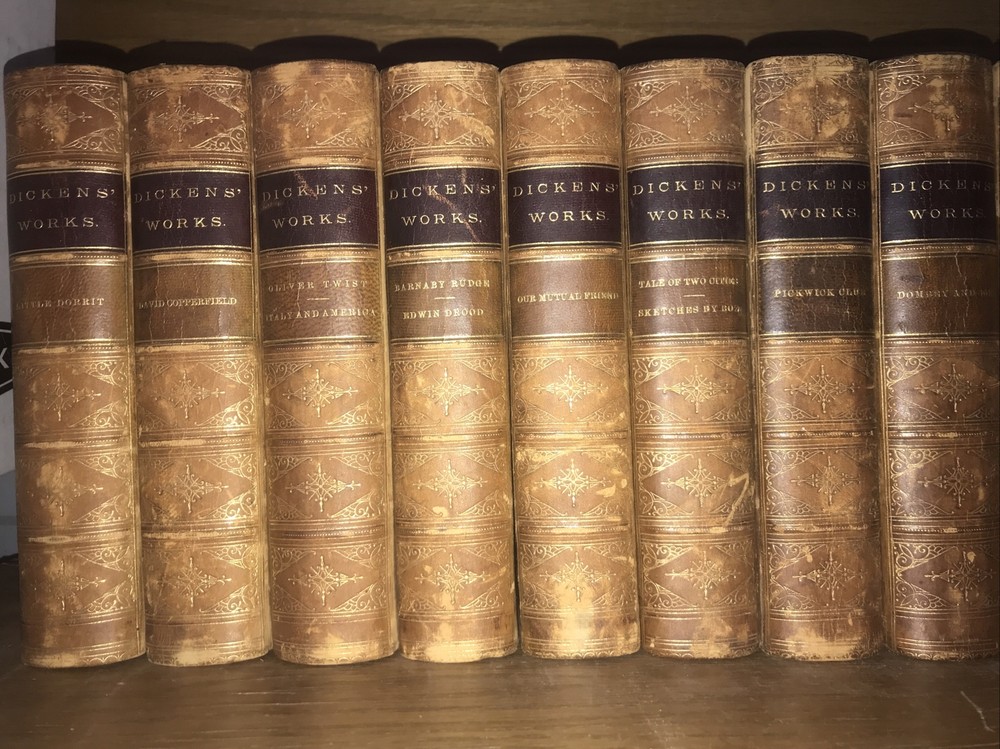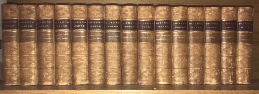 THE WORKS OF CHARLES DICKENS. Complete in 15 volumes. This is an original Victorian set of Dickens. The bindings are original. Bound in leather. Set is not dated. The bindings and the publisher are late Victorian era. Quality leather. Set is extremely well preserved despite the age. A lot of shelf abrasions to the spines and extremities. All hinges sound. Leather supple despite being over 100 years old. The main wear is the shelf abrasions. The paper is higher grade than many late Victorian bindings. Some browning. This set is illustrated. Set has scuffs and abrasions. Still a sound Victorian set of Dickens in the original gilded calf leather. Approximately 8 inches tall. Slightly taller than average. Many sets from this era are only 7-7.5 inches tall. This would make an excellent gift. Each book will be individually wrapped and well protected for shipping. 22.03.10