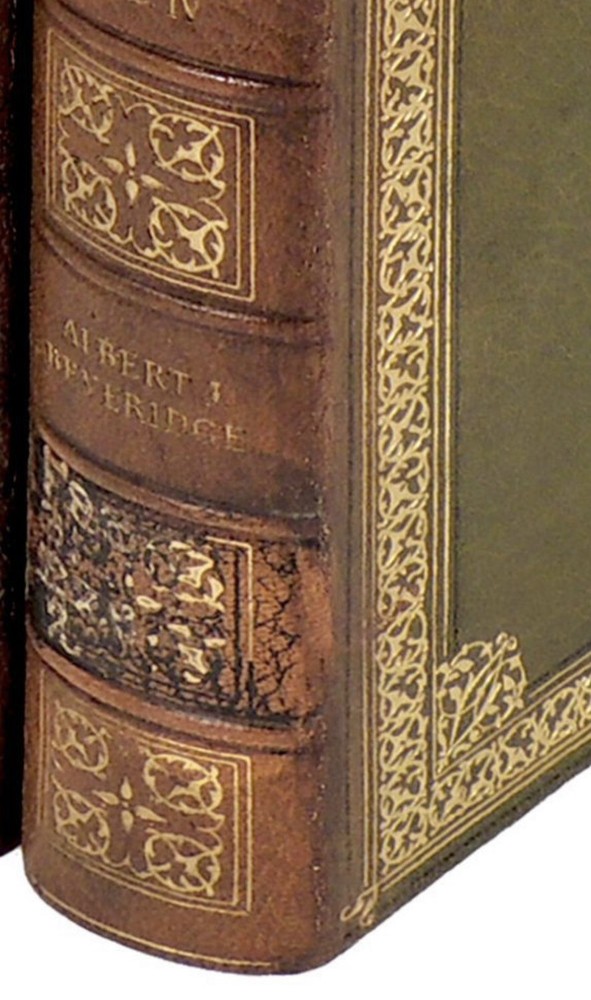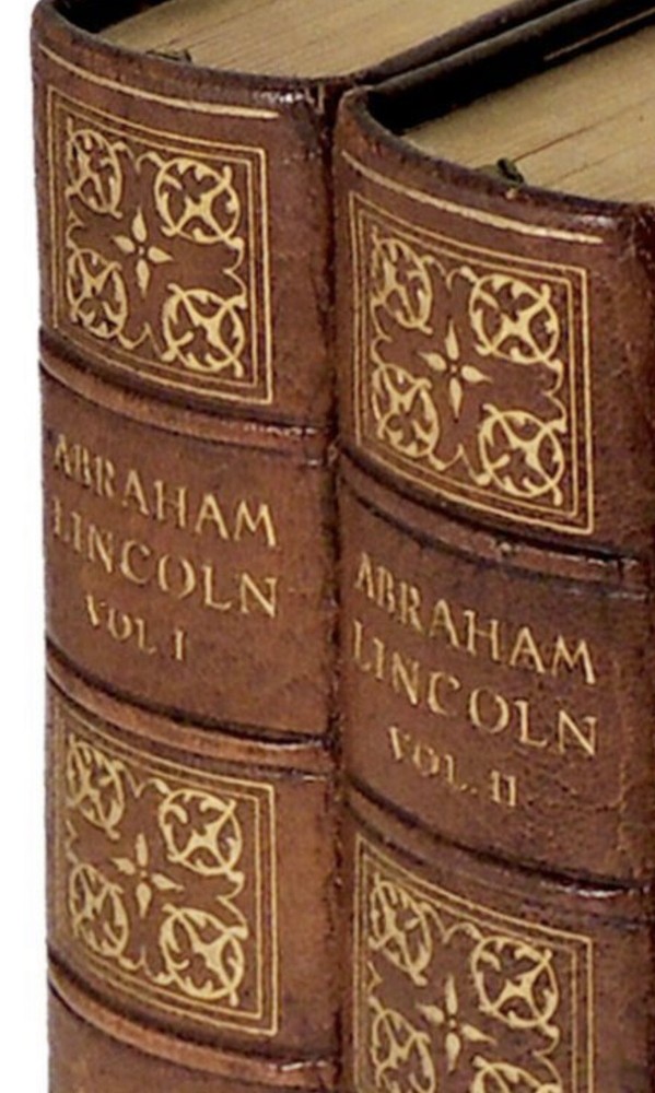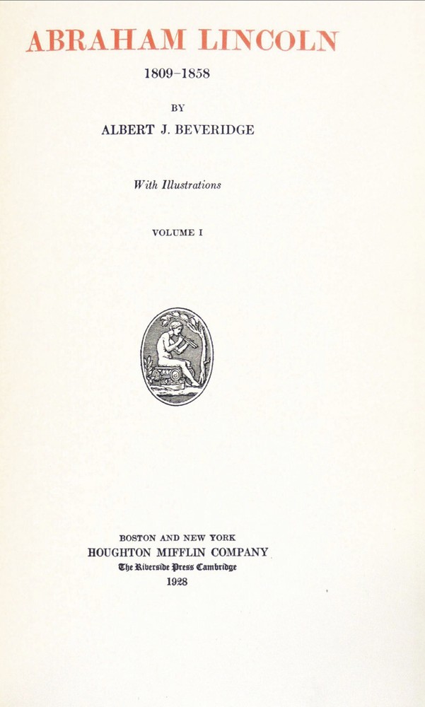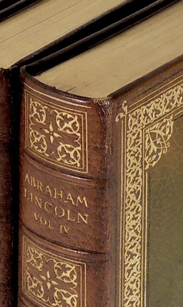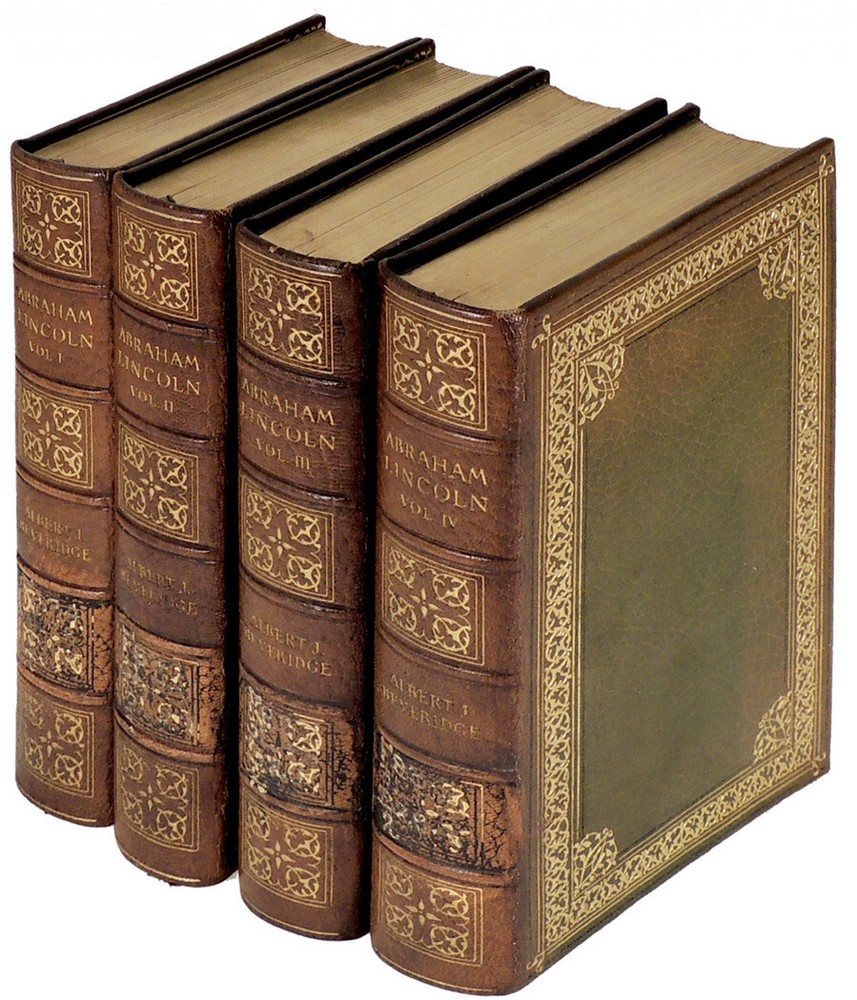MANUSCRIPT EDITION. This is set #4. Number 4 of the 1000 copies of the Manuscript Edition. Bound in full leather. Full leather end papers. These full leather bindings are original, and are only found on the first several sets. Set number 4 is extremely early. These are large heavy books, measuring 10 inches tall. This is a gorgeous set. Complete in 4 volumes. In very good condition despite the age. The bindings are original. MANUSCRIPT EDITION. Printed in 1928. Complete in 4 Volumes. Volume I contains a handwritten page of Beveridge's original manuscript. Abraham Lincoln 1809-1858 Complete in Four Volumes. By Beveridge, Albert J Boston and New York: Houghton Mifflin Company, 1928. Very Good. Number 4 of the 1000 copies of the Manuscript Edition, printed at the Riverside Press in Cambridge, MA. The preface describes the rigorous and painstaking research conducted by the author for the book. Albert Jeremiah Beveridge (1862 - 1927) was an American historian and US senator from Indiana. He was an intellectual leader of the Progressive Era and a biographer of Chief Justice John Marshall and President Abraham Lincoln. As his political career was coming to a close in 1922, Beveridge dedicated his time to writing historical literature. His four-volume set The Life of John Marshall, published in 1916-1919, won Beveridge a Pulitzer Prize for Biography or Autobiography and connected events in John Marshall's life with his later rulings on the US Supreme Court. Beveridge spent most of his final years writing a four-volume biography of Abraham Lincoln, but it was only half-finished at his death and posthumously published in 1928 as Abraham Lincoln, 1809-1858. It stripped away the myths and revealed a complex and imperfect politician [Wikipedia]. Beautifully bound in full leather with elaborate gilt tooling to covers and gilt titling and ornaments to spines. The spines have darkened and there are some remnants of a call number having been printed at the spine base. There are no indications that this is ex-library. Some scuffing along bottom edges of covers. The volumes also have some fading along edges. Volume I has light stain on front cover. Top edges gilt. Other edges not trimmed. Volume IV has small tears along fore-edges of pages 313-316 where book was poorly opened. The volumes have beautiful green and red leather doublures with gilt designs and rulings. The front doublures have a few light marks while the rear ones are near fine. The free endpapers facing the doublures are covered in grey silk. The back of the silk covered page in Volume I has small tears along gutter. Text pages are clean and bright. With 36 illustrations plus four color frontispieces with Washington DC scenes. Volume I has a page from Beveridge's original manuscript tipped in. A lovely set of this important biography in very good condition. Volume I: xxvi, 297 pages; Volume II: 310 pages; Volume III: 361 pages; Volume IV: 381 pages including index. In highly giftable condition. This set will be well protected for shipping. Each book will be individually wrapped and well protected for shipping. 2022.08