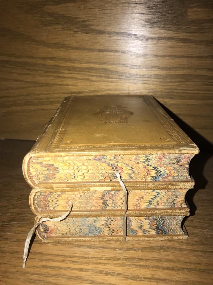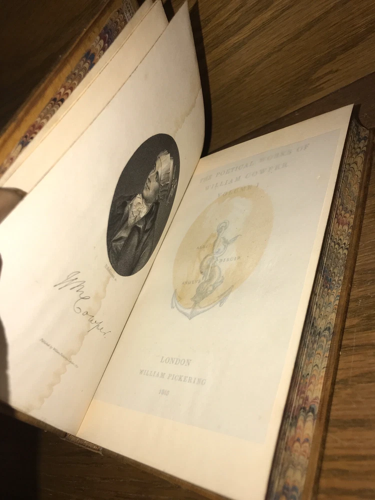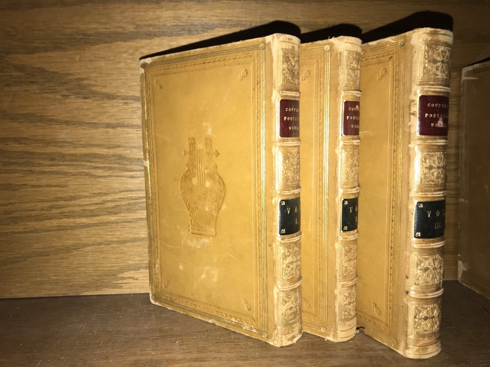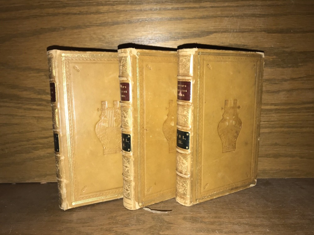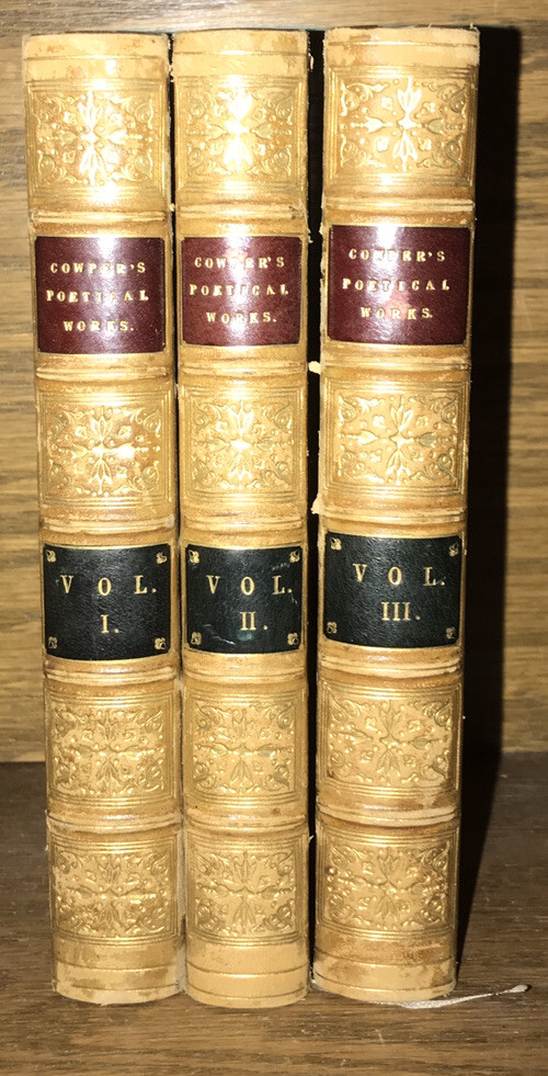 The complete works of Cowper. Complete in 3 volumes. Printed in 184 3 . The bindings are original. Bound in full calf leather. Leather is still supple and fresh. Quality rag paper. In very good condition. Quality paper. These are the original bindings. Full calf leather. Intricate lyre motif. Set is in remarkable condition. In highly giftable condition. This would make an excellent gift. In remarkable condition. Despite the sheer age. Especially for being over 150 years old. Leather supple. Hinges sound. Some light generalized wear. Light wear as shown in the pictures. Quality paper. Approximately 7 inches tall. This will be well protected for shipping via Priority Mail. 2022.04.04 .17 h sngls tl