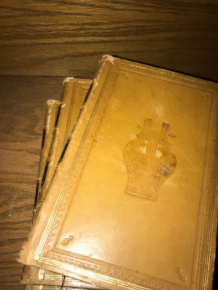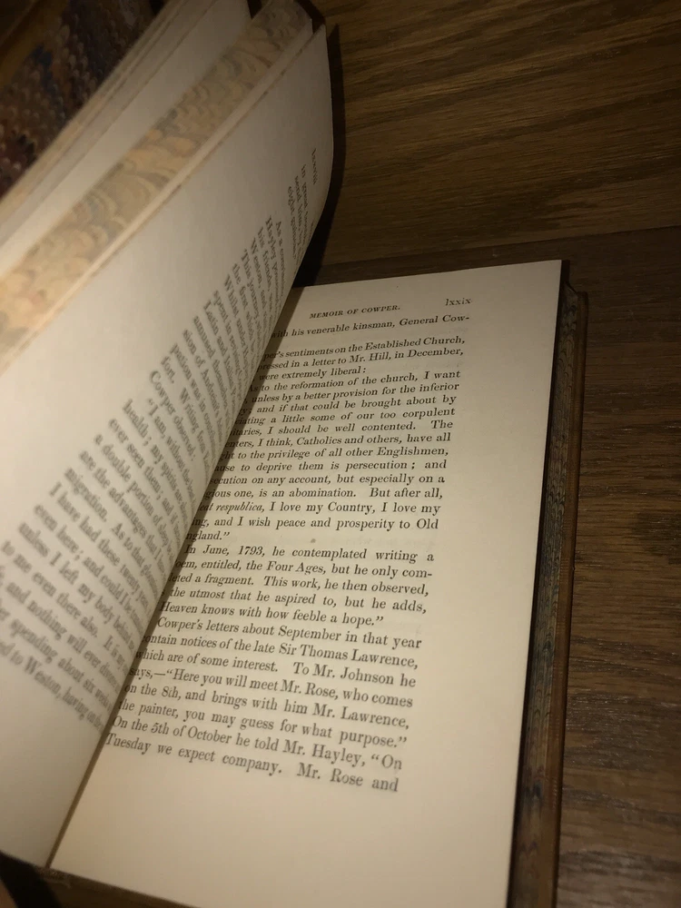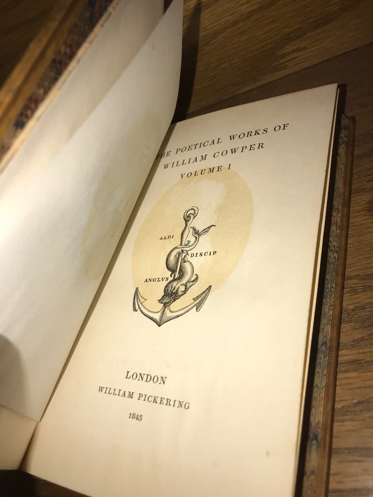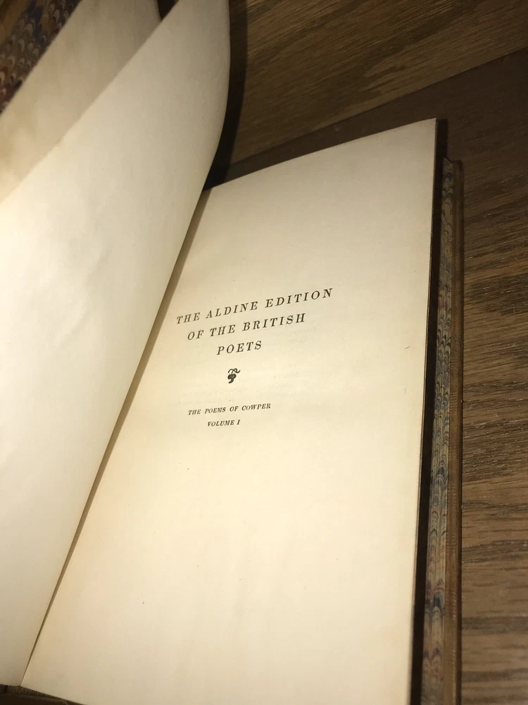 The complete works of Cowper. Complete in 3 volumes. Printed in 184 3 . The bindings are original. Bound in full calf leather. Leather is still supple and fresh. Quality rag paper. In very good condition. Quality paper. These are the original bindings. Full calf leather. Intricate lyre motif. Set is in remarkable condition. In highly giftable condition. This would make an excellent gift. In remarkable condition. Despite the sheer age. Especially for being over 150 years old. Leather supple. Hinges sound. Some light generalized wear. Light wear as shown in the pictures. Quality paper. Approximately 7 inches tall. This will be well protected for shipping via Priority Mail. 2022.04.04 .17 h sngls tl