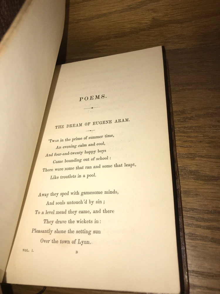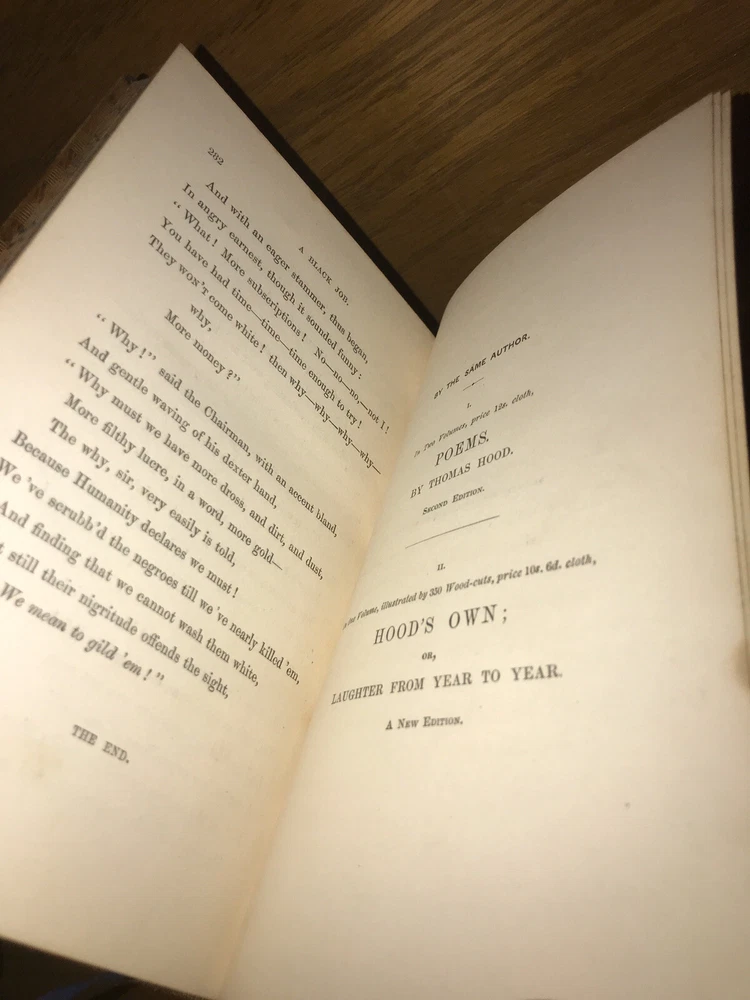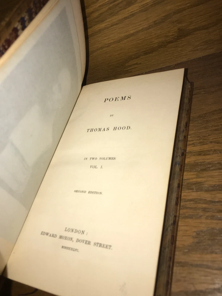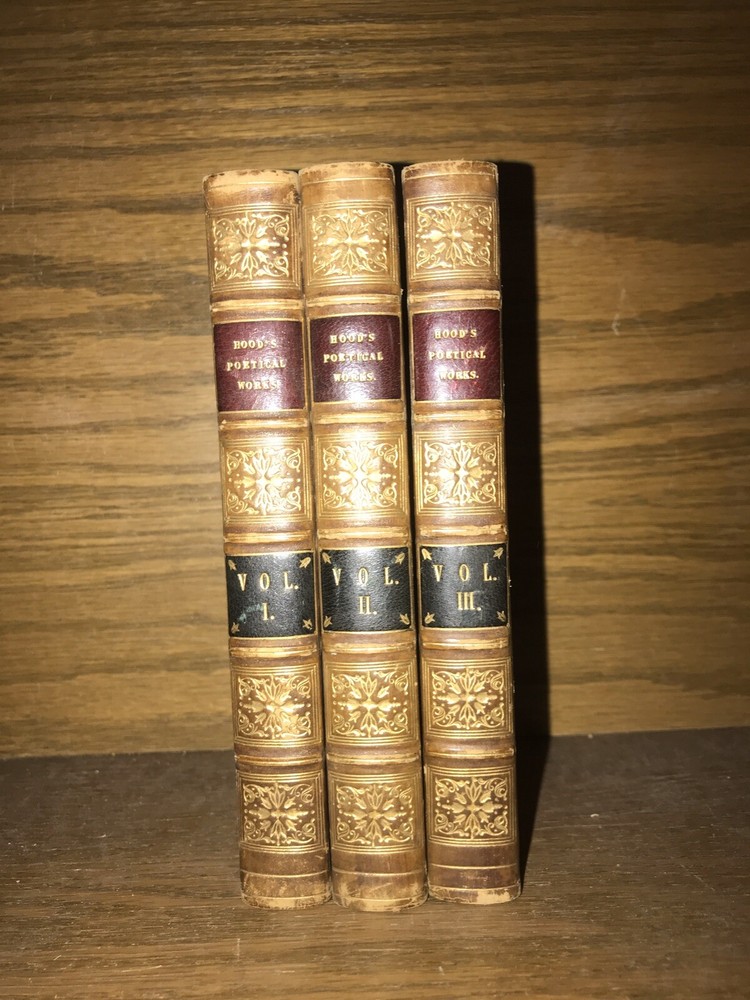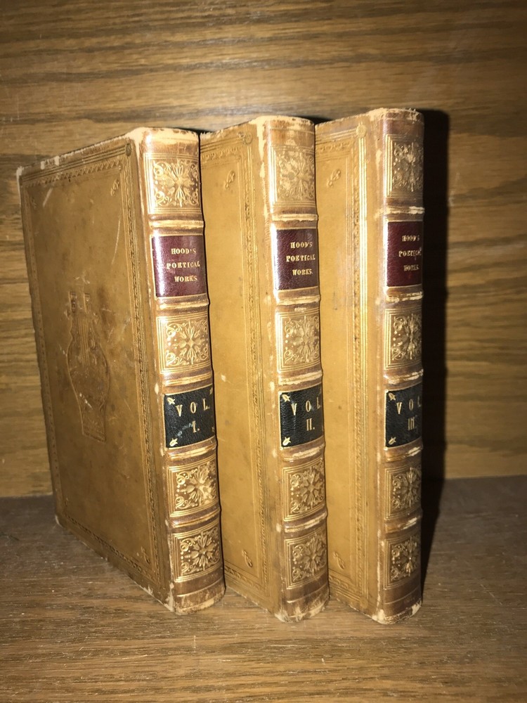 The complete works of H ood . Complete in 3 volumes. Printed in 18 46. The bindings are original. Bound in full calf leather. Leather is still supple and fresh. Quality rag paper. In very good condition. Quality paper. These are the original bindings. Full calf leather. Intricate lyre motif. Set is in remarkable condition. In highly giftable condition. This would make an excellent gift. In remarkable condition. Despite the sheer age. Especially for being over 150 years old. Leather supple. Hinges sound. Some light generalized wear. Light wear as shown in the pictures. Quality paper. Approximately 7 inches tall. This will be well protected for shipping via Priority Mail. 2022.04.04 .17 h sngls tl