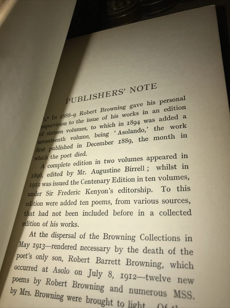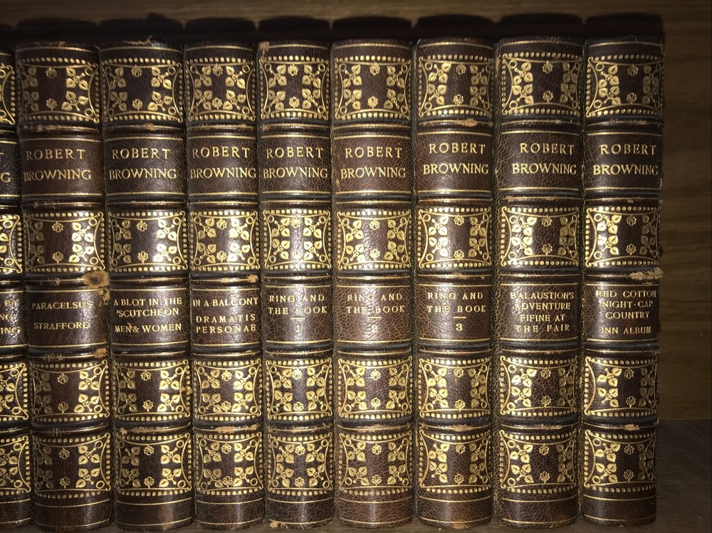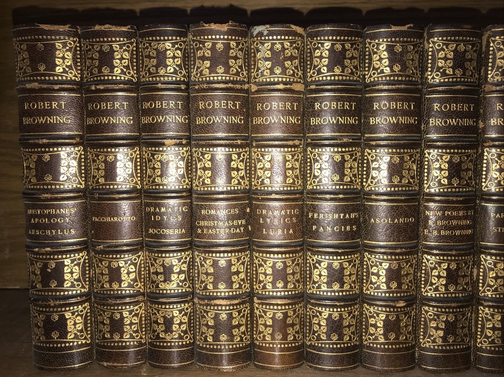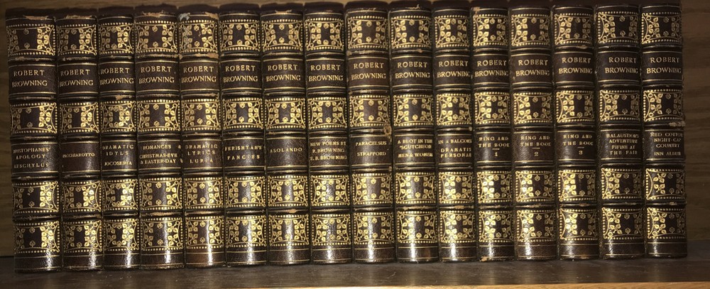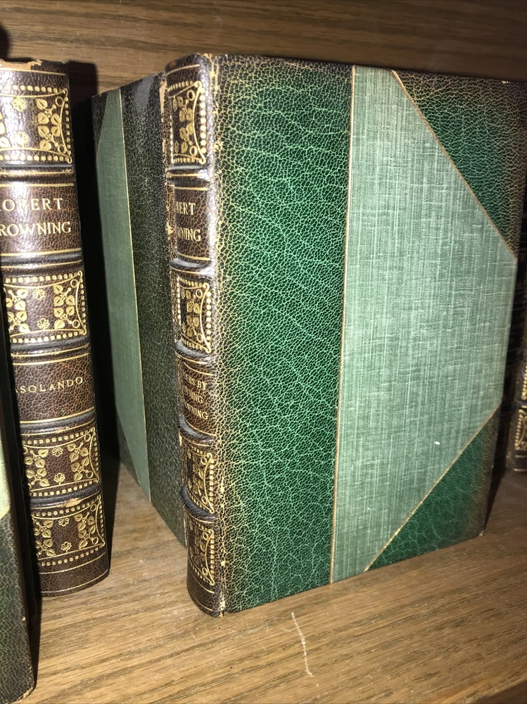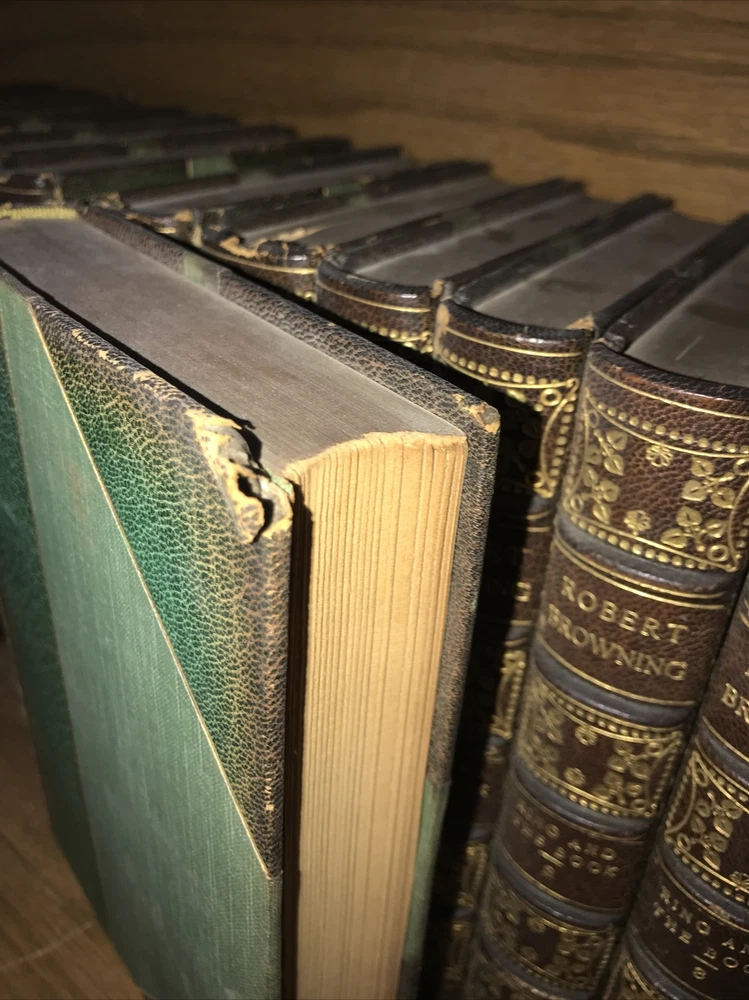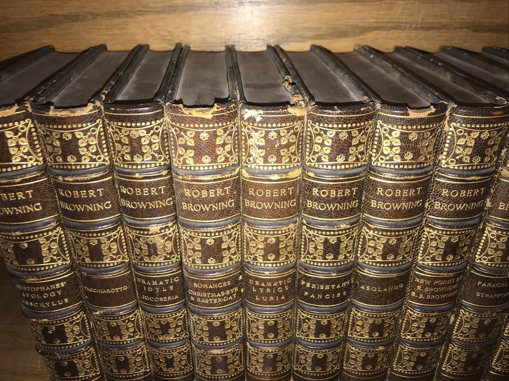 Bindings are original. High grade leather and paper. Some micro headcap chipping. Hinges sound. Quality rag paper. Set is printed in 1889. The final volume with the new poetry is dated 1914. Some dates may vary. Probably not complete. Set does not indicate completeness. Preface indicates 18 volumes. Set is presumed incomplete. Set appears to be missing two volumes: Preface is indicating that set was originally comprised in 16 volumes, with Asolando and New Poems added as volumes 17, and 18. The final volume with the new poetry is dated 1914. (The new poems also include Elizabeth Barrett Browning. ) Each book will be individually wrapped and well protected for shipping. International shipping via Priority Mail International. 2022.03.23h